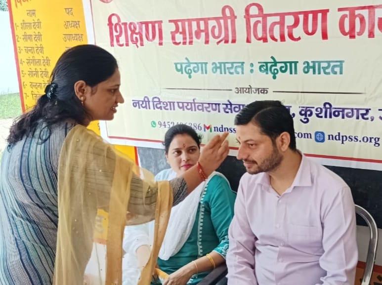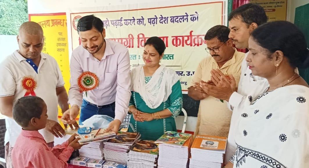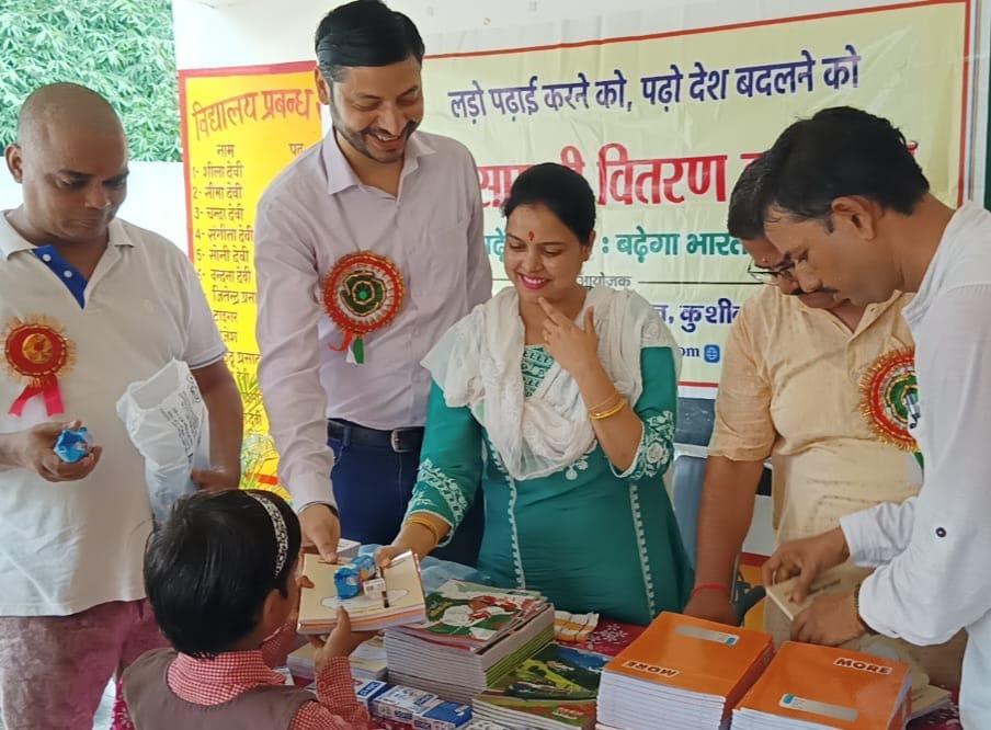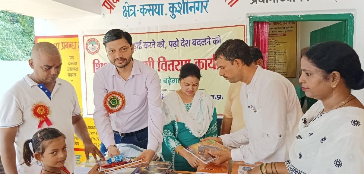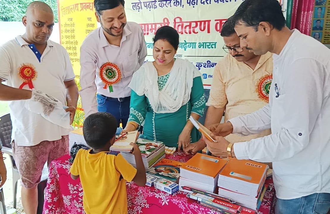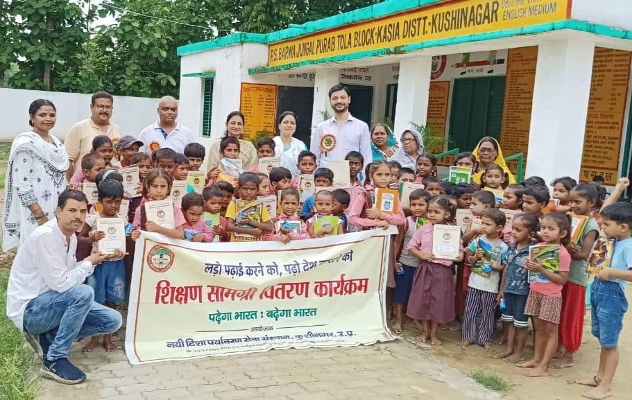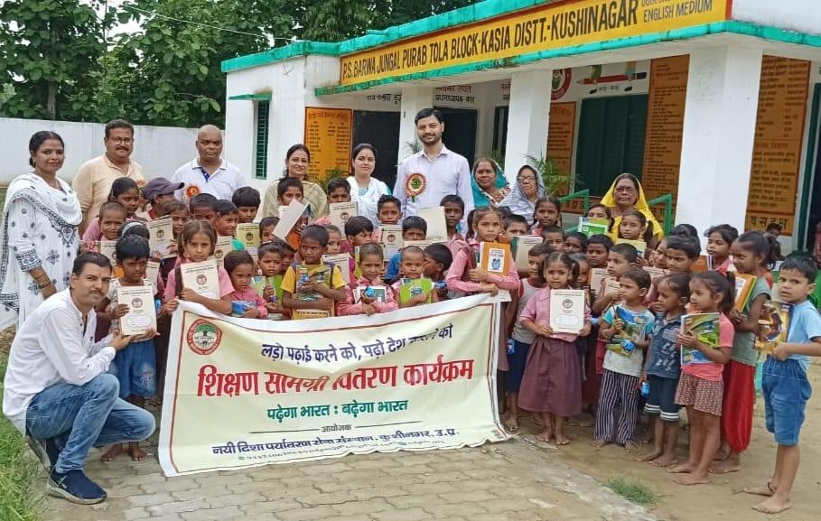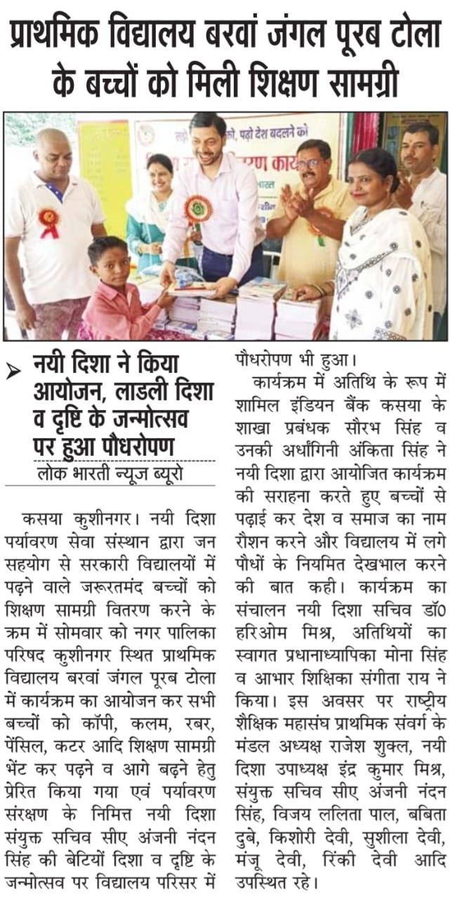 संस्थान द्वारा जन सहयोग से सरकारी विद्यालयों में पढ़ने वाले जरूरतमंद बच्चों को शिक्षण सामग्री वितरण करने के क्रम में नगर पालिका परिषद कुशीनगर स्थित प्राथमिक विद्यालय बरवां जंगल पूरब टोला में कार्यक्रम का आयोजन कर सभी बच्चों को कॉपी, कलम, रबर, पेंसिल, कटर आदि शिक्षण सामग्री भेंट कर पढ़ने व आगे बढ़ने हेतु प्रेरित किया गया एवं पर्यावरण संरक्षण के निमित्त नयी दिशा संयुक्त सचिव सीए श्री अंजनी नंदन सिंह की बेटियों दिशा व दृष्टि के जन्मोत्सव पर विद्यालय परिसर में पौधरोपण भी हुआ।