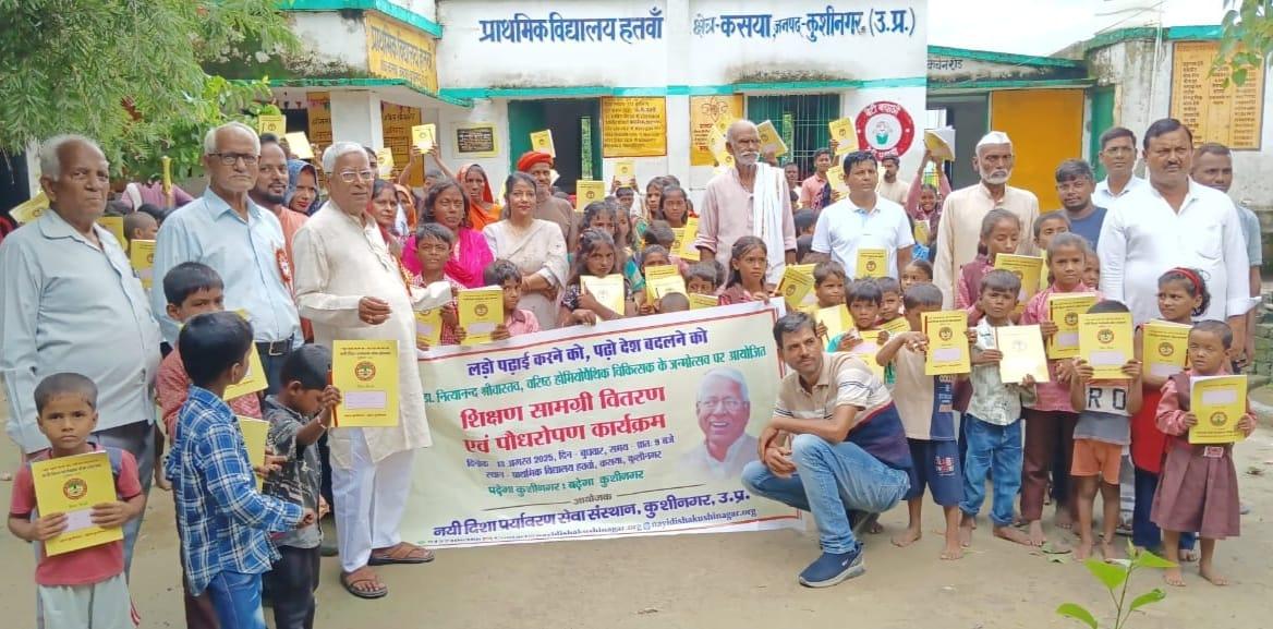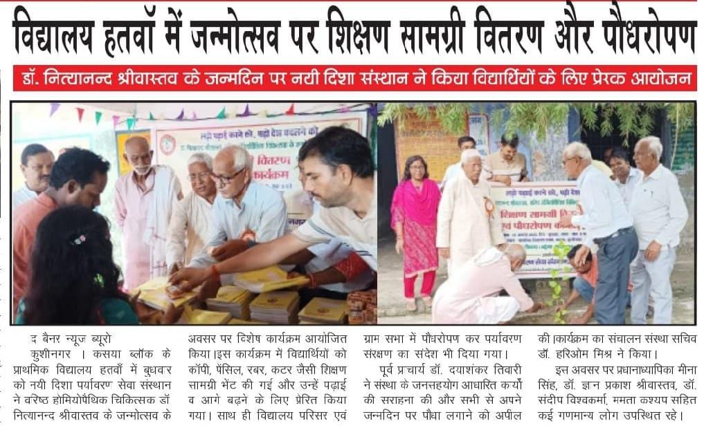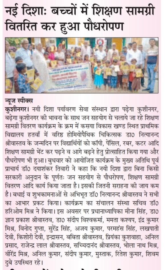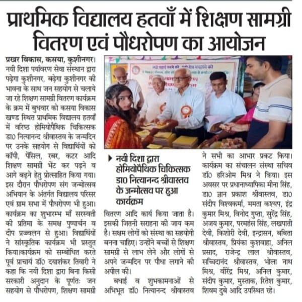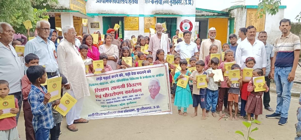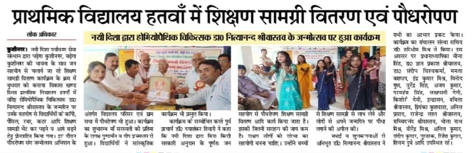 संस्थान द्वारा पढ़ेगा कुशीनगर, बढ़ेगा कुशीनगर की भावना के साथ जन सहयोग से चलाये जा रहे शिक्षण सामग्री वितरण कार्यक्रम के क्रम में कसया विकास खण्ड स्थित प्राथमिक विद्यालय हतवाँ में वरिष्ठ होमियोपैथिक चिकित्सक डा0 नित्यानन्द श्रीवास्तव के जन्मदिन पर आपके सहयोग से विद्यार्थियों को कॉपी, पेंसिल, रबर, कटर आदि शिक्षण सामग्री भेंट कर पढ़ने व आगे बढ़ने हेतु प्रोत्साहित किया गया। इस दौरान पौधरोपण संग जन्मोत्सव अभियान के अंतर्गत विद्यालय परिसर एवं ग्राम सभा में पौधरोपण भी हुआ। बच्चियों ने सांस्कृतिक कार्यक्रम भी प्रस्तुत किया।