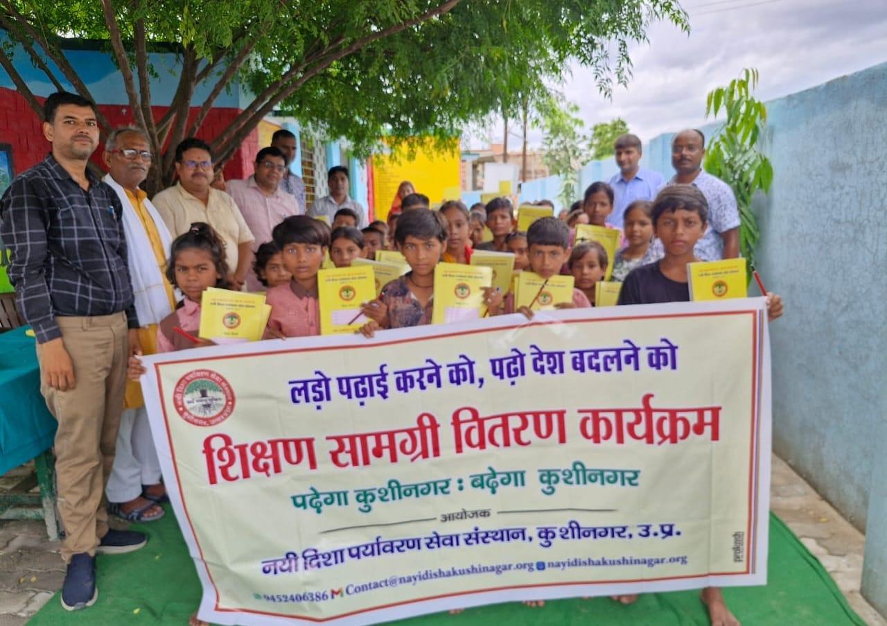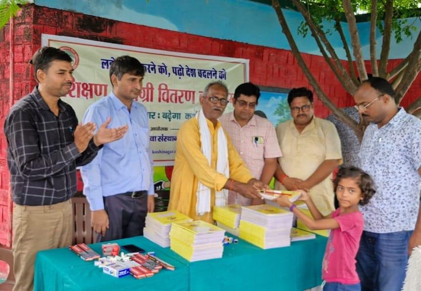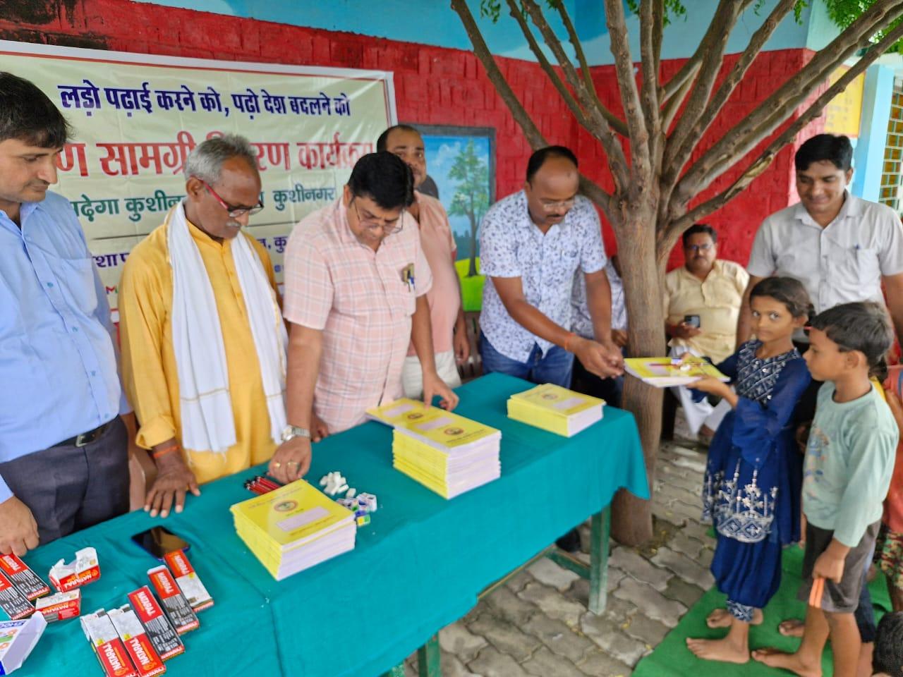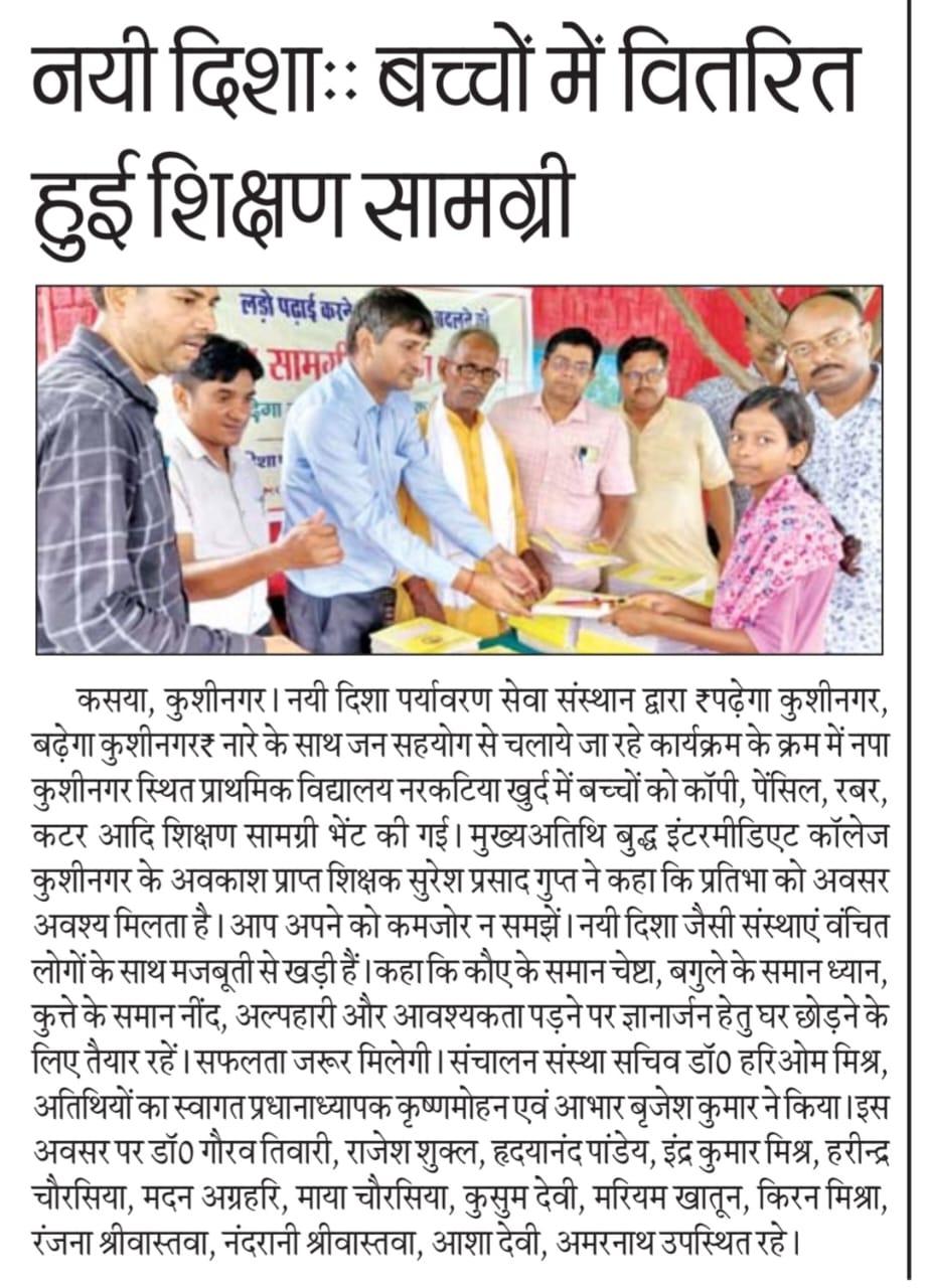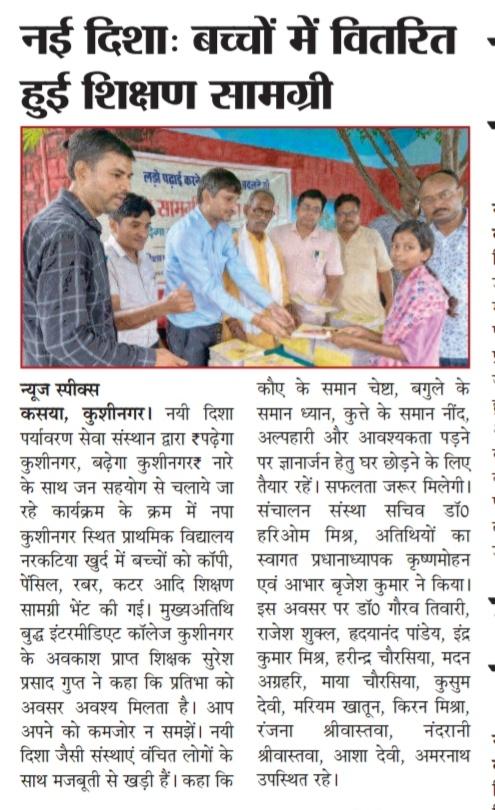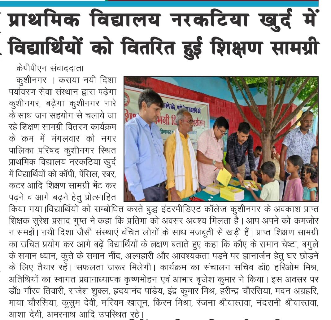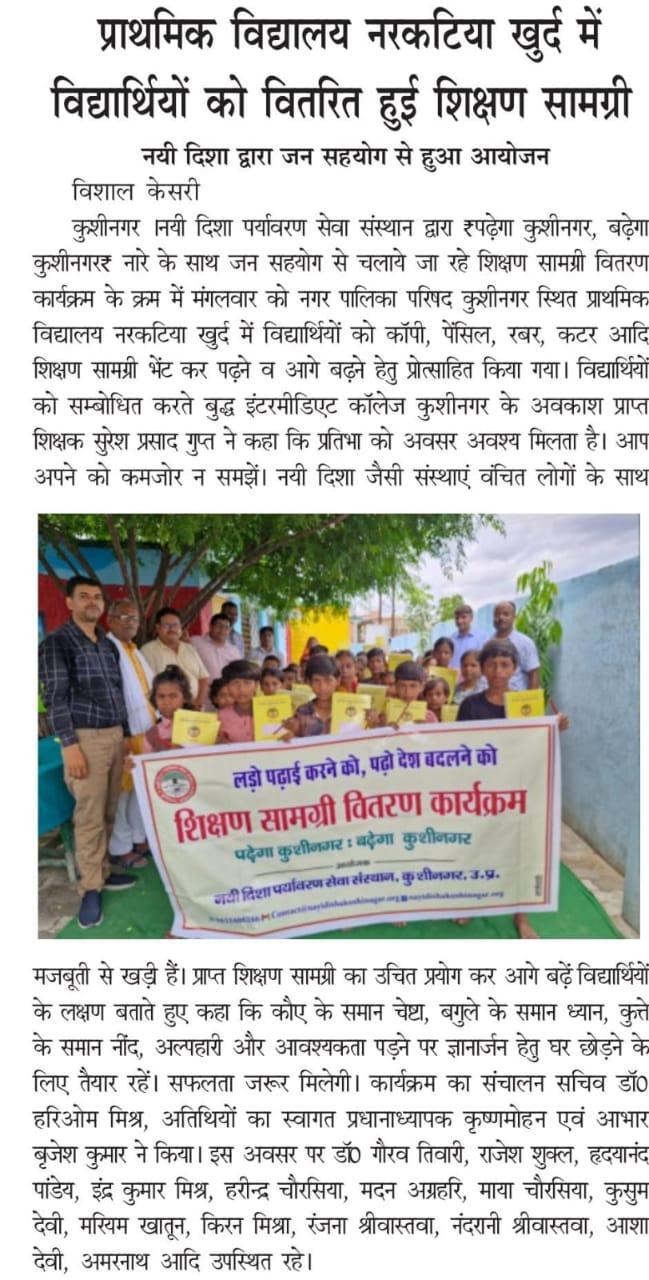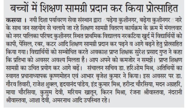 संस्थान द्वारा "पढ़ेगा कुशीनगर, बढ़ेगा कुशीनगर" की भावना के साथ जन सहयोग से चलाये जा रहे शिक्षण सामग्री वितरण कार्यक्रम के क्रम में नगर पालिका परिषद कुशीनगर स्थित प्राथमिक विद्यालय नरकटिया खुर्द में विद्यार्थियों को कॉपी, पेंसिल, रबर, कटर आदि शिक्षण सामग्री भेंट कर पढ़ने व आगे बढ़ने हेतु प्रोत्साहित किया गया।
