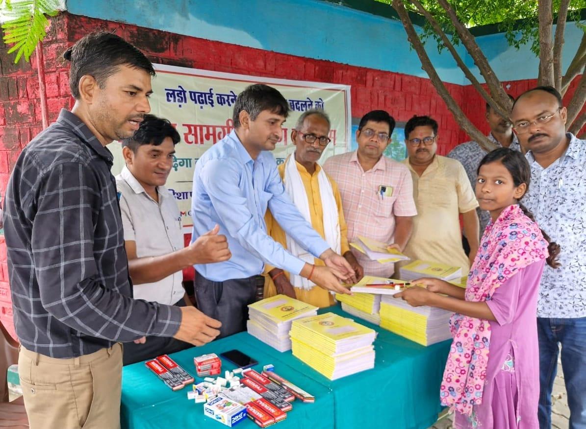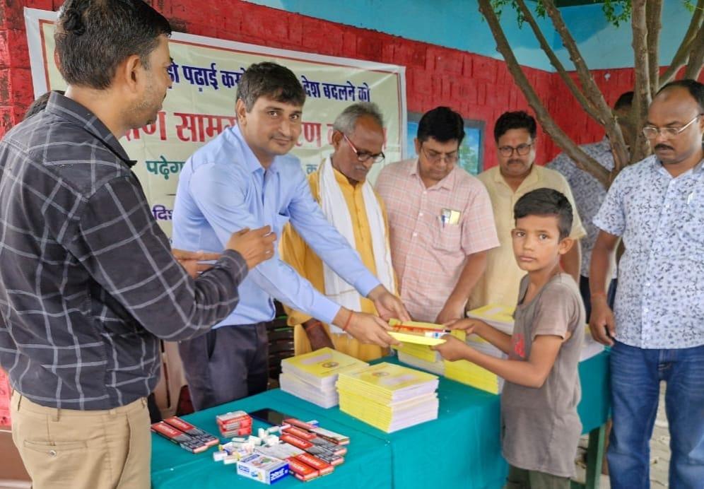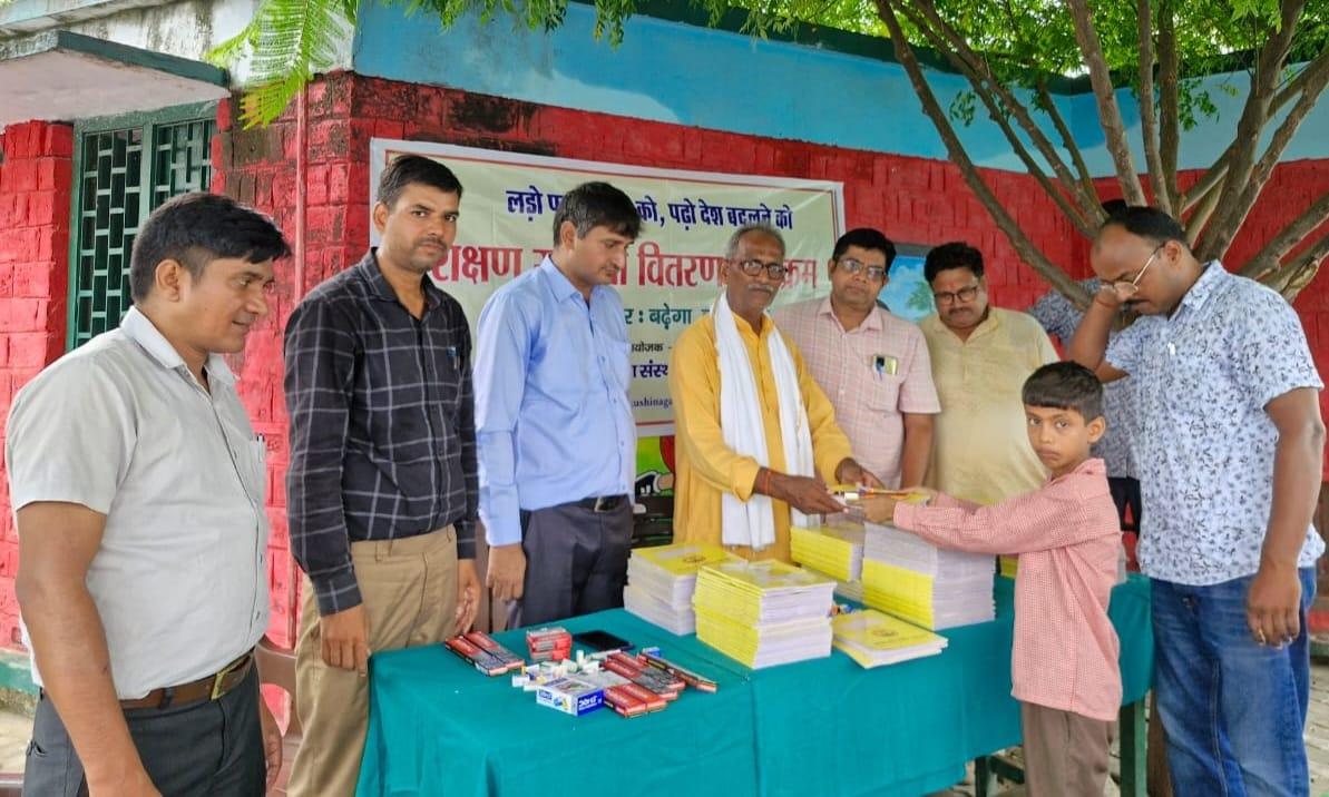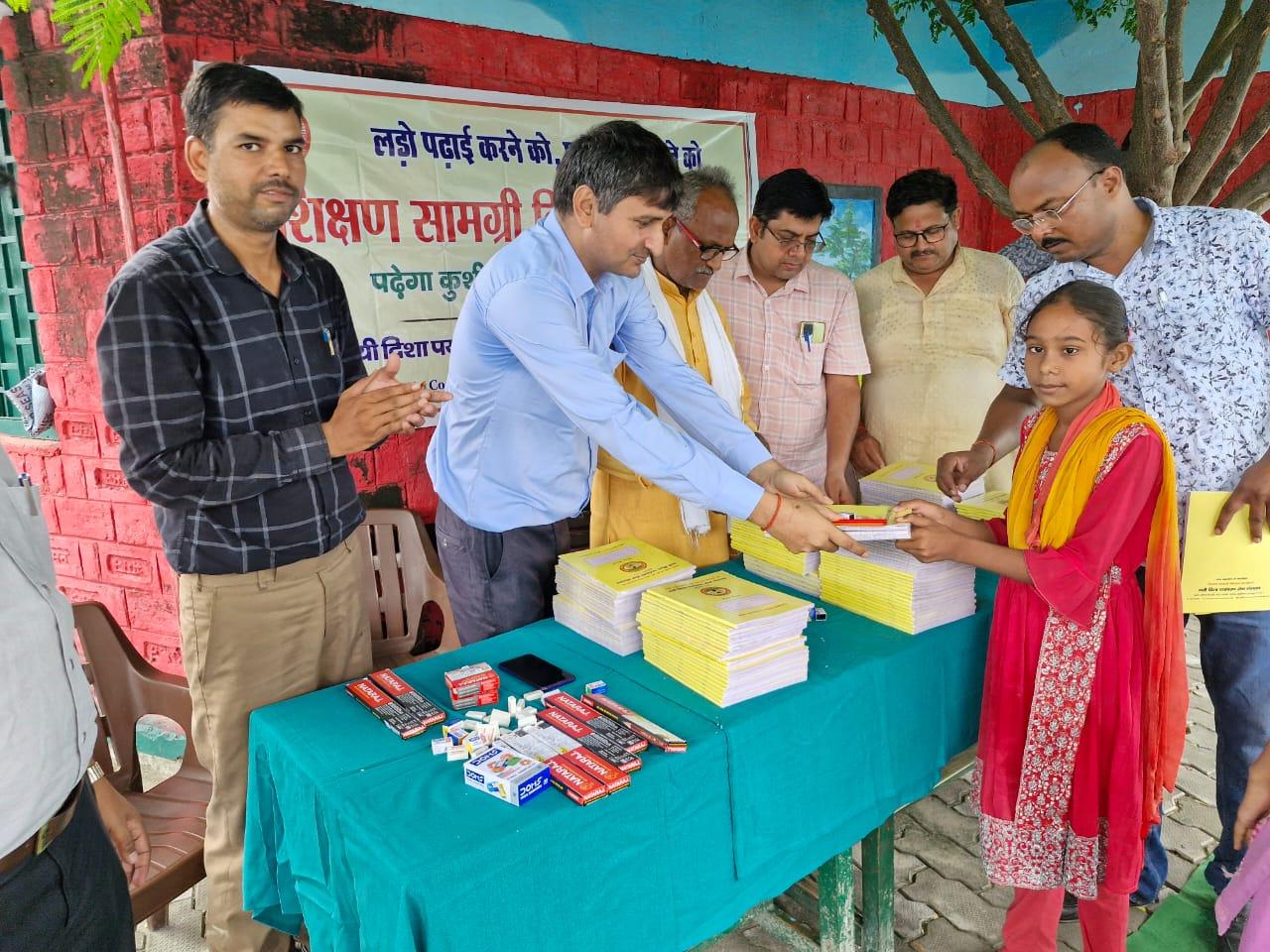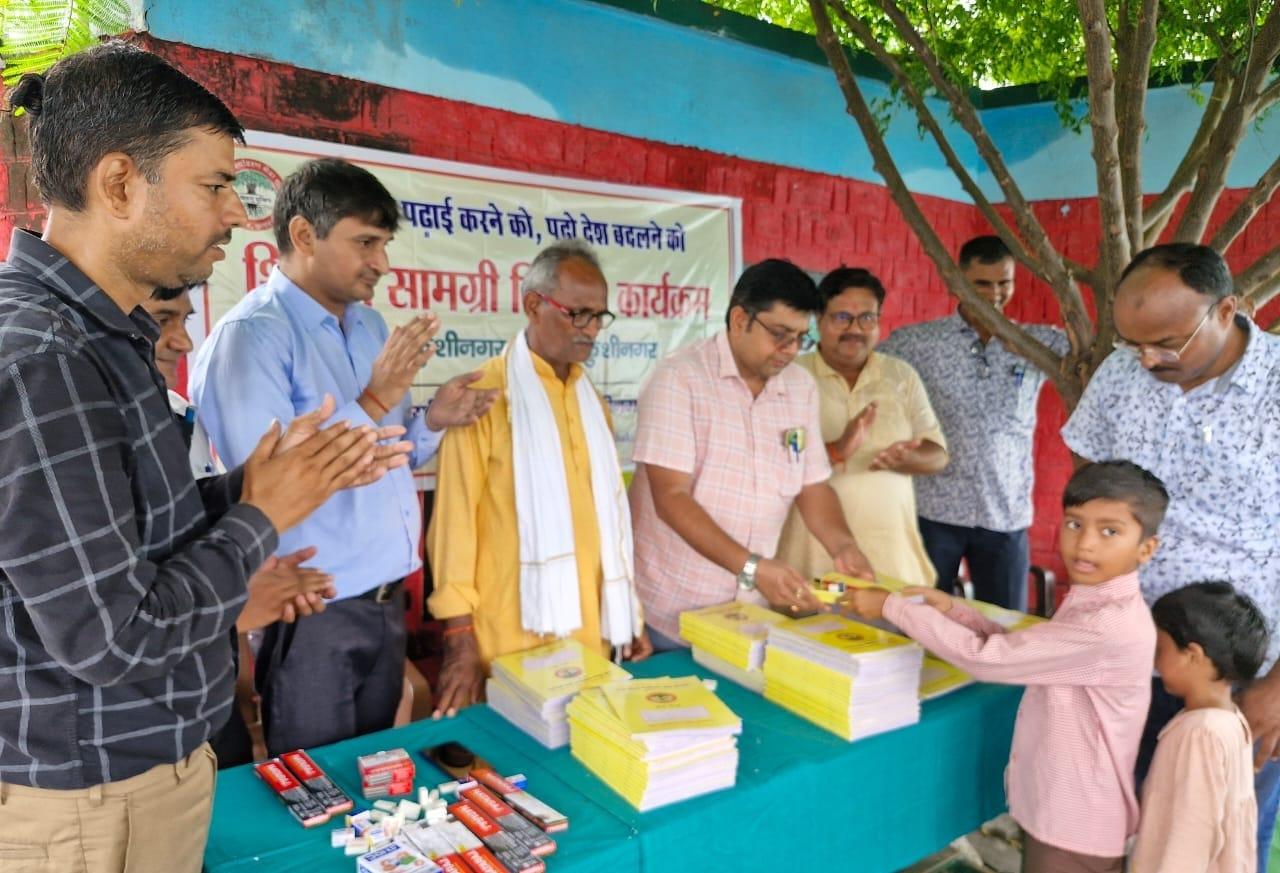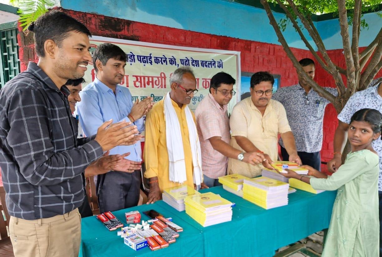 प्राथमिक विद्यालय नरकटिया खुर्द में विद्यार्थियों को जन सहयोग से शिक्षण सामग्री वितरित किया गया।