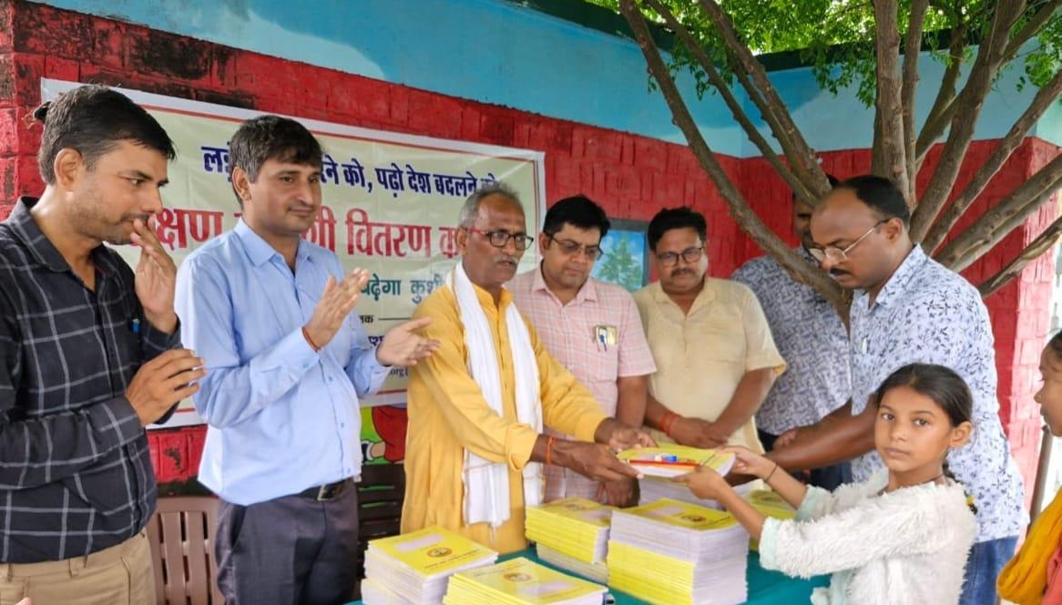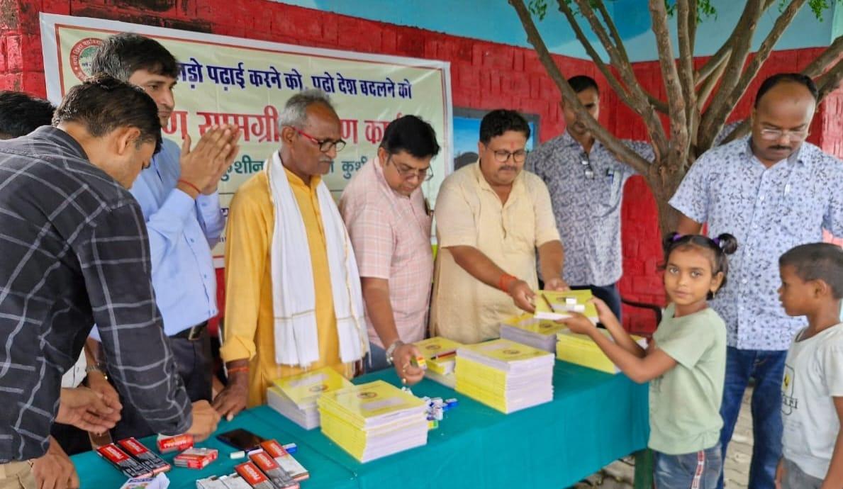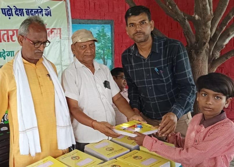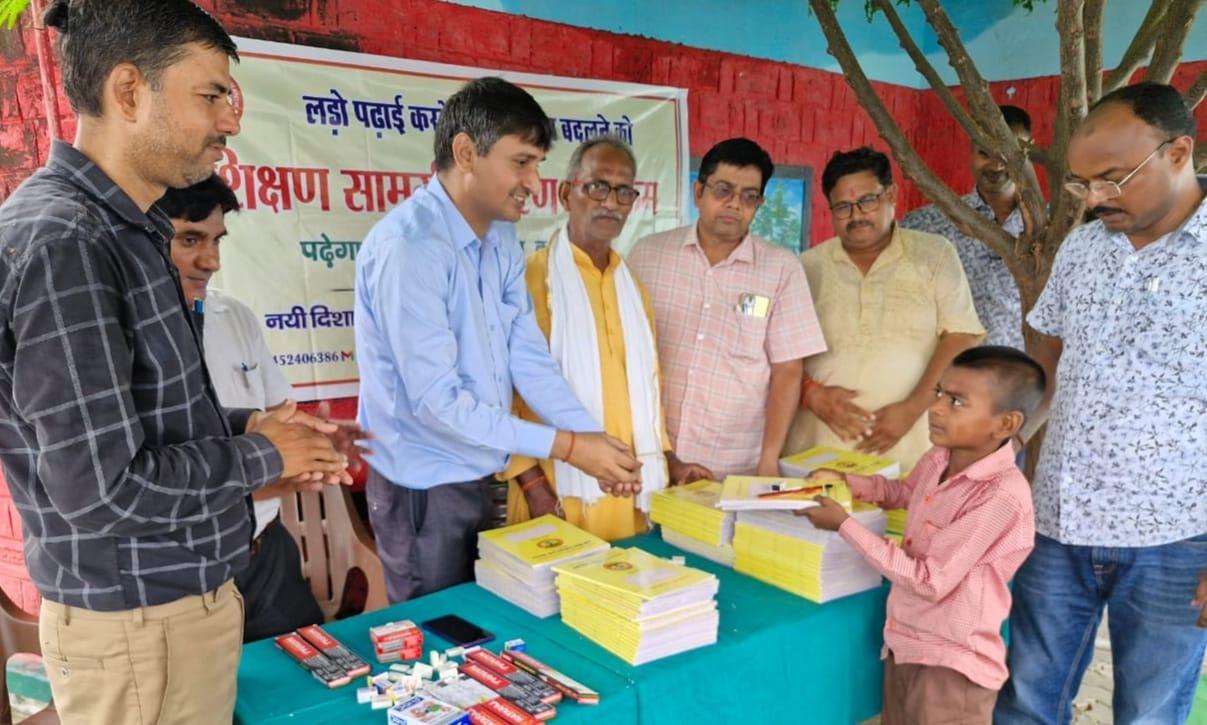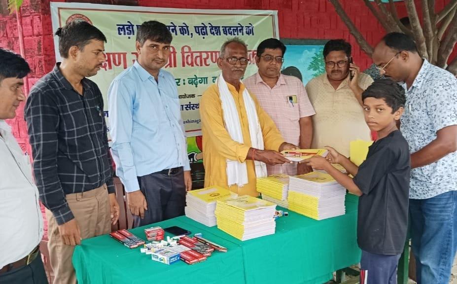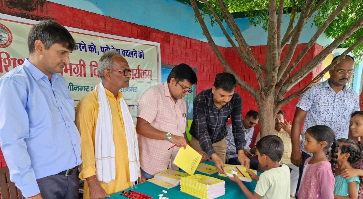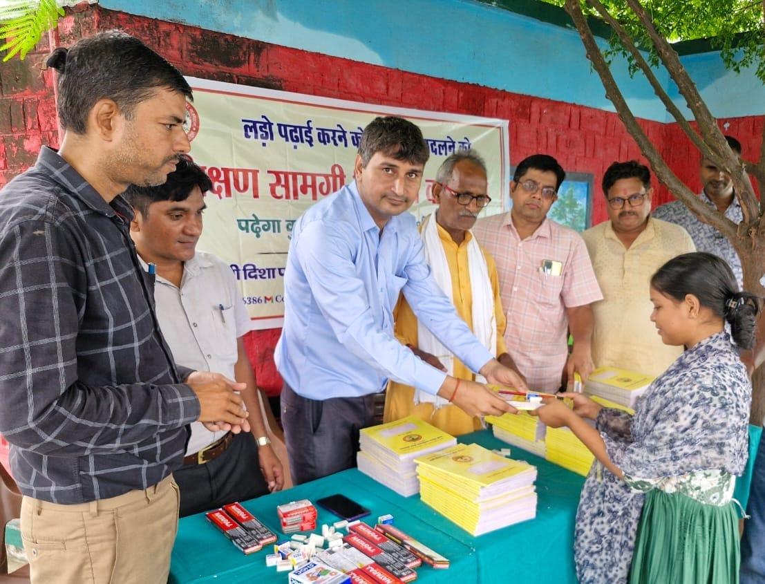 प्राथमिक विद्यालय नरकटिया खुर्द में विद्यार्थियों को जन सहयोग से शिक्षण सामग्री वितरित किया गया।
