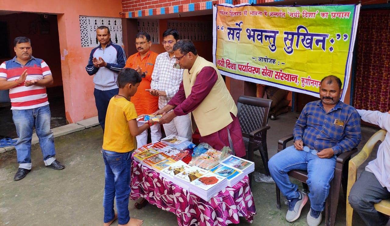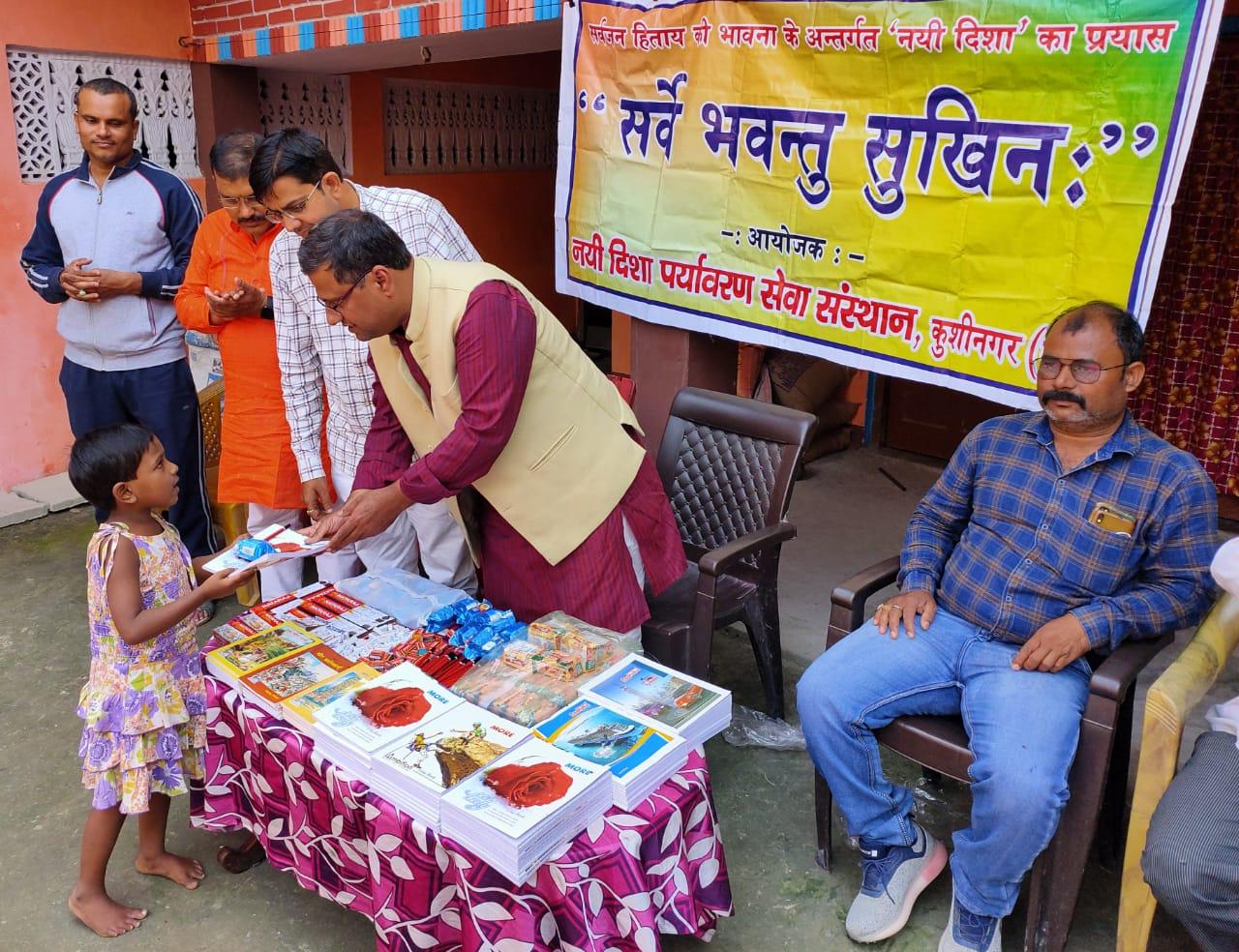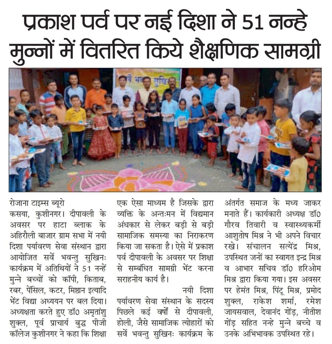 संस्थान द्वारा चलाये जा रहे सर्वे भवन्तु सुखिनः कार्यक्रम के अंतर्गत डॉ0 अमृतांशु शुक्ल सर की अध्यक्षता में 51 नन्हें मुन्नों को शिक्षण सामग्री (कॉपी, किताब, रबर, पेंसिल, कटर) व मिष्ठान भेंट कर नयी दिशा ने मनाई दिवाली।