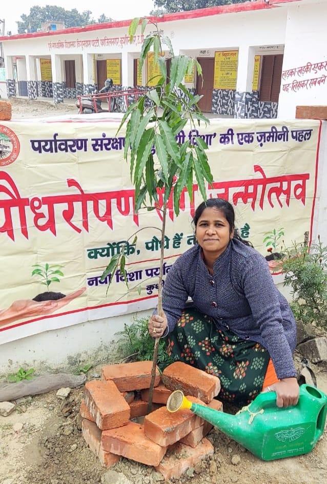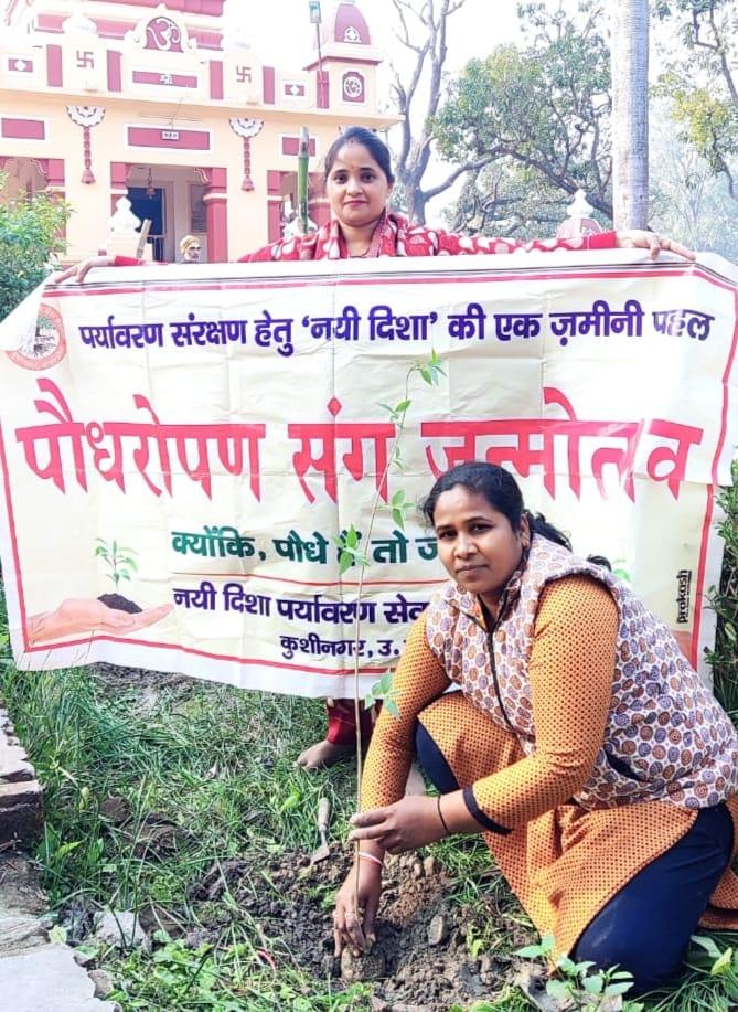 संस्थान द्वारा पर्यावरण संरक्षण हेतु चलाये जा रहे पौधरोपण संग जन्मोत्सव अभियान के क्रम में नयी दिशा से जुड़ी, प्रकृति संरक्षण के कार्यों में बढ़ चढ़ कर सहभागिता करने वाली, कसया निवासी, शिक्षिका सुश्री मधुलिका पूजा ने फाजिलनगर विकास खण्ड स्थित प्राथमिक विद्यालय किशुनदास पट्टी में शिक्षक साथियों के साथ पौधरोपण कर पर्यावरण संरक्षण का संदेश दिया। इसके अतिरिक्त कुशीनगर स्थित शिव मंदिर परिसर में भी विभिन्न प्रजाति के पौधों का रोपण किया।