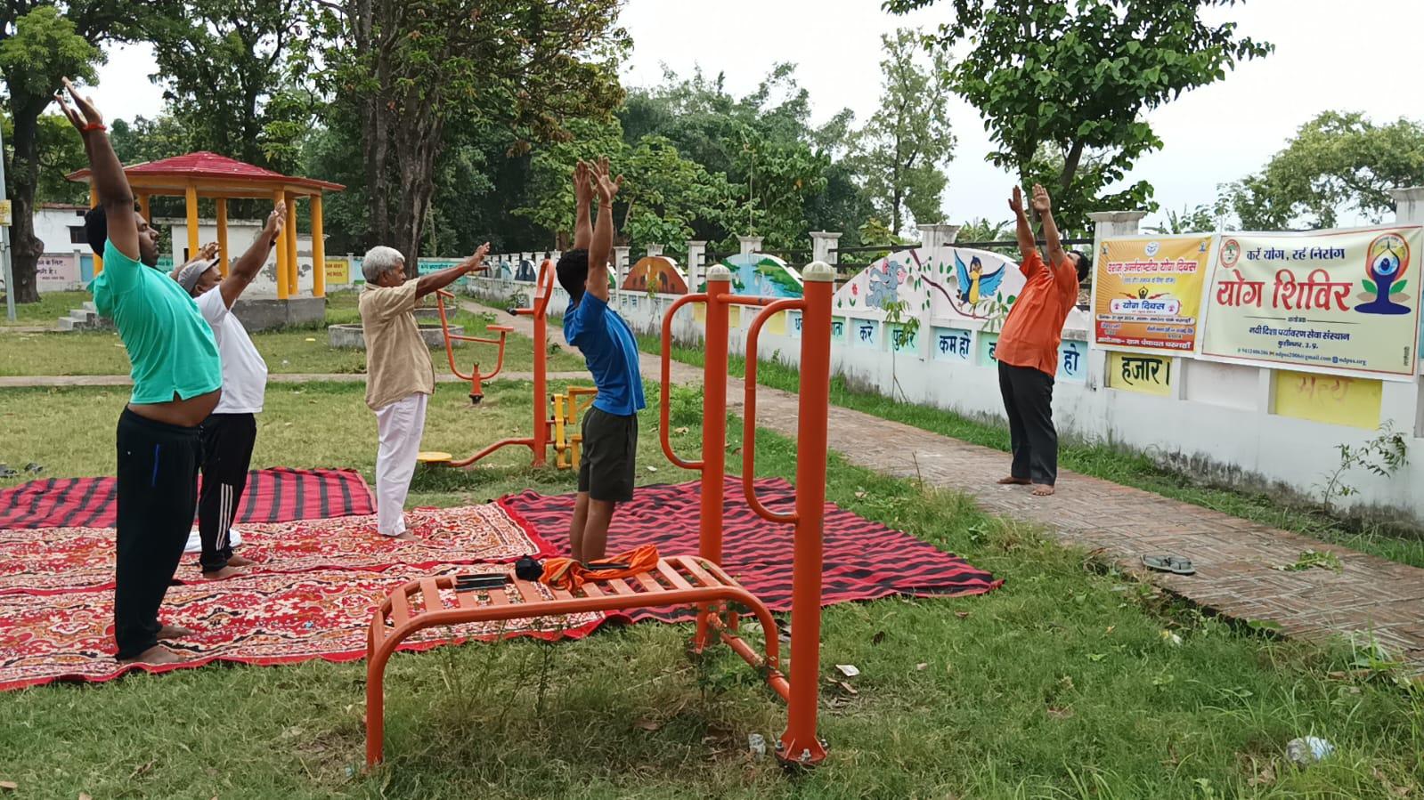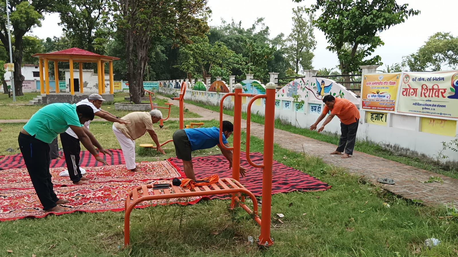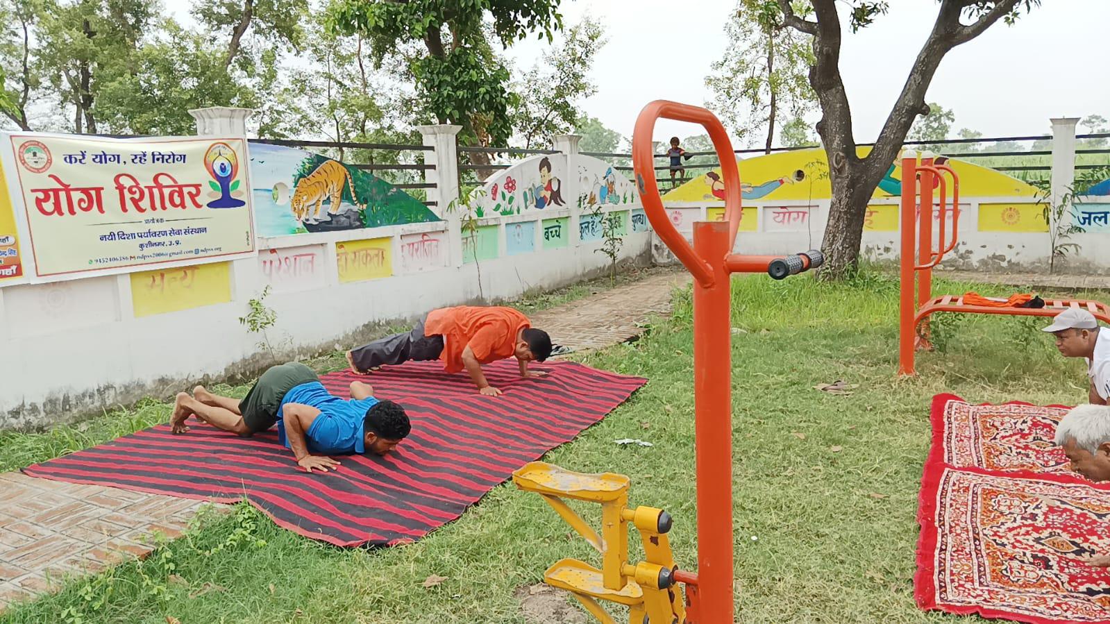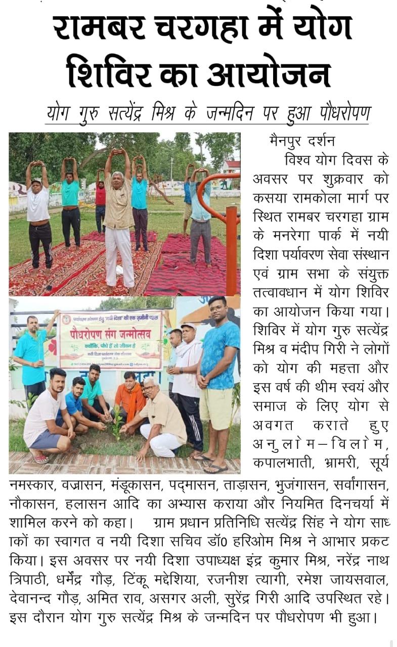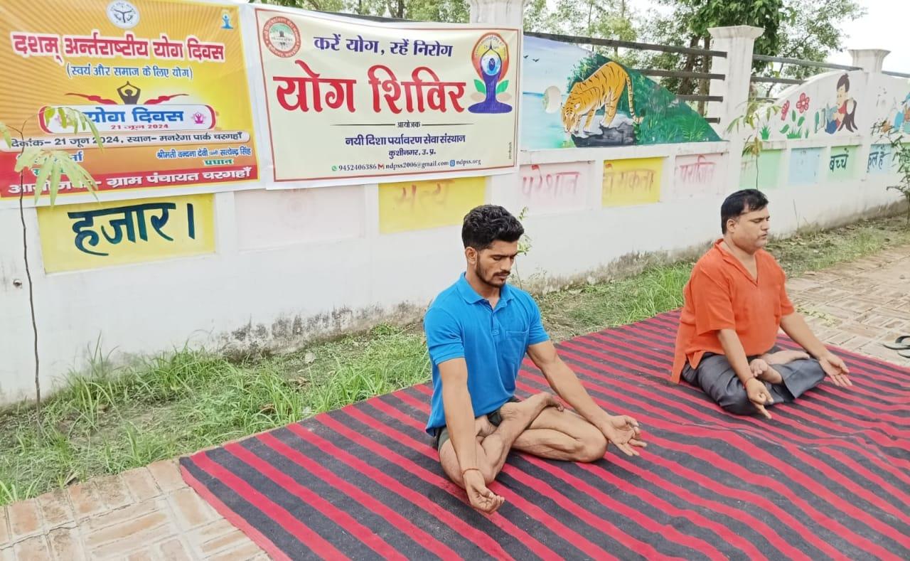 विश्व योग दिवस के अवसर पर कुशीनगर जनपद के कसया रामकोला मार्ग पर स्थित रामबर चरगहा ग्राम के मनरेगा पार्क में नयी दिशा पर्यावरण सेवा संस्थान एवं ग्राम सभा के संयुक्त तत्वावधान में योग शिविर का आयोजन किया गया।