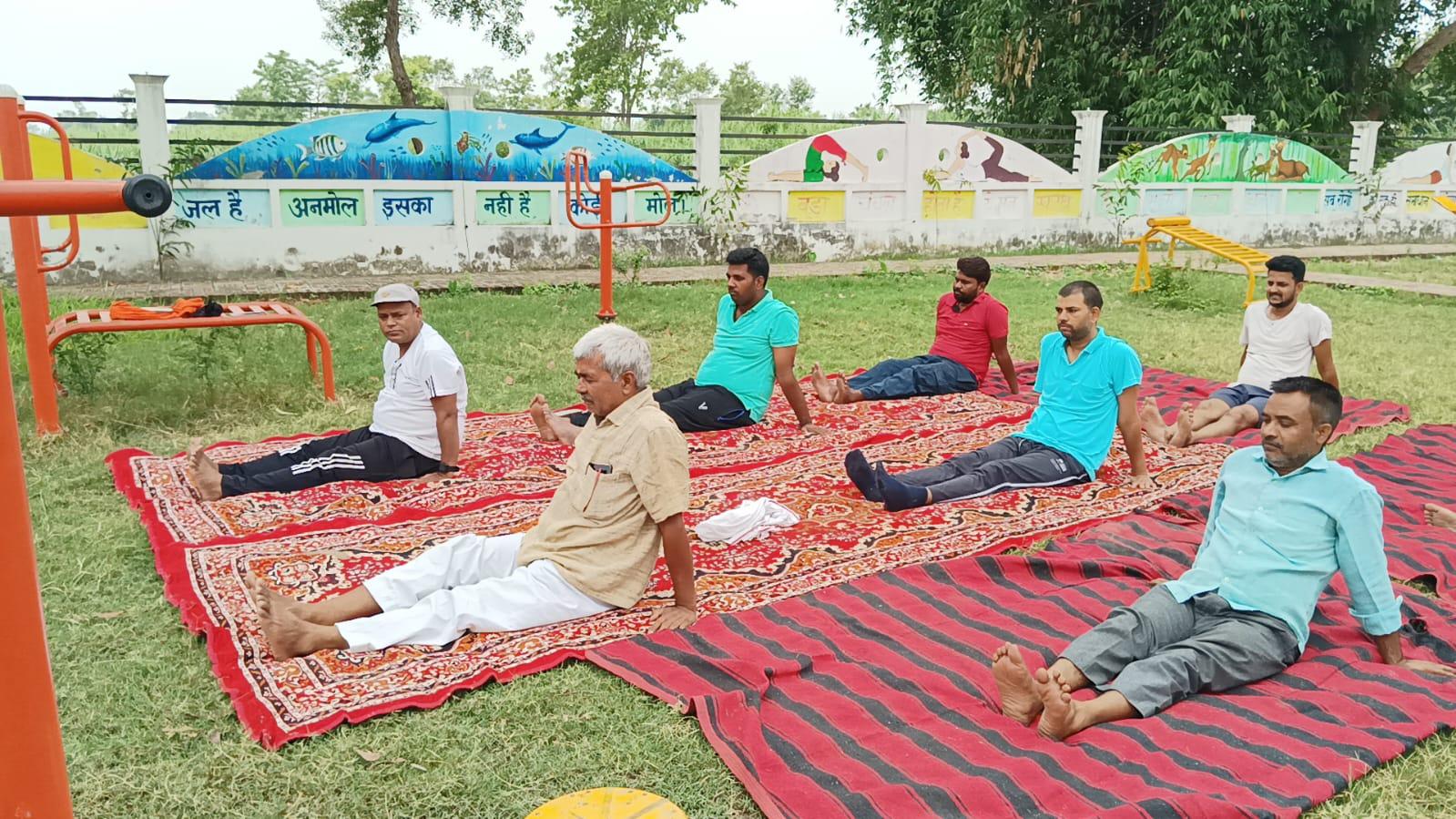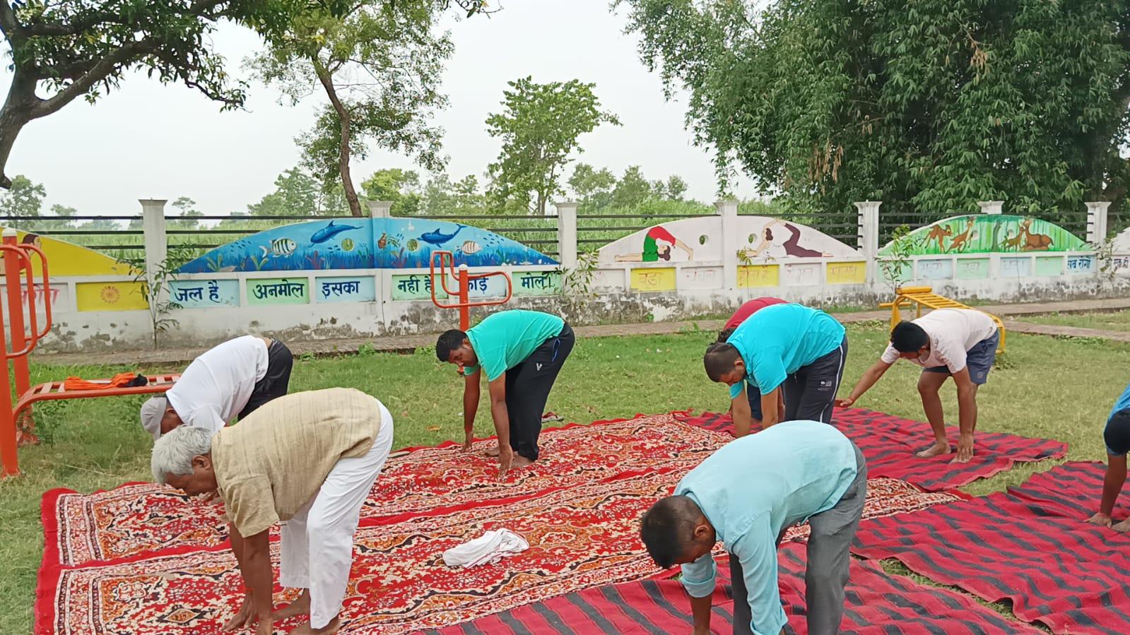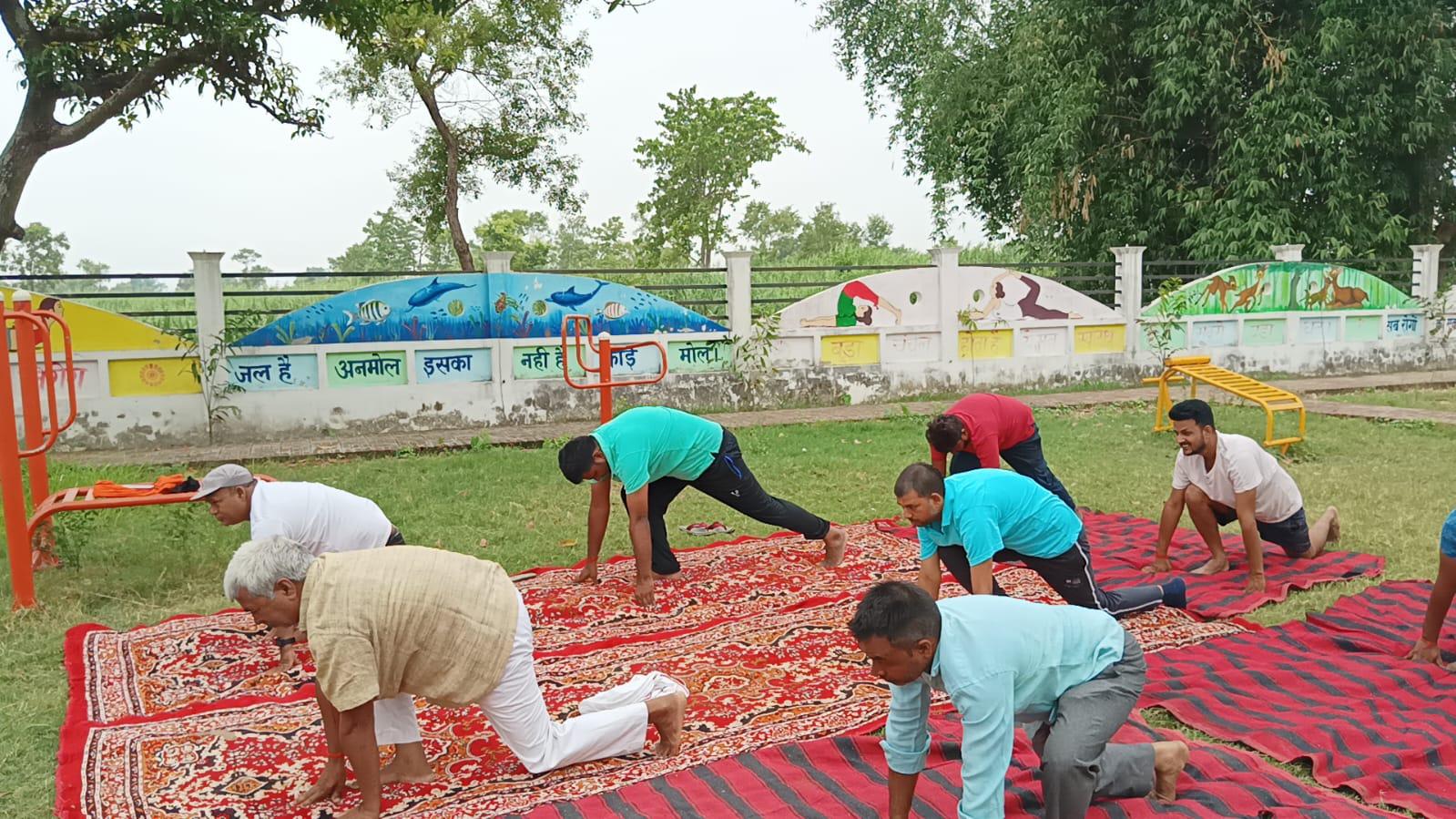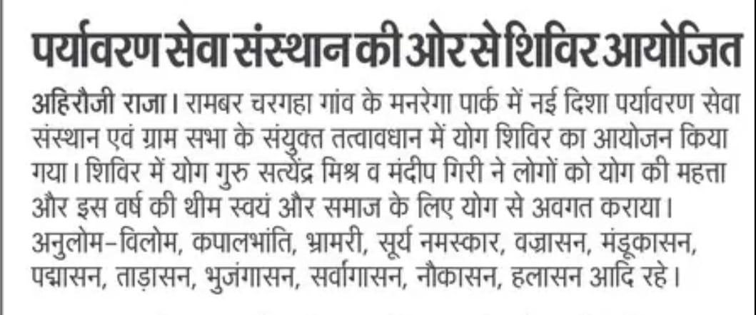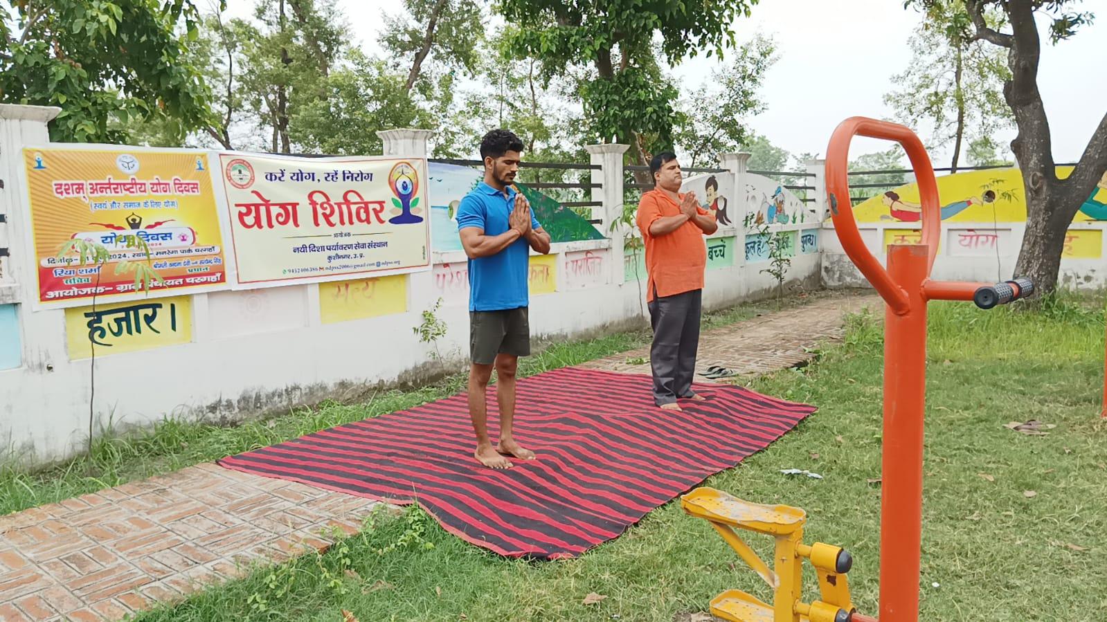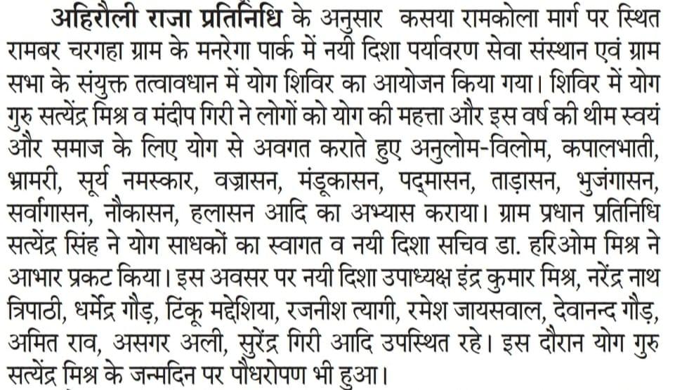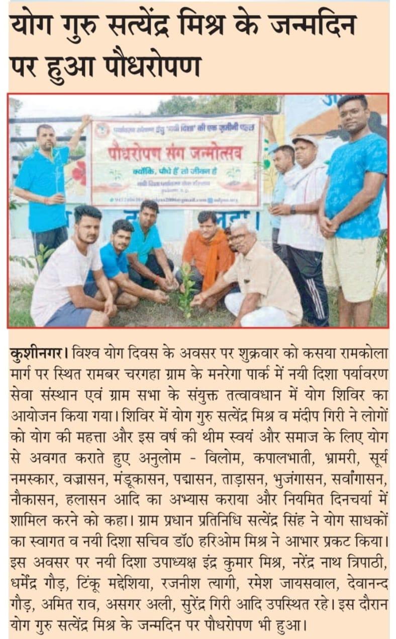 विश्व योग दिवस के अवसर पर कुशीनगर जनपद के कसया रामकोला मार्ग पर स्थित रामबर चरगहा ग्राम के मनरेगा पार्क में नयी दिशा पर्यावरण सेवा संस्थान एवं ग्राम सभा के संयुक्त तत्वावधान में योग शिविर का आयोजन किया गया।