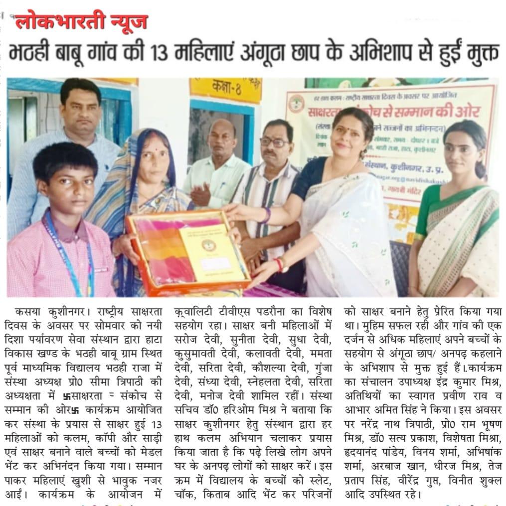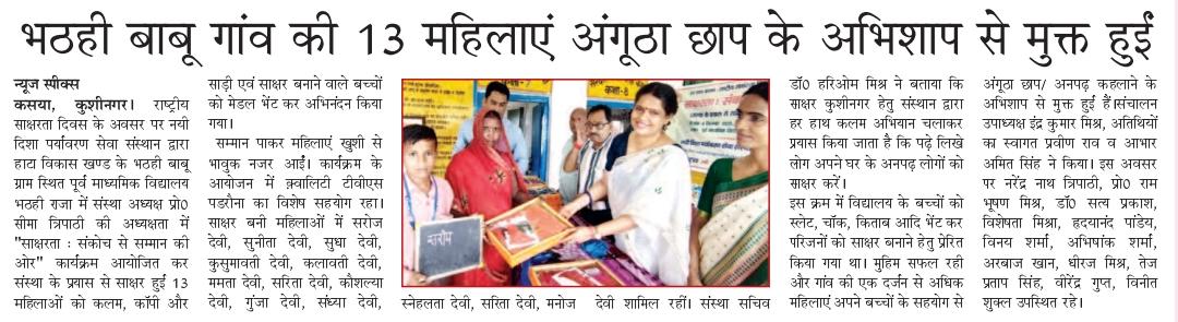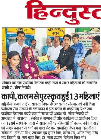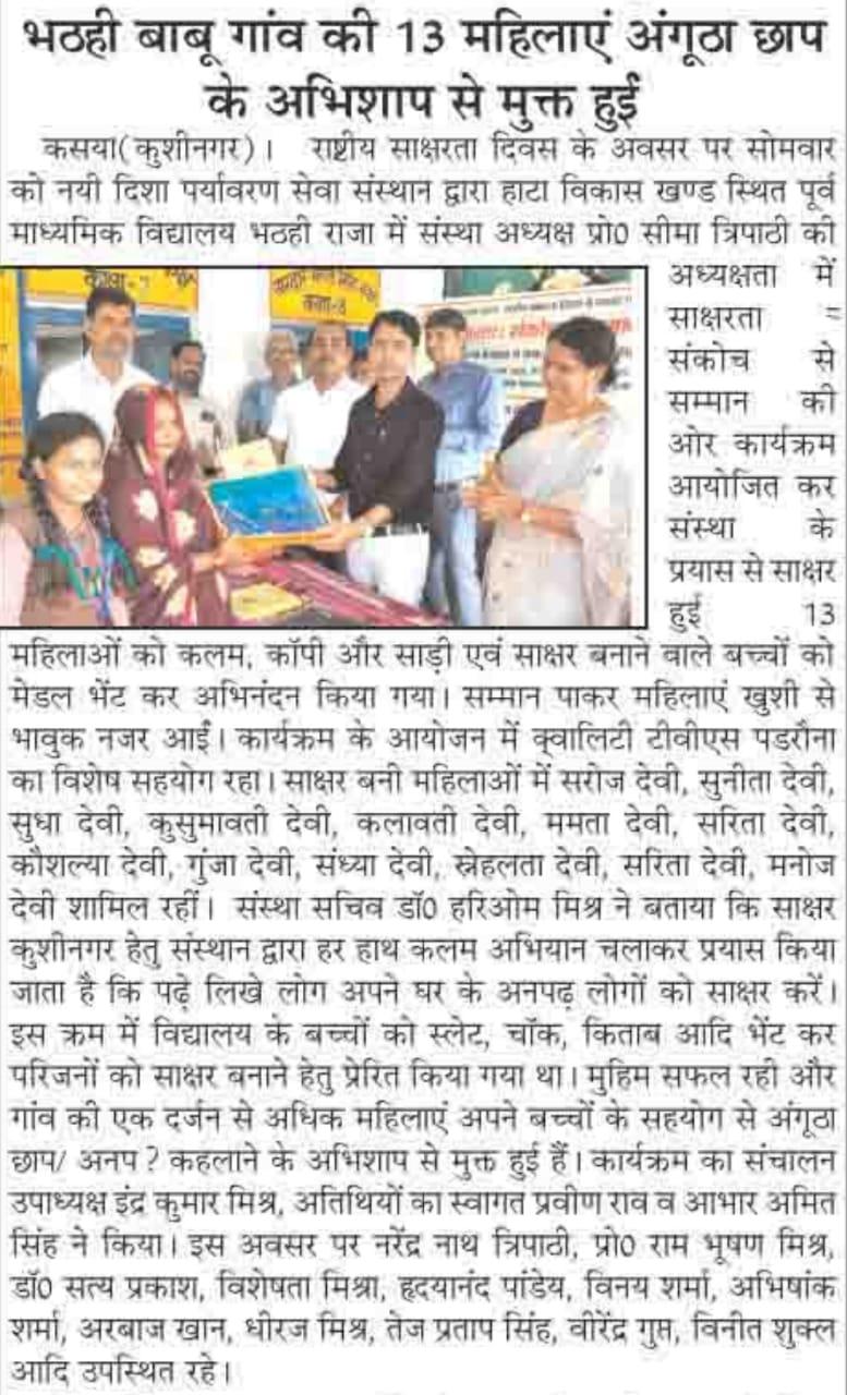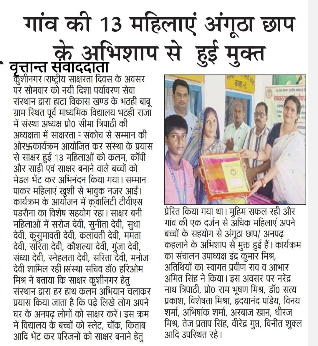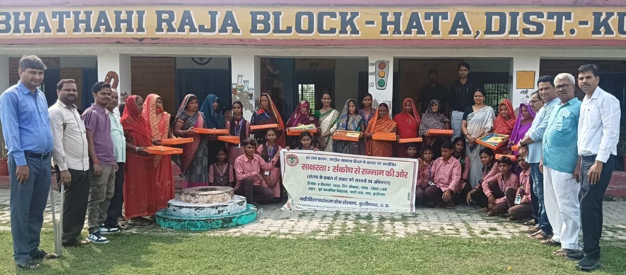 राष्ट्रीय साक्षरता दिवस के अवसर पर संस्थान द्वारा हाटा विकास खण्ड के भठही बाबू ग्राम स्थित पूर्व माध्यमिक विद्यालय भठही राजा में संस्था अध्यक्ष प्रो0 सीमा त्रिपाठी की अध्यक्षता में "साक्षरता : संकोच से सम्मान की ओर" कार्यक्रम आयोजित कर संस्था के प्रयास से साक्षर हुई 13 महिलाओं को कलम, कॉपी और साड़ी एवं साक्षर बनाने वाले बच्चों को मेडल भेंट कर अभिनंदन किया गया। सम्मान पाकर महिलाएं खुशी से भावुक नजर आईं। कार्यक्रम के आयोजन में क़्वालिटी टीवीएस पडरौना का विशेष सहयोग रहा। साक्षर बनी महिलाओं में श्रीमती सरोज देवी, श्रीमती सुनीता देवी, श्रीमती सुधा देवी, श्रीमती कुसुमावती देवी, श्रीमती कलावती देवी, श्रीमती ममता देवी, श्रीमती सरिता देवी, श्रीमती कौशल्या देवी, श्रीमती गुंजा देवी, श्रीमती संध्या देवी, श्रीमती स्नेहलता देवी, श्रीमती सरिता देवी, श्रीमती मनोज देवी शामिल रहीं।