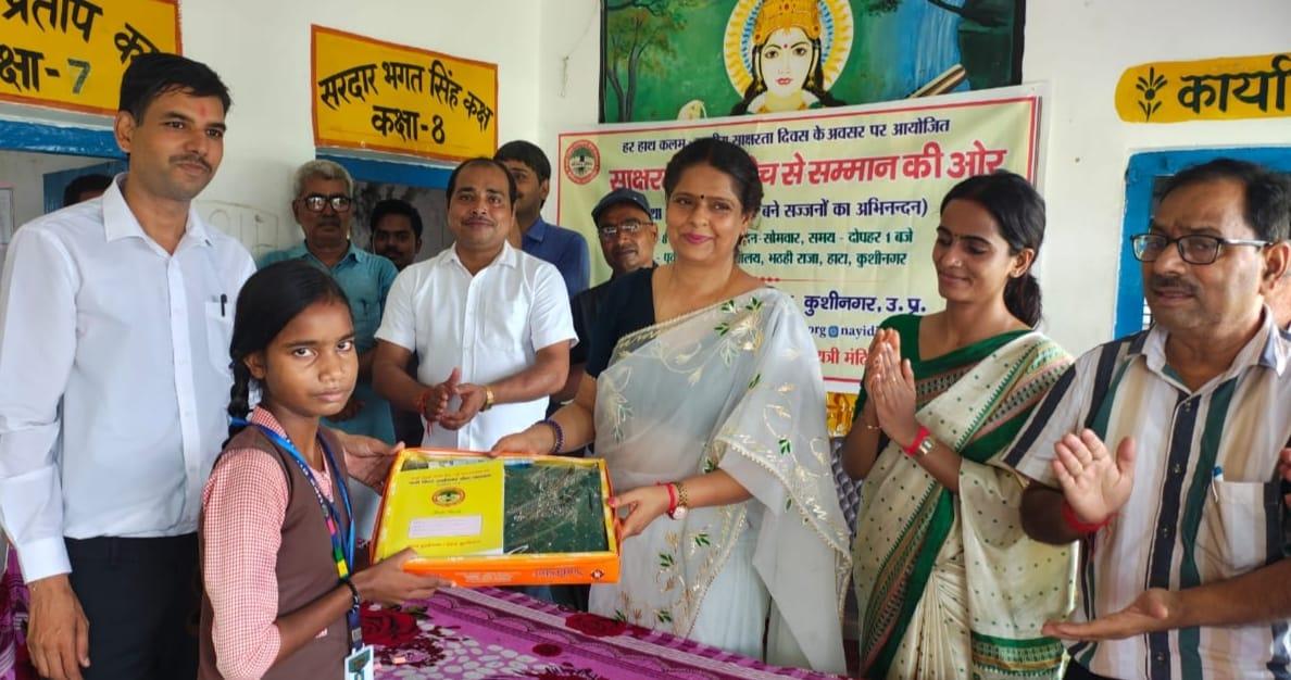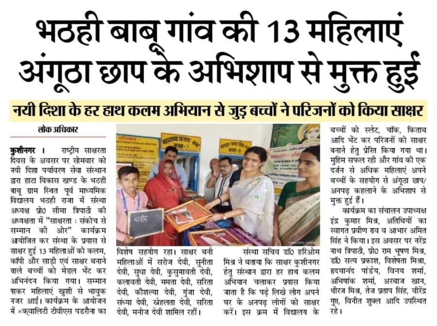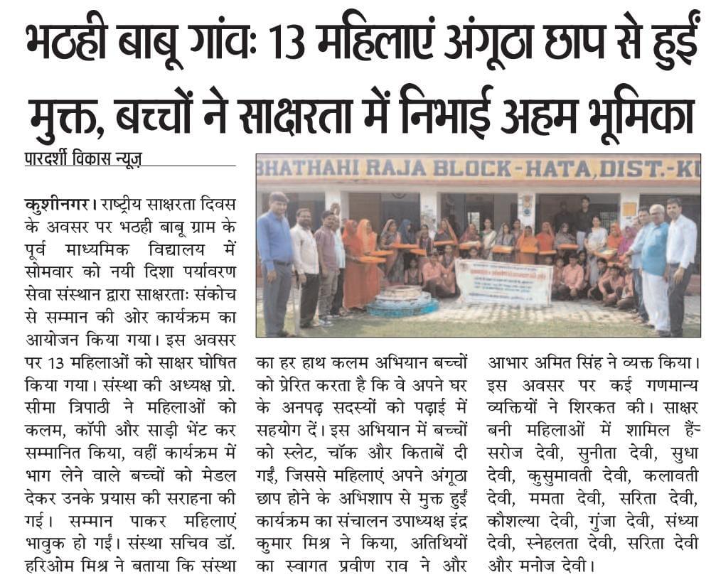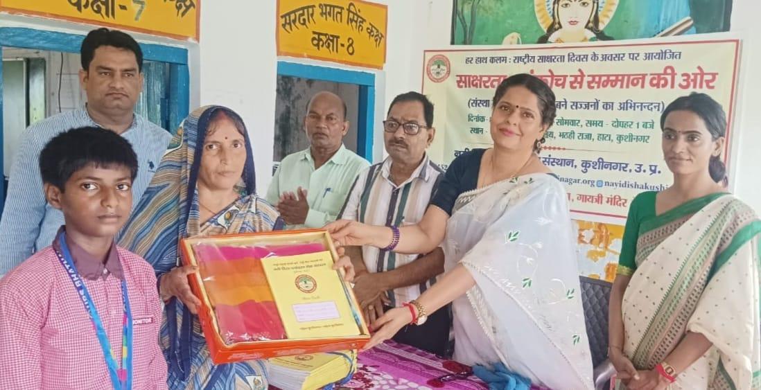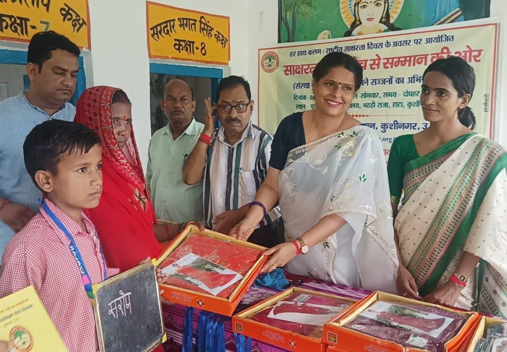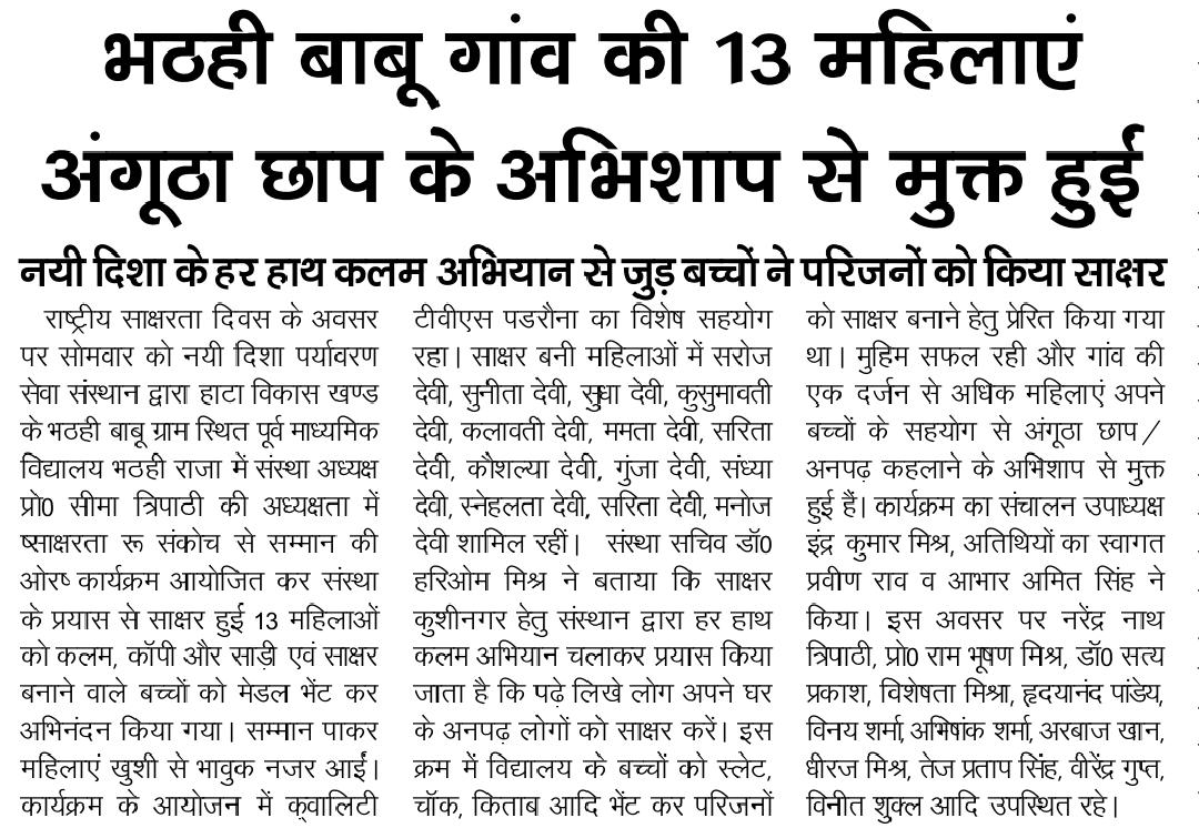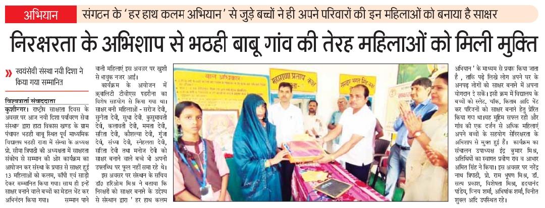 राष्ट्रीय साक्षरता दिवस के अवसर पर संस्थान द्वारा हाटा विकास खण्ड के भठही बाबू ग्राम स्थित पूर्व माध्यमिक विद्यालय भठही राजा में संस्था अध्यक्ष प्रो0 सीमा त्रिपाठी की अध्यक्षता में "साक्षरता : संकोच से सम्मान की ओर" कार्यक्रम आयोजित कर संस्था के प्रयास से साक्षर हुई 13 महिलाओं को कलम, कॉपी और साड़ी एवं साक्षर बनाने वाले बच्चों को मेडल भेंट कर अभिनंदन किया गया। सम्मान पाकर महिलाएं खुशी से भावुक नजर आईं। कार्यक्रम के आयोजन में क़्वालिटी टीवीएस पडरौना का विशेष सहयोग रहा। साक्षर बनी महिलाओं में श्रीमती सरोज देवी, श्रीमती सुनीता देवी, श्रीमती सुधा देवी, श्रीमती कुसुमावती देवी, श्रीमती कलावती देवी, श्रीमती ममता देवी, श्रीमती सरिता देवी, श्रीमती कौशल्या देवी, श्रीमती गुंजा देवी, श्रीमती संध्या देवी, श्रीमती स्नेहलता देवी, श्रीमती सरिता देवी, श्रीमती मनोज देवी शामिल रहीं।