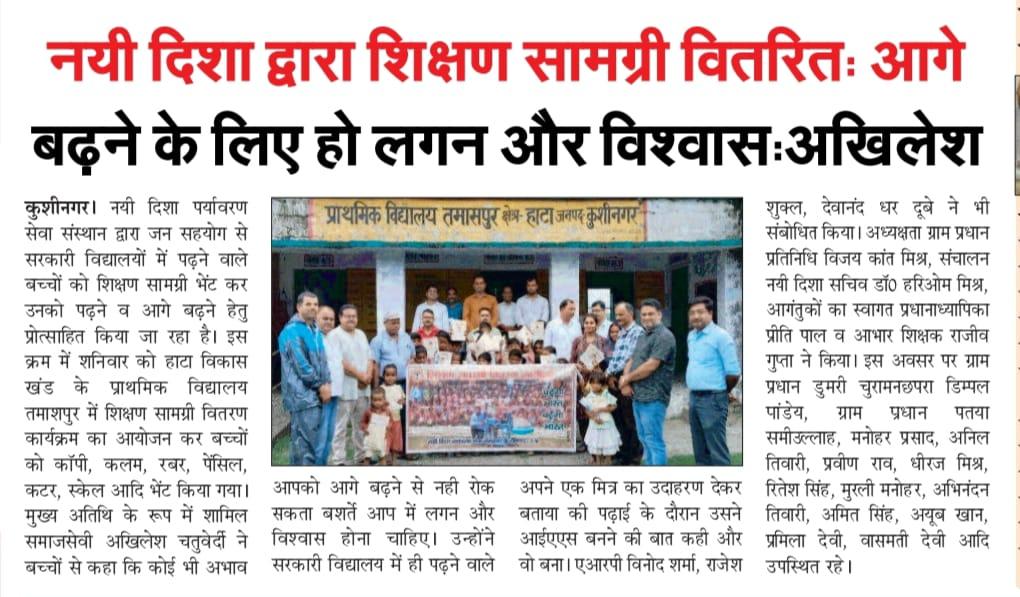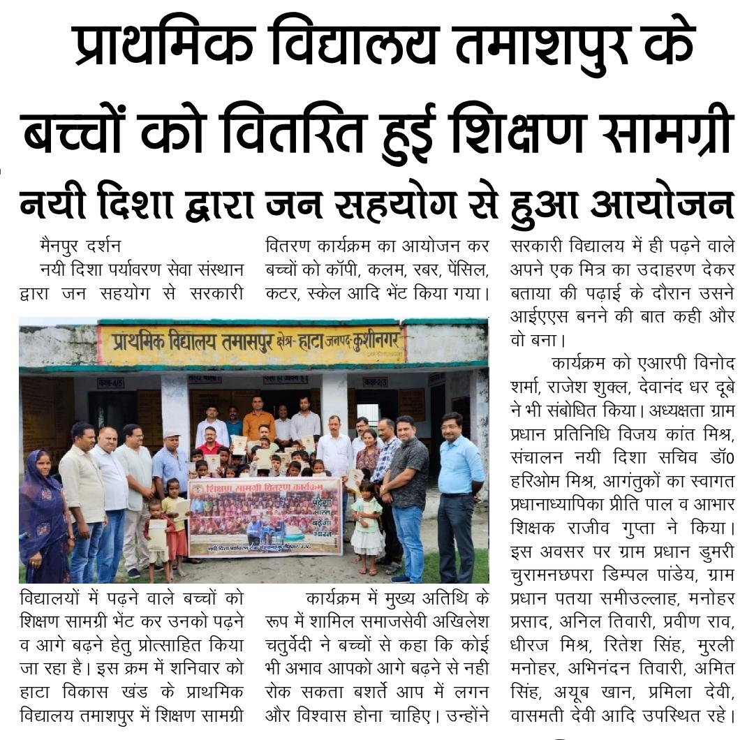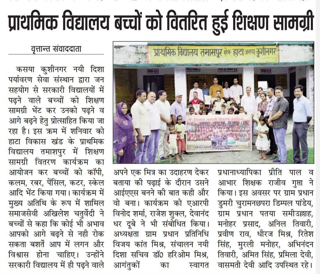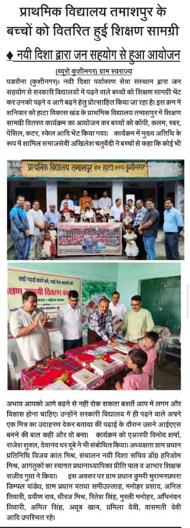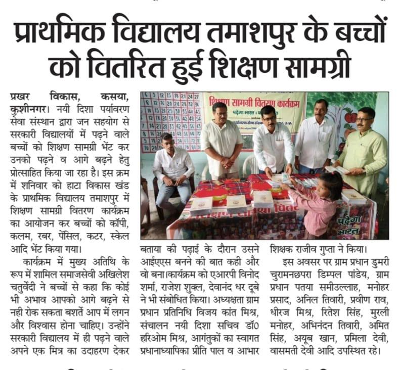 हाटा विकास खंड के प्राथमिक विद्यालय तमाशपुर में शिक्षण सामग्री वितरण कार्यक्रम का आयोजन कर बच्चों को कॉपी, कलम, रबर, पेंसिल, कटर आदि भेंट कर पढ़ने व आगे बढ़ने हेतु प्रोत्साहित किया गया। यह शुभ कार्य समाजसेवी श्री अखिलेश चतुर्वेदी, ग्राम प्रधान प्रतिनिधि विजय कांत मिश्र, एआरपी श्री विनोद शर्मा, श्री राजेश शुक्ल, श्री देवानंद धर दूबे, प्रधानाध्यापिका श्रीमती प्रीति पाल, शिक्षक श्री राजीव गुप्ता, ग्राम प्रधान डुमरी चुरामनछपरा श्री डिम्पल पांडेय, ग्राम प्रधान पतया श्री समीउल्लाह, श्री मनोहर प्रसाद, श्री अनिल तिवारी, श्री प्रवीण राव, श्री धीरज मिश्र, श्री रितेश सिंह, श्री मुरली मनोहर, श्री अभिनंदन तिवारी, श्री अमित सिंह, श्री अयूब खान, श्रीमती प्रमिला देवी, श्रीमती वासमती देवी, नयी दिशा सचिव डॉ0 हरिओम मिश्र आदि के हाथों सम्पन्न हुआ।
