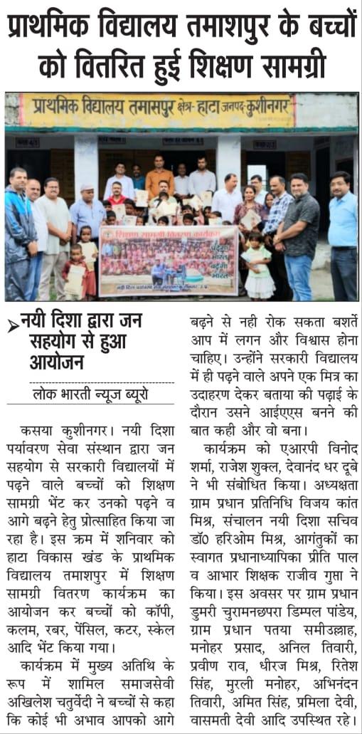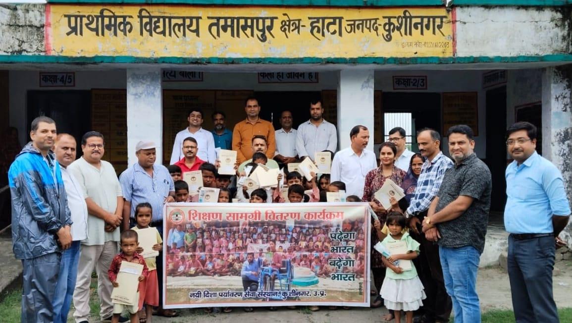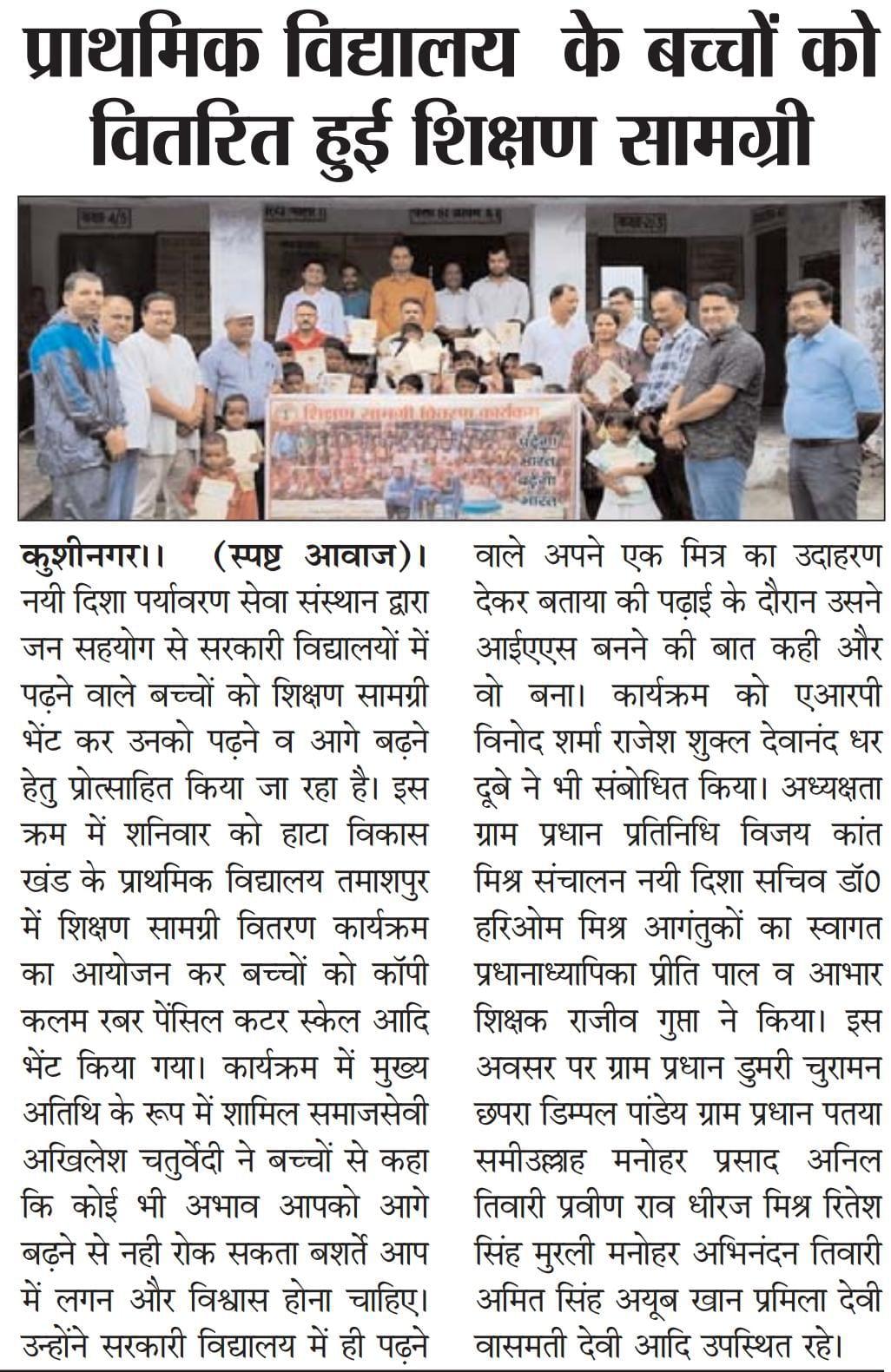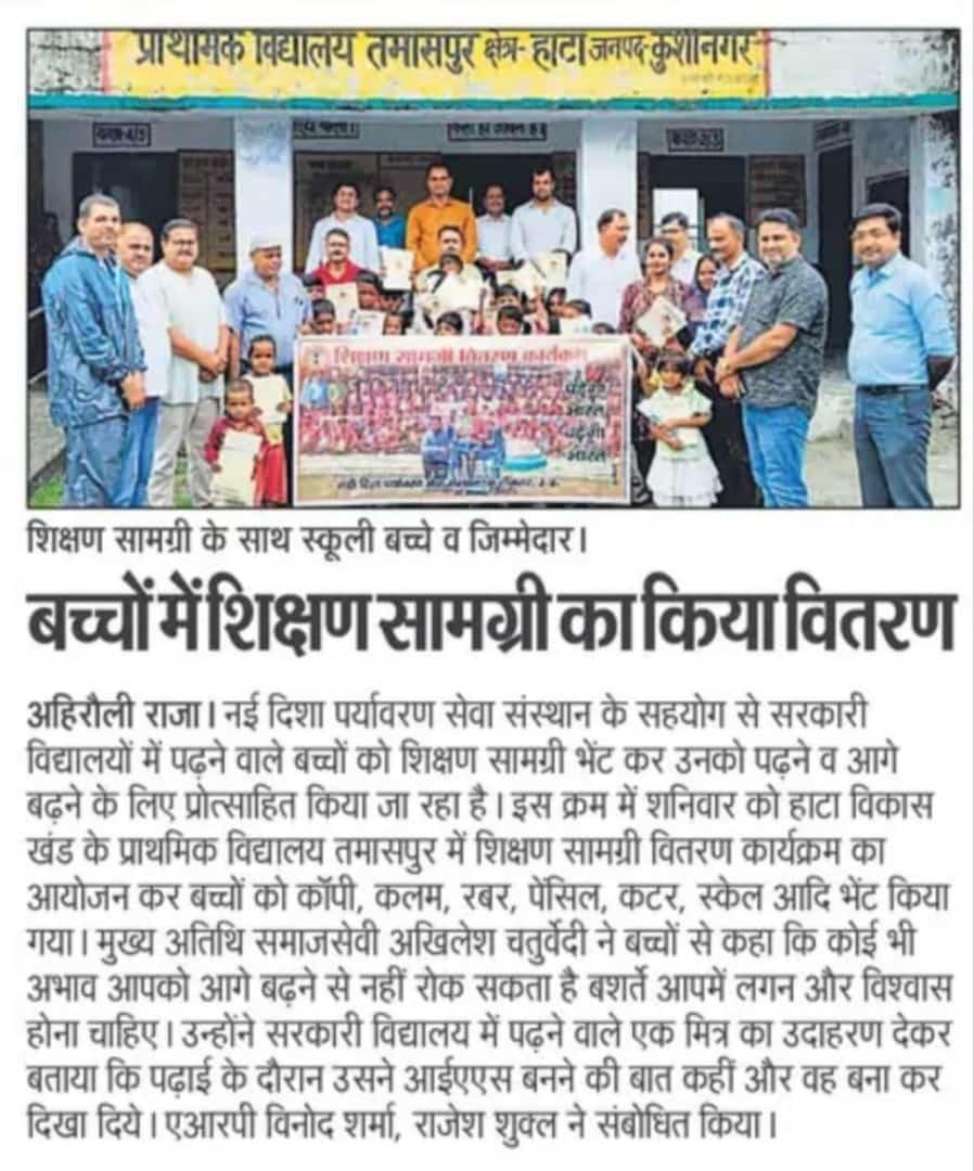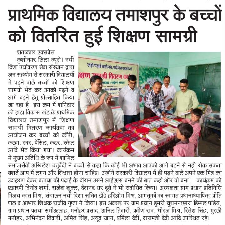 हाटा विकास खंड के प्राथमिक विद्यालय तमाशपुर में शिक्षण सामग्री वितरण कार्यक्रम का आयोजन कर बच्चों को कॉपी, कलम, रबर, पेंसिल, कटर आदि भेंट कर पढ़ने व आगे बढ़ने हेतु प्रोत्साहित किया गया। यह शुभ कार्य समाजसेवी श्री अखिलेश चतुर्वेदी, ग्राम प्रधान प्रतिनिधि विजय कांत मिश्र, एआरपी श्री विनोद शर्मा, श्री राजेश शुक्ल, श्री देवानंद धर दूबे, प्रधानाध्यापिका श्रीमती प्रीति पाल, शिक्षक श्री राजीव गुप्ता, ग्राम प्रधान डुमरी चुरामनछपरा श्री डिम्पल पांडेय, ग्राम प्रधान पतया श्री समीउल्लाह, श्री मनोहर प्रसाद, श्री अनिल तिवारी, श्री प्रवीण राव, श्री धीरज मिश्र, श्री रितेश सिंह, श्री मुरली मनोहर, श्री अभिनंदन तिवारी, श्री अमित सिंह, श्री अयूब खान, श्रीमती प्रमिला देवी, श्रीमती वासमती देवी, नयी दिशा सचिव डॉ0 हरिओम मिश्र आदि के हाथों सम्पन्न हुआ।