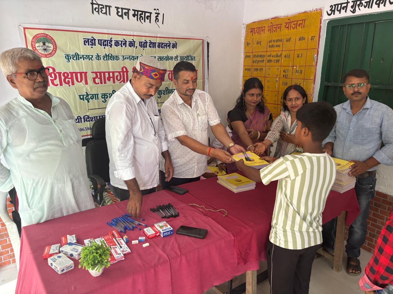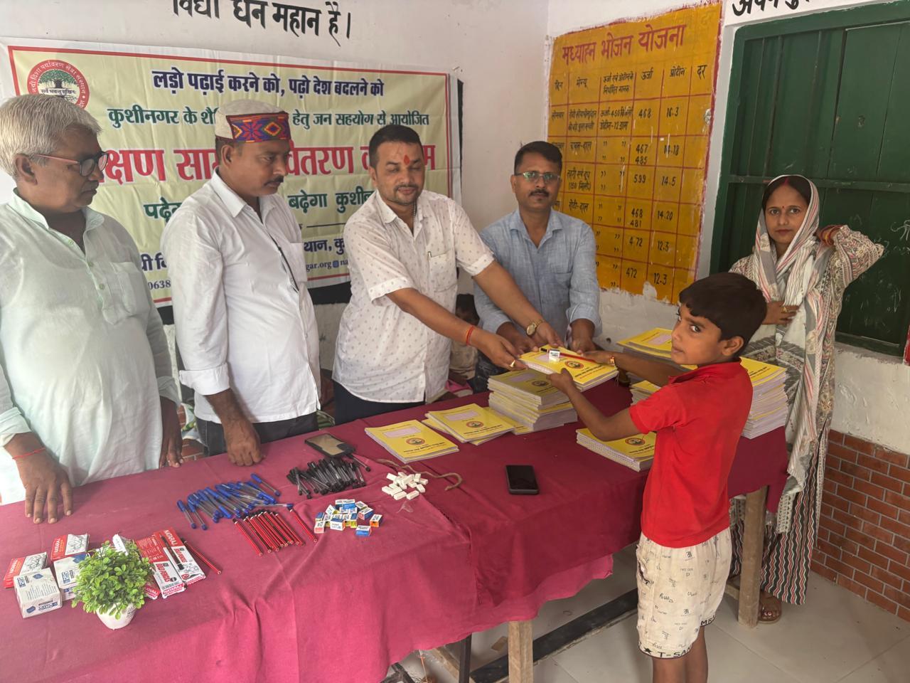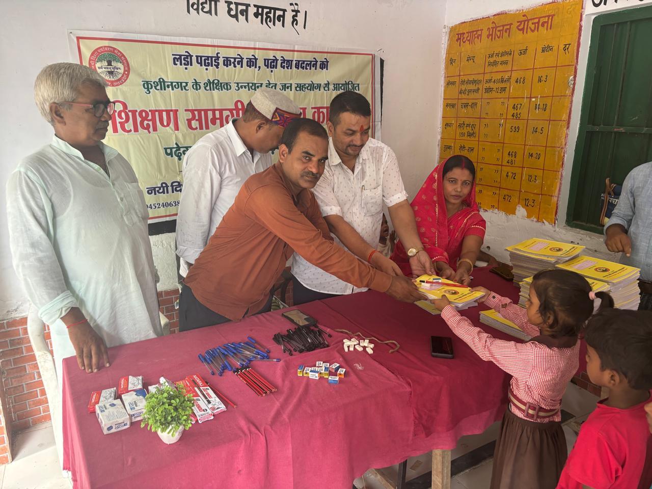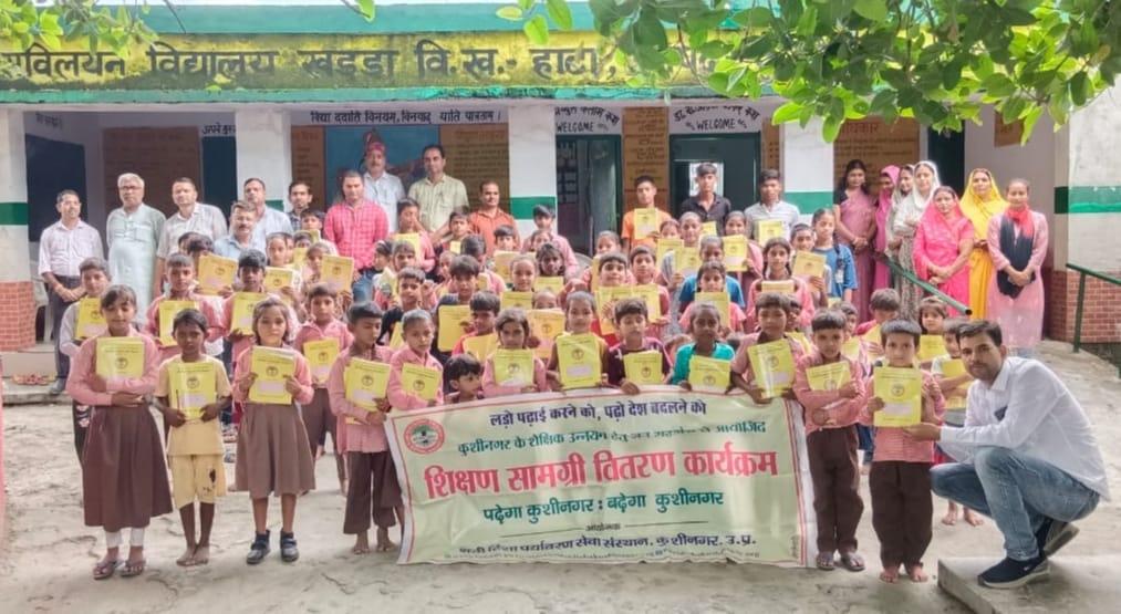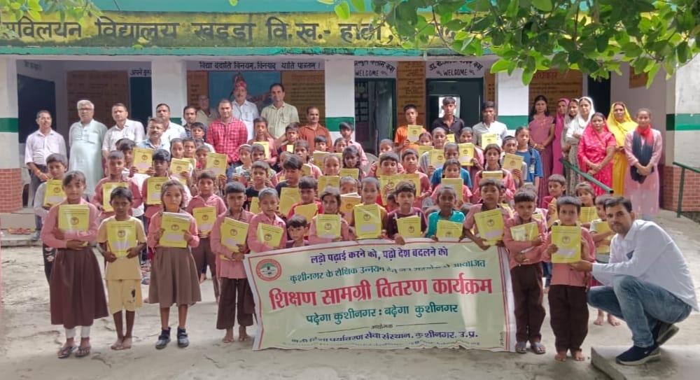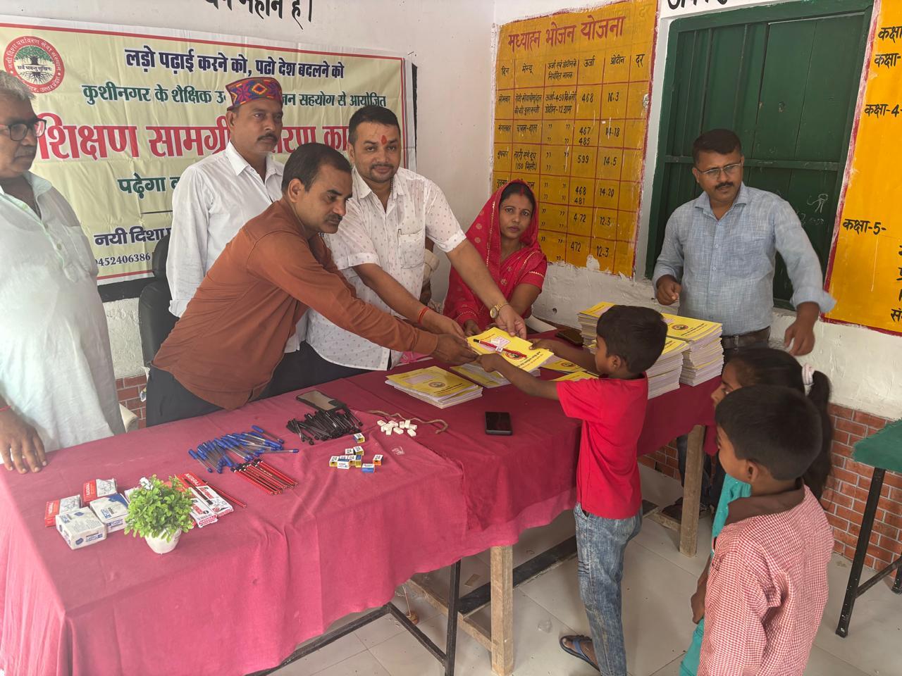 संस्थान द्वारा पढ़ेगा कुशीनगर, बढ़ेगा कुशीनगर की भावना के साथ जन सहयोग से चलाये जा रहे शिक्षण सामग्री वितरण कार्यक्रम के क्रम में हाटा विकास खण्ड स्थित संविलियन विद्यालय खड्डा में विद्यार्थियों को कॉपी, कलम, पेंसिल, रबर, कटर आदि शिक्षण सामग्री भेंट कर पढ़ने व आगे बढ़ने हेतु प्रोत्साहित किया गया।