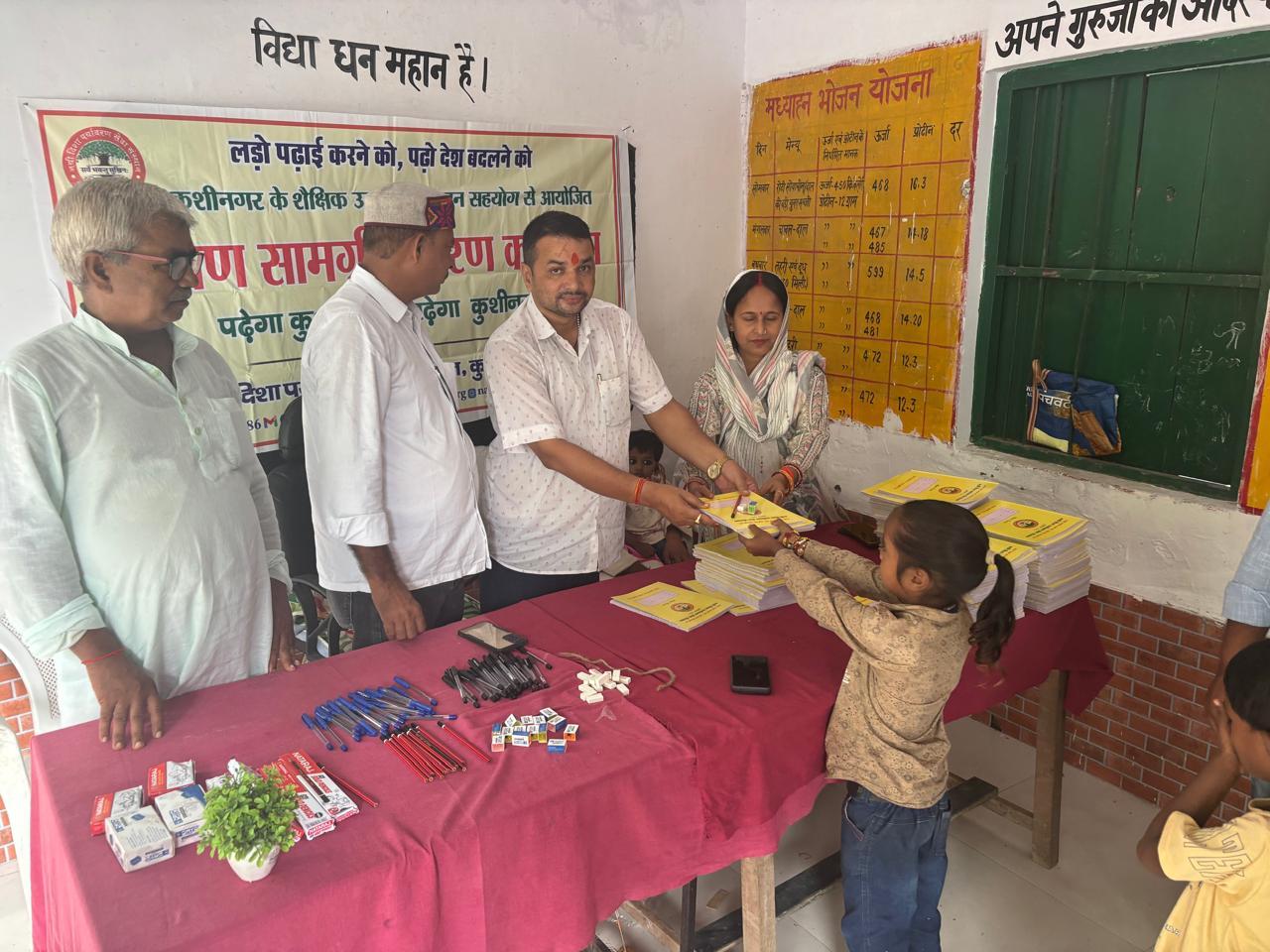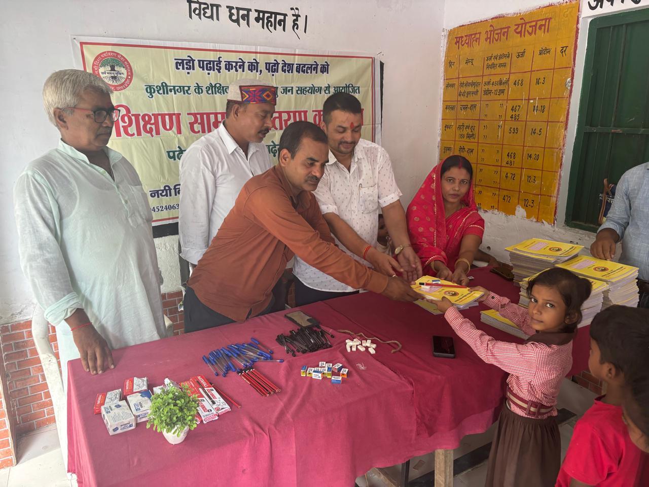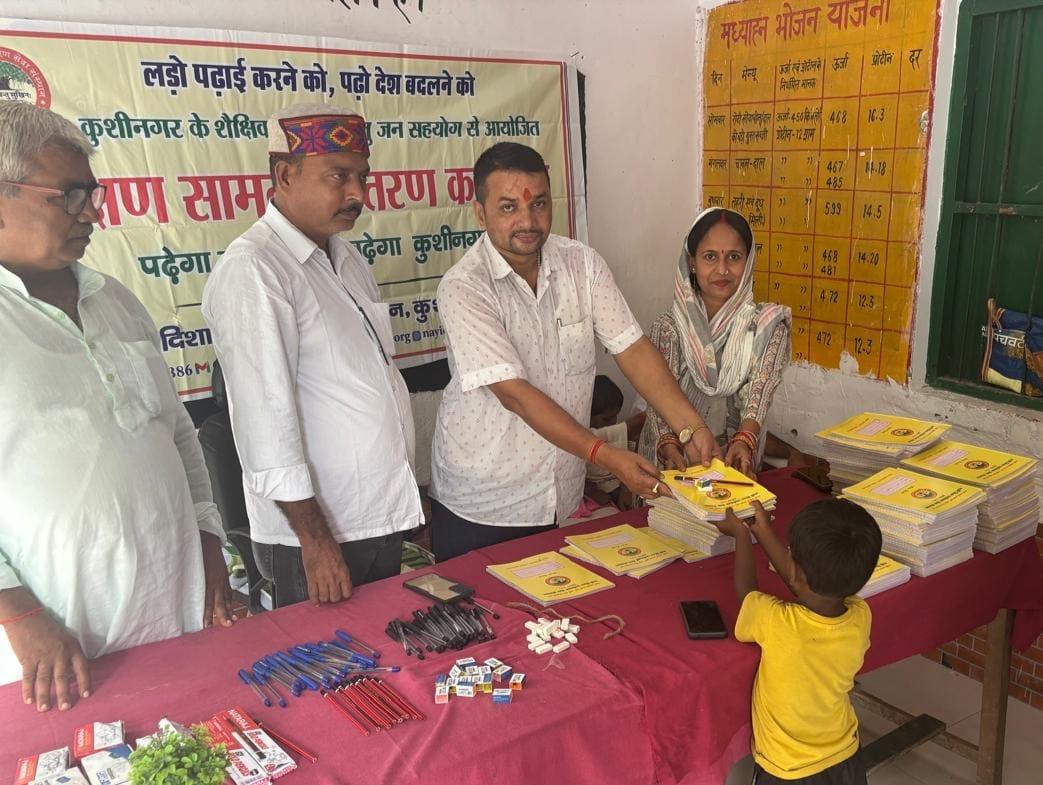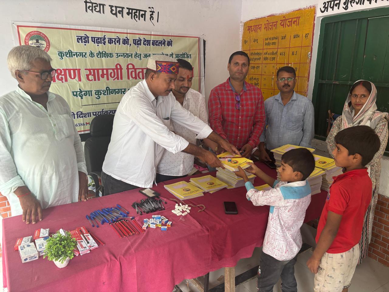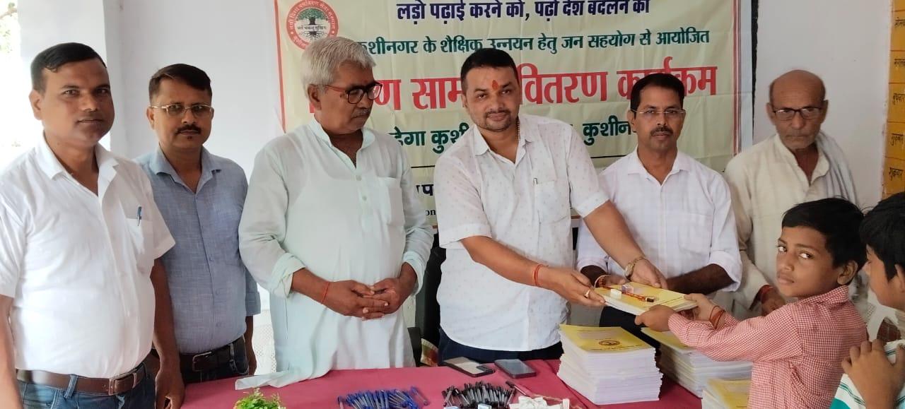 संस्थान द्वारा पढ़ेगा कुशीनगर, बढ़ेगा कुशीनगर की भावना के साथ जन सहयोग से चलाये जा रहे शिक्षण सामग्री वितरण कार्यक्रम के क्रम में हाटा विकास खण्ड स्थित संविलियन विद्यालय खड्डा में विद्यार्थियों को कॉपी, कलम, पेंसिल, रबर, कटर आदि शिक्षण सामग्री भेंट कर पढ़ने व आगे बढ़ने हेतु प्रोत्साहित किया गया।