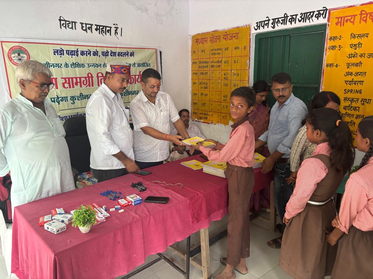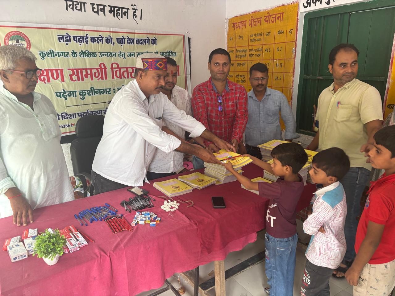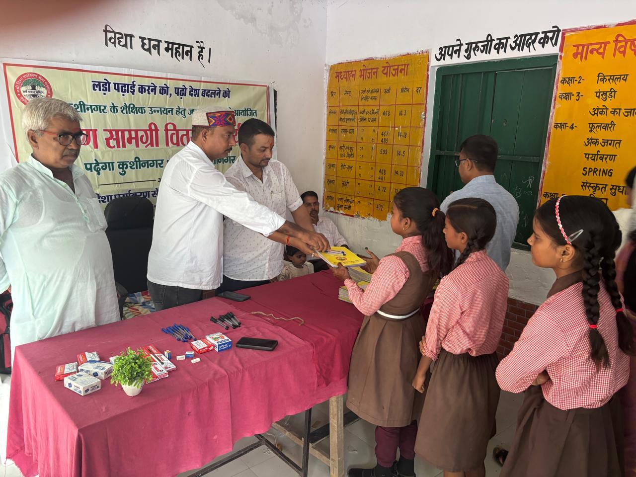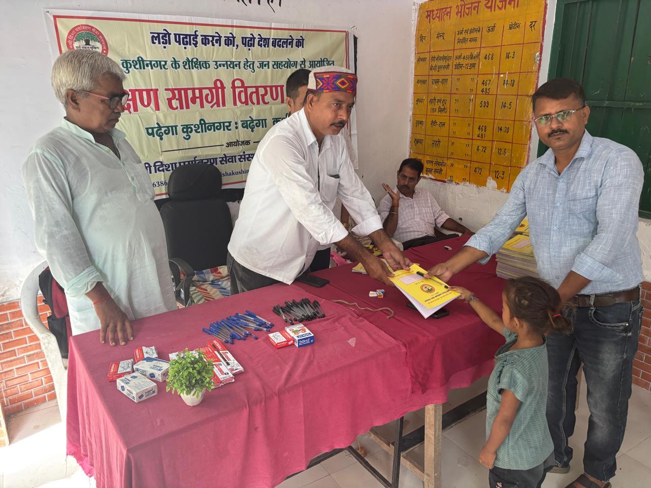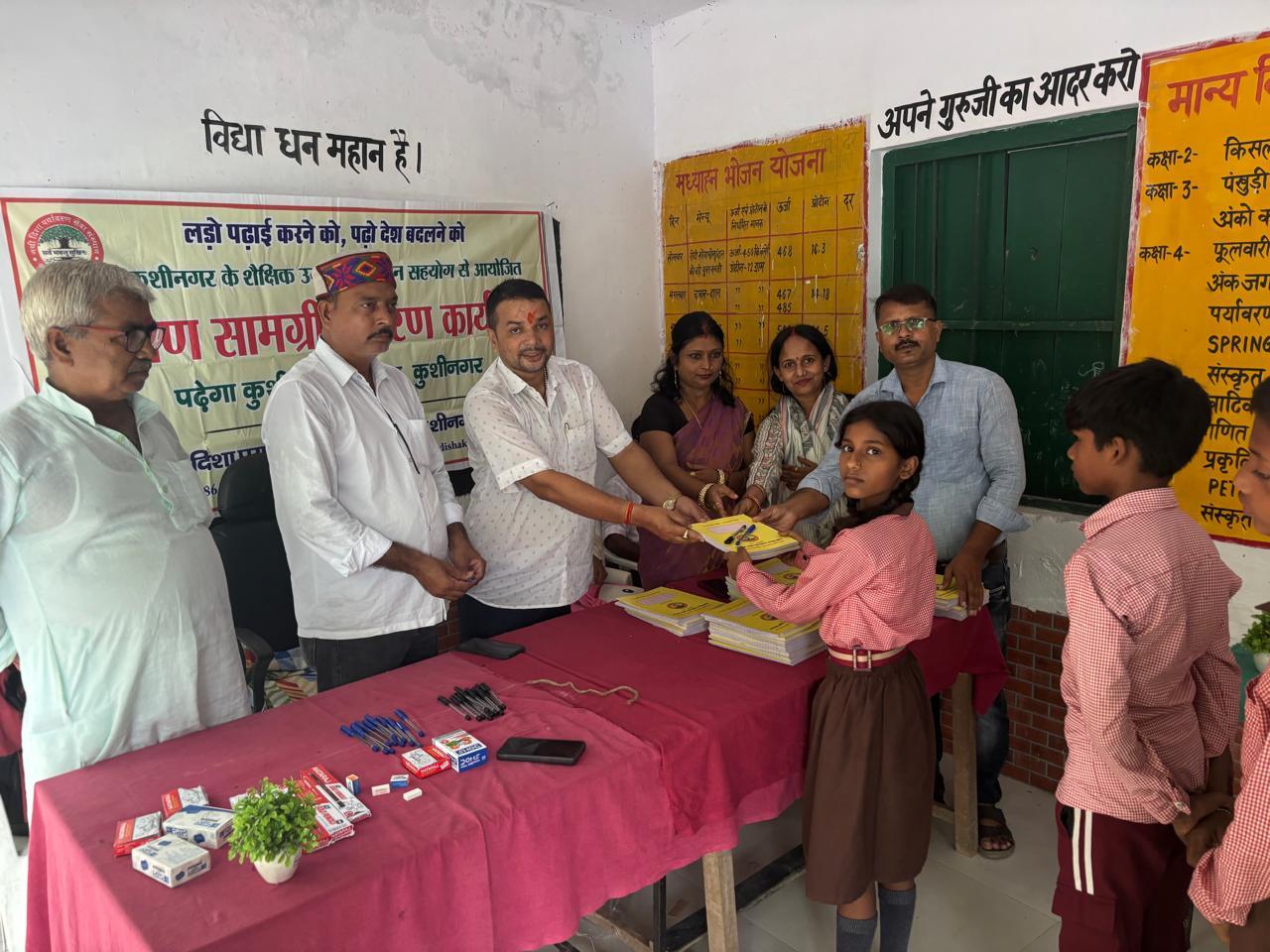 संस्थान द्वारा पढ़ेगा कुशीनगर, बढ़ेगा कुशीनगर की भावना के साथ जन सहयोग से चलाये जा रहे शिक्षण सामग्री वितरण कार्यक्रम के क्रम में हाटा विकास खण्ड स्थित संविलियन विद्यालय खड्डा में विद्यार्थियों को कॉपी, कलम, पेंसिल, रबर, कटर आदि शिक्षण सामग्री भेंट कर पढ़ने व आगे बढ़ने हेतु प्रोत्साहित किया गया।