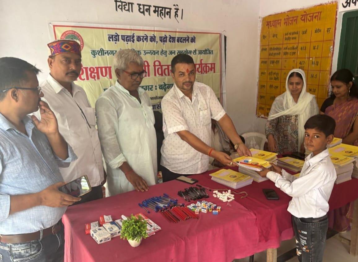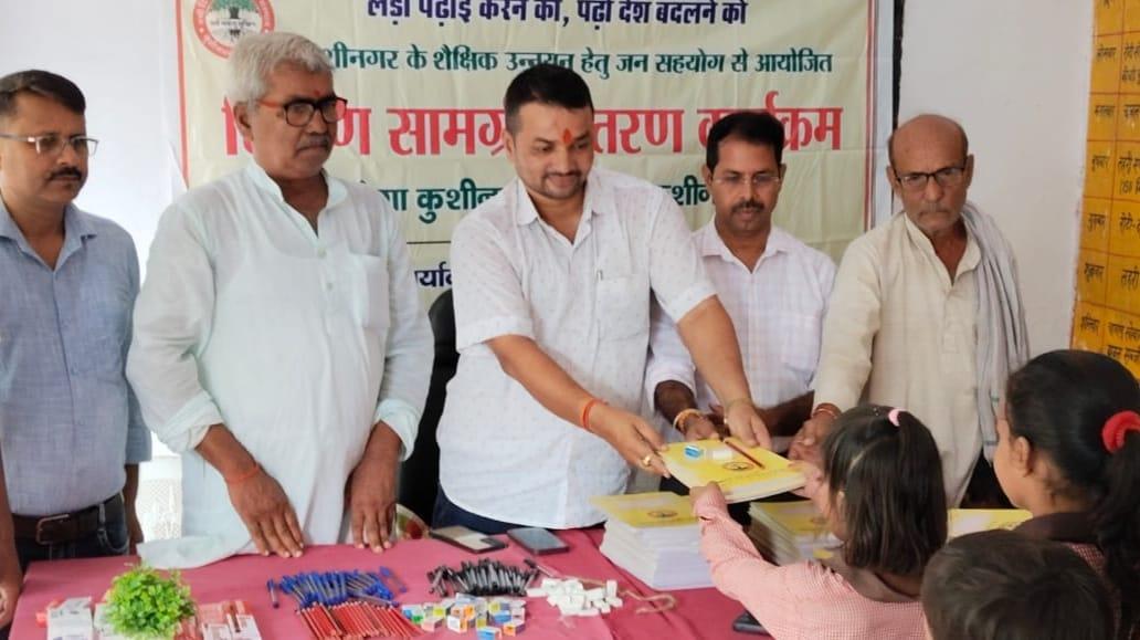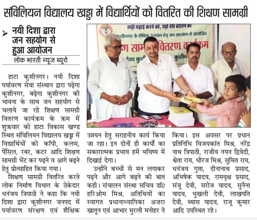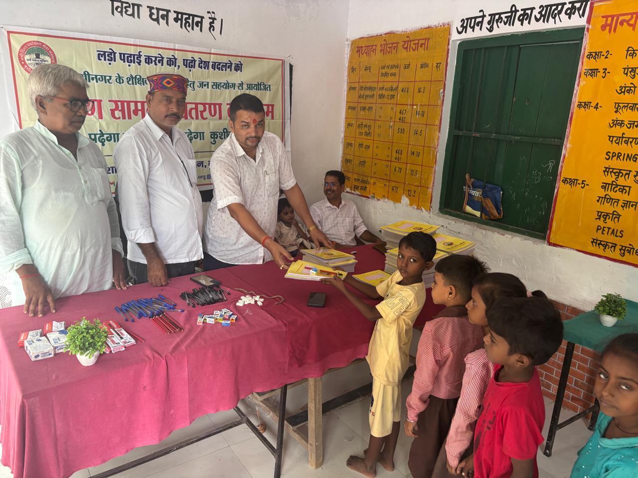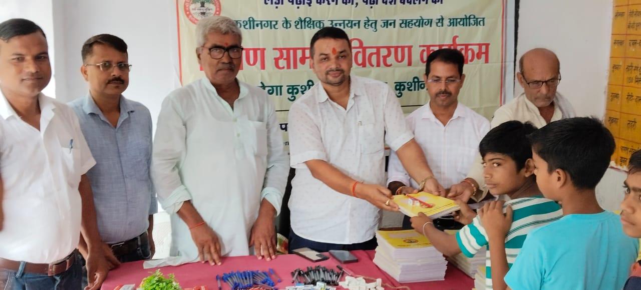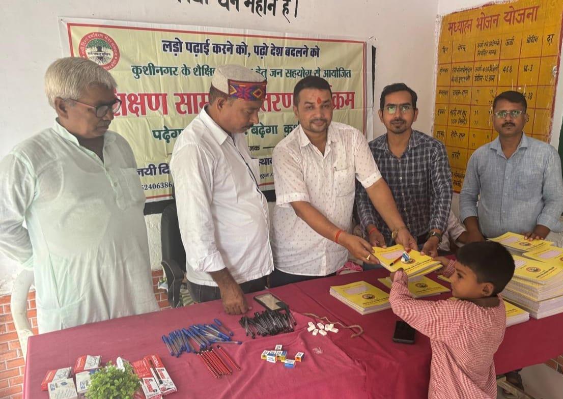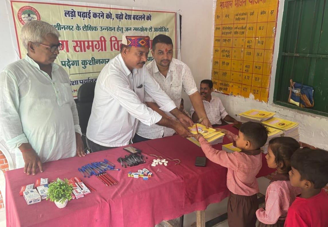 संस्थान द्वारा पढ़ेगा कुशीनगर, बढ़ेगा कुशीनगर की भावना के साथ जन सहयोग से चलाये जा रहे शिक्षण सामग्री वितरण कार्यक्रम के क्रम में हाटा विकास खण्ड स्थित संविलियन विद्यालय खड्डा में विद्यार्थियों को कॉपी, कलम, पेंसिल, रबर, कटर आदि शिक्षण सामग्री भेंट कर पढ़ने व आगे बढ़ने हेतु प्रोत्साहित किया गया।