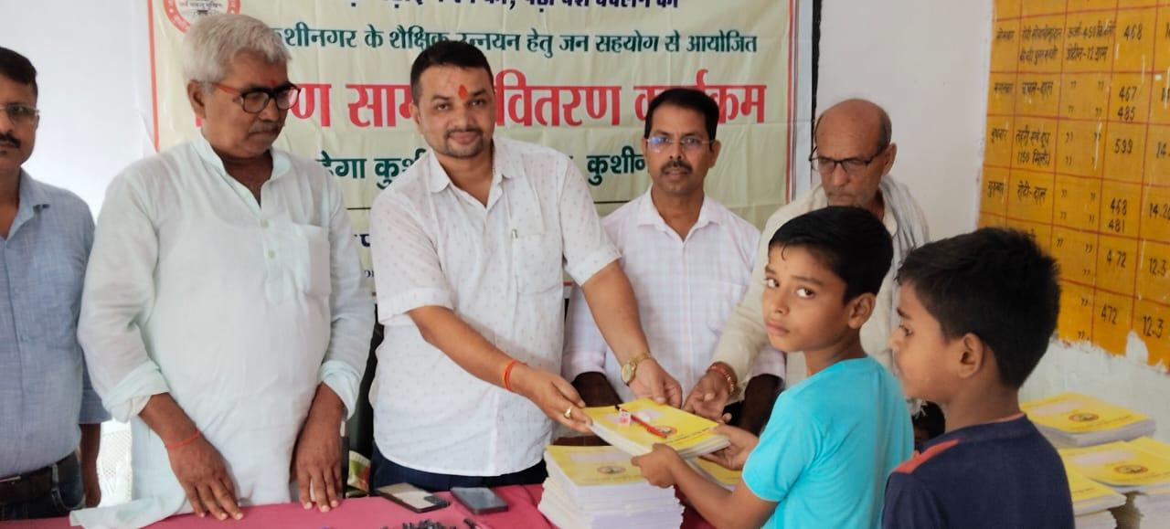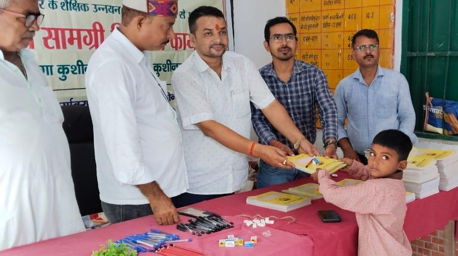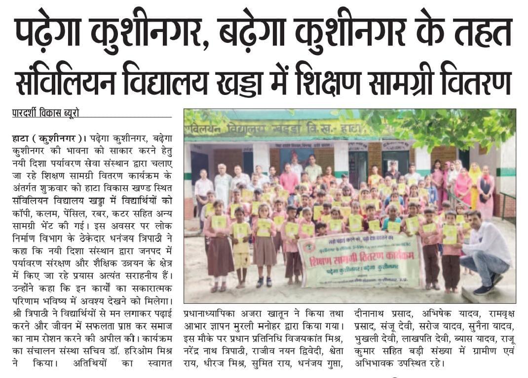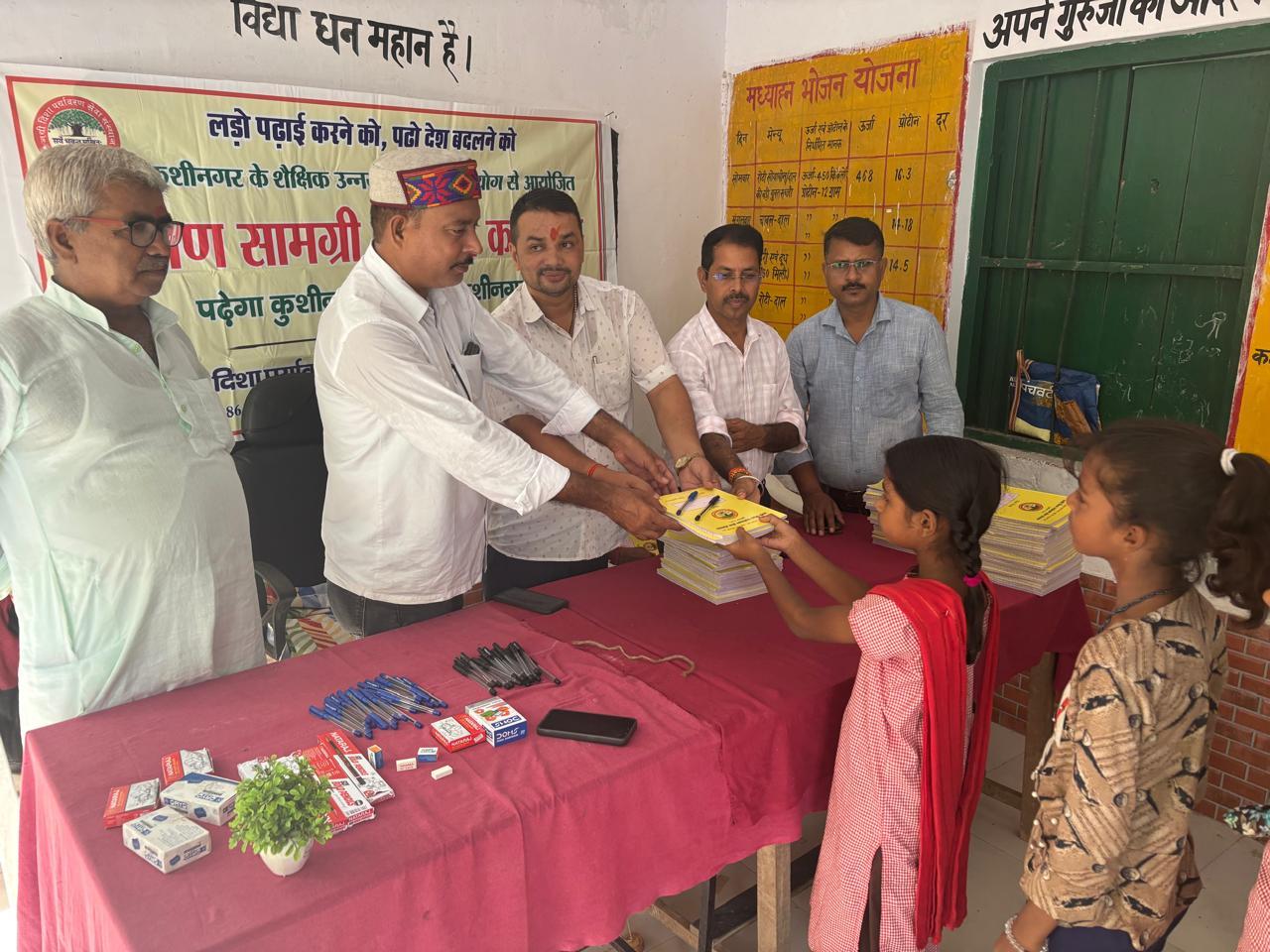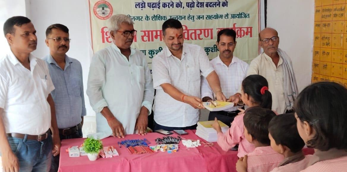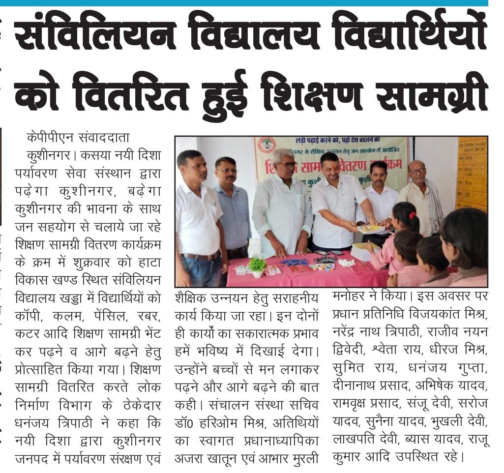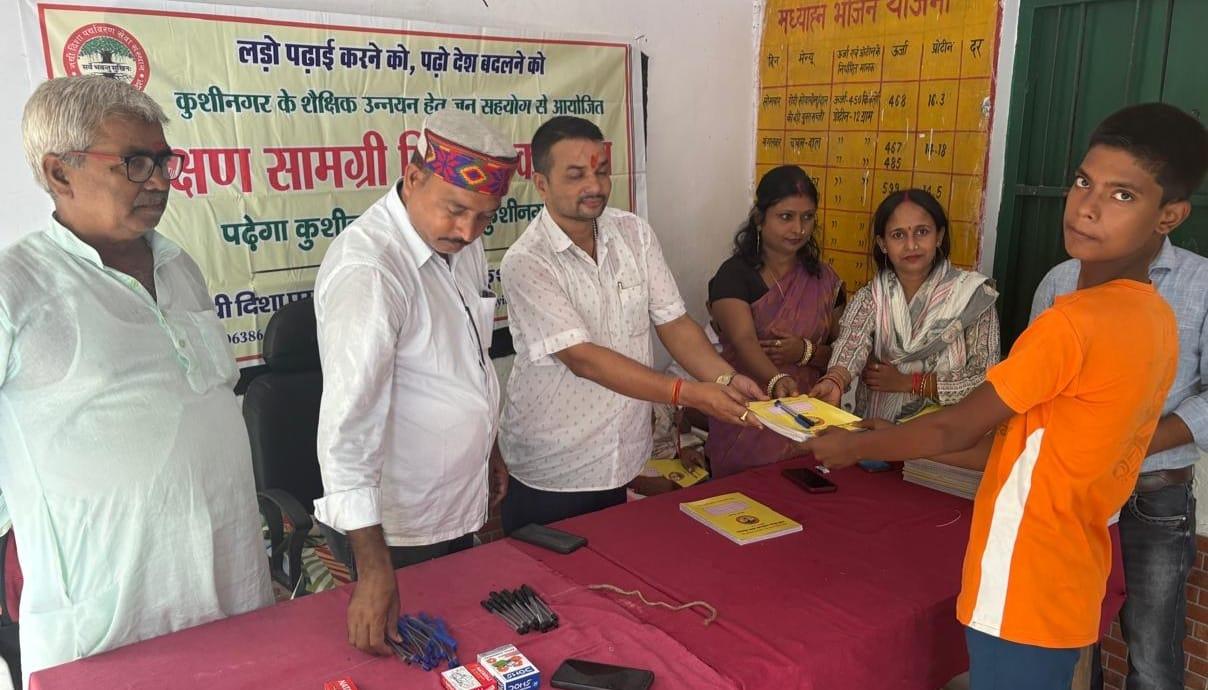 संस्थान द्वारा पढ़ेगा कुशीनगर, बढ़ेगा कुशीनगर की भावना के साथ जन सहयोग से चलाये जा रहे शिक्षण सामग्री वितरण कार्यक्रम के क्रम में हाटा विकास खण्ड स्थित संविलियन विद्यालय खड्डा में विद्यार्थियों को कॉपी, कलम, पेंसिल, रबर, कटर आदि शिक्षण सामग्री भेंट कर पढ़ने व आगे बढ़ने हेतु प्रोत्साहित किया गया।