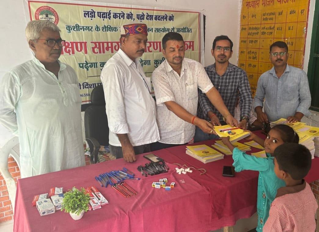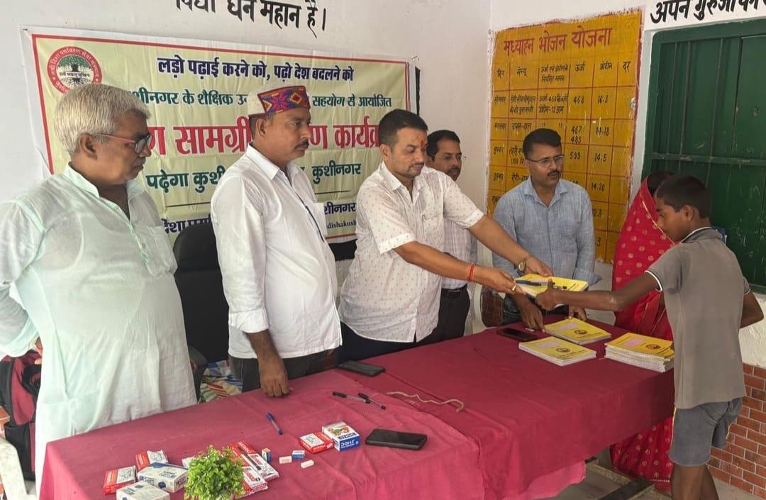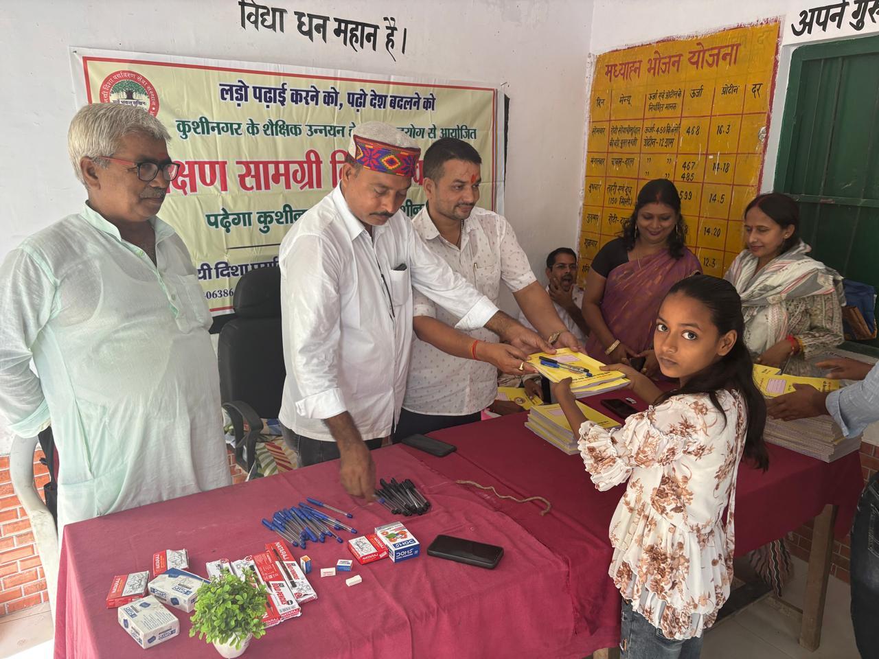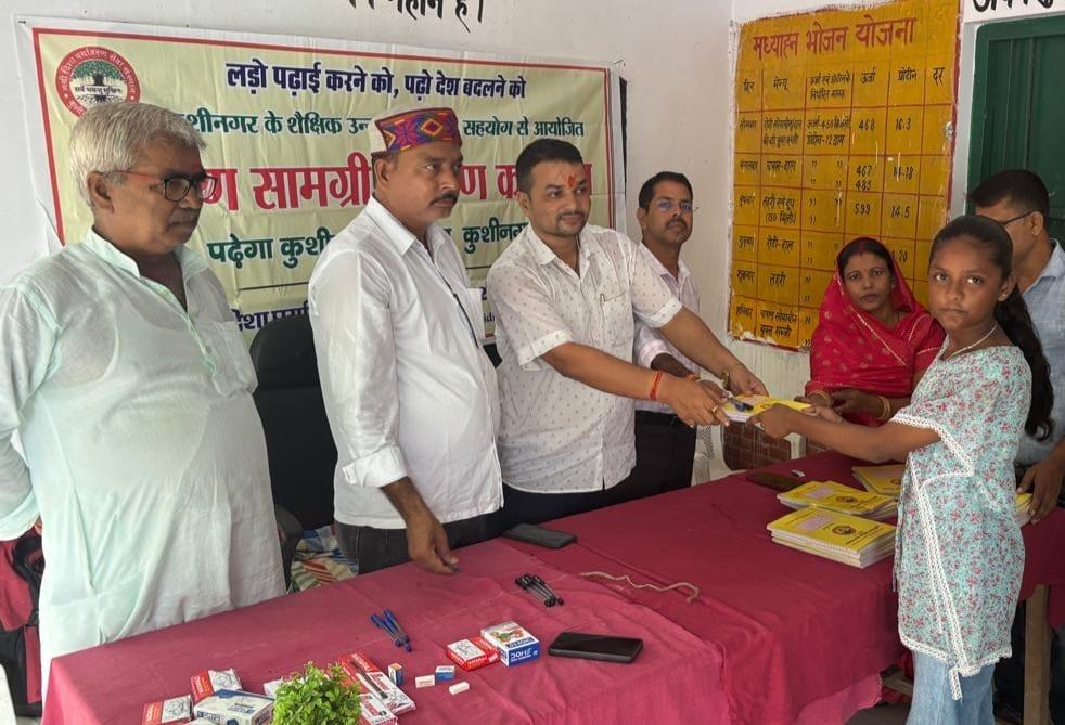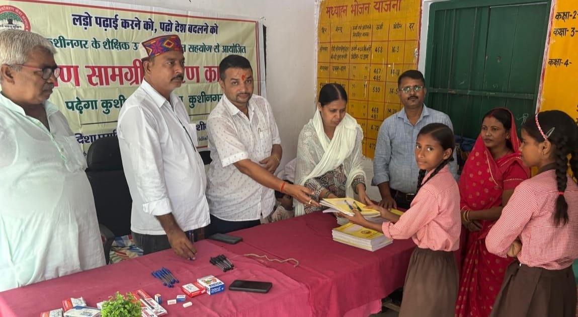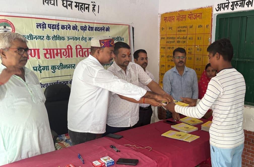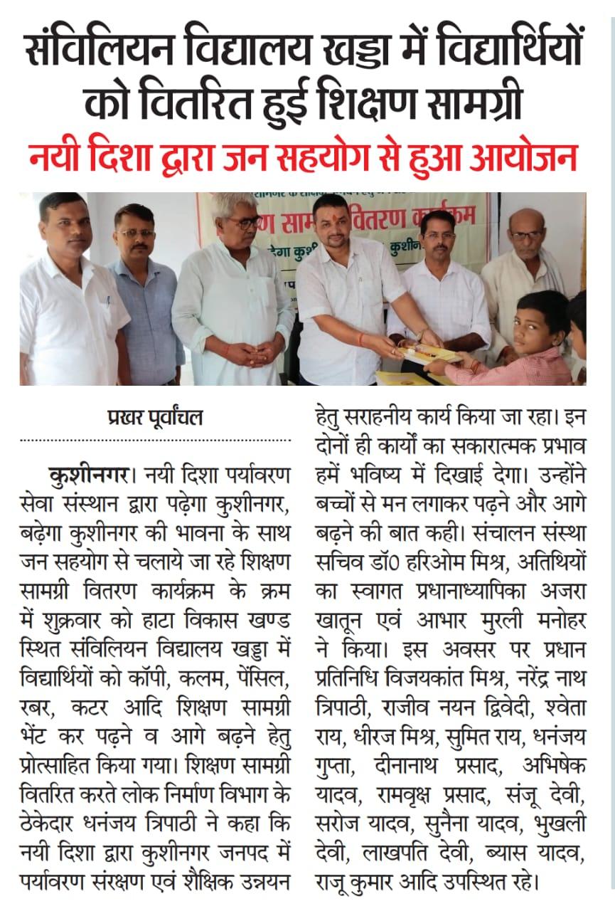 संस्थान द्वारा पढ़ेगा कुशीनगर, बढ़ेगा कुशीनगर की भावना के साथ जन सहयोग से चलाये जा रहे शिक्षण सामग्री वितरण कार्यक्रम के क्रम में हाटा विकास खण्ड स्थित संविलियन विद्यालय खड्डा में विद्यार्थियों को कॉपी, कलम, पेंसिल, रबर, कटर आदि शिक्षण सामग्री भेंट कर पढ़ने व आगे बढ़ने हेतु प्रोत्साहित किया गया।