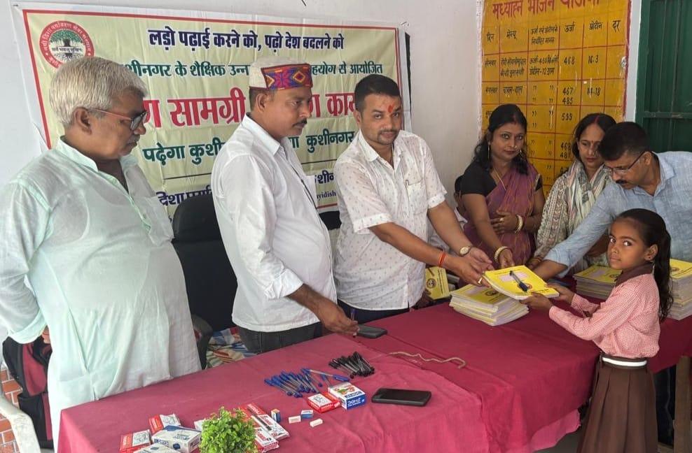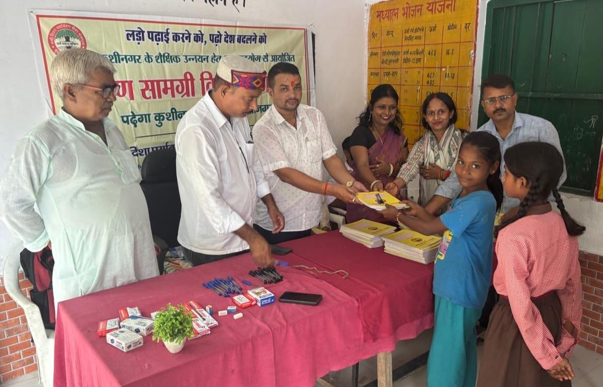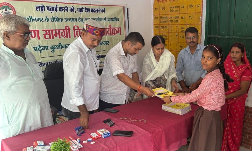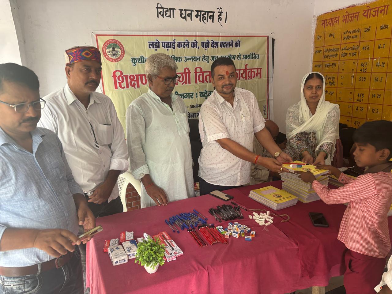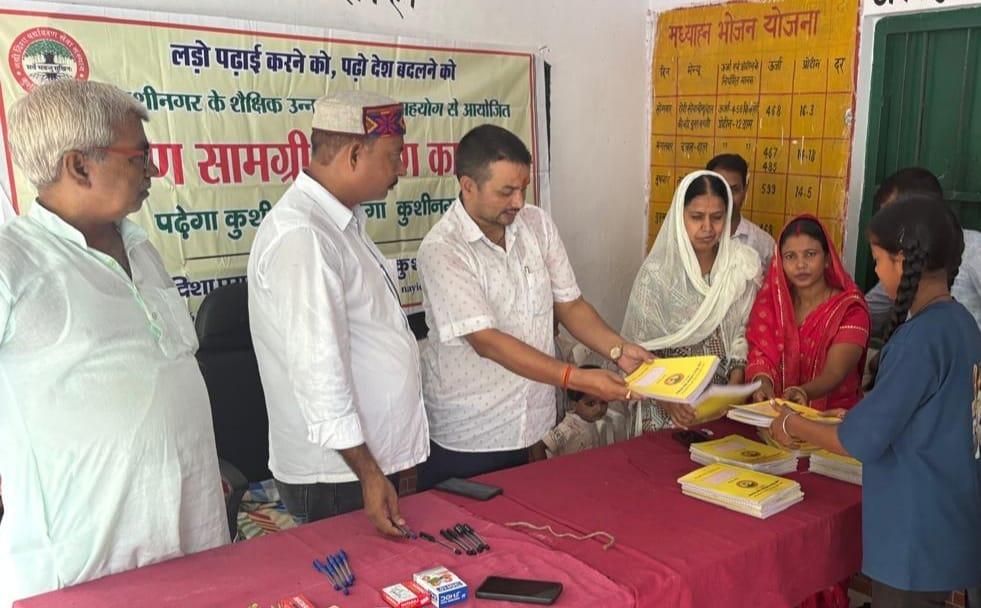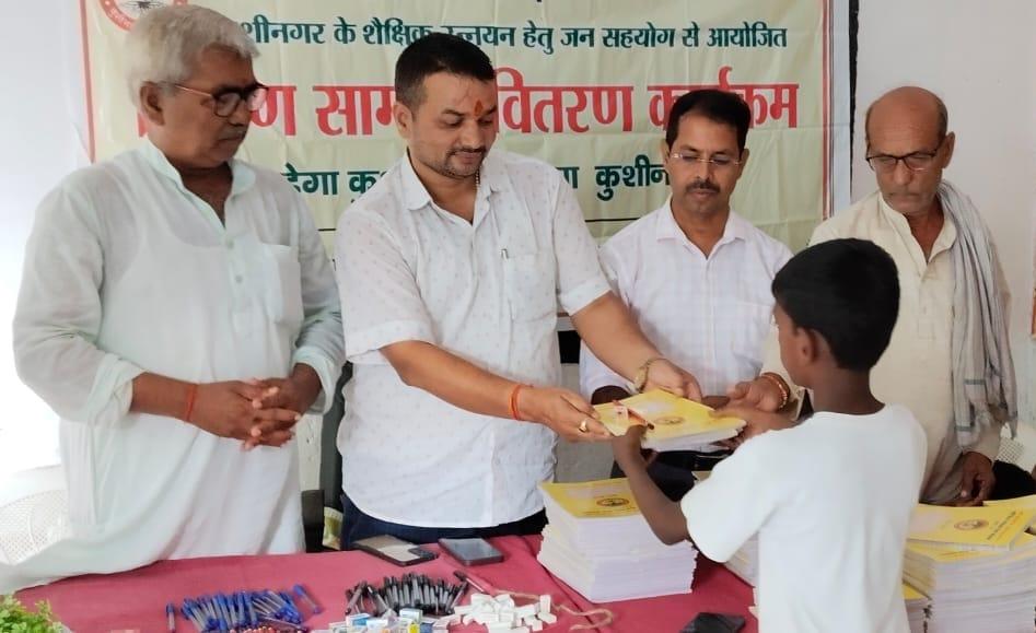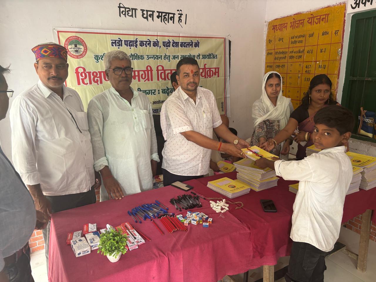 संस्थान द्वारा पढ़ेगा कुशीनगर, बढ़ेगा कुशीनगर की भावना के साथ जन सहयोग से चलाये जा रहे शिक्षण सामग्री वितरण कार्यक्रम के क्रम में हाटा विकास खण्ड स्थित संविलियन विद्यालय खड्डा में विद्यार्थियों को कॉपी, कलम, पेंसिल, रबर, कटर आदि शिक्षण सामग्री भेंट कर पढ़ने व आगे बढ़ने हेतु प्रोत्साहित किया गया।