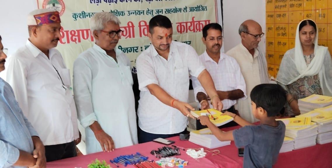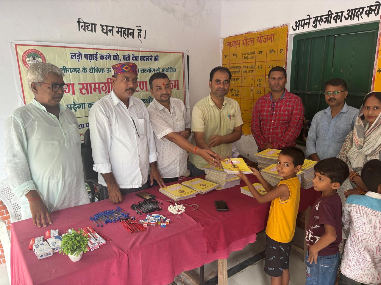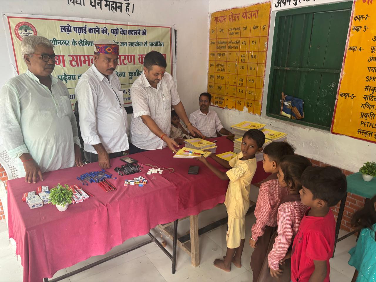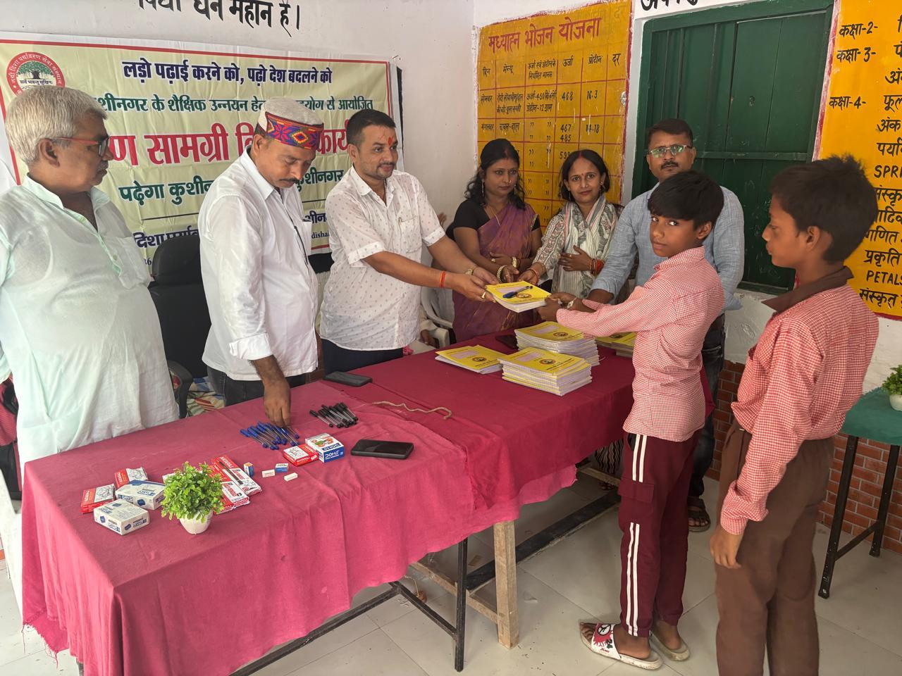संविलियन विद्यालय खड्डा में विद्यार्थियों को वितरित हुई शिक्षण सामग्री।