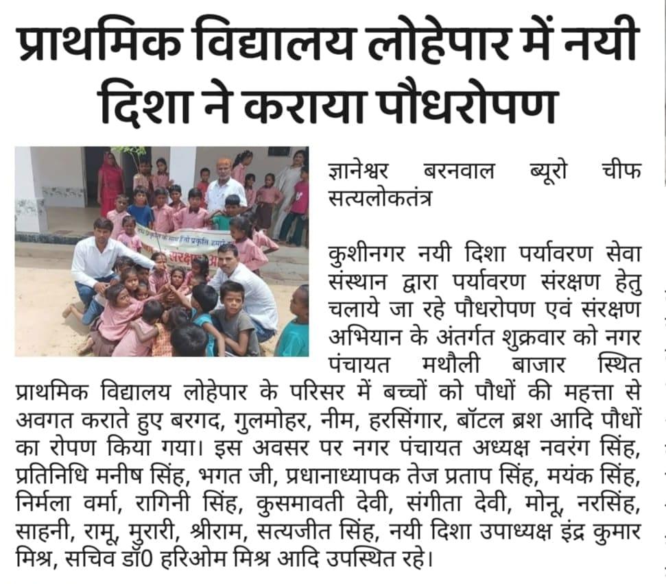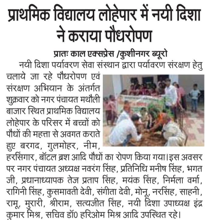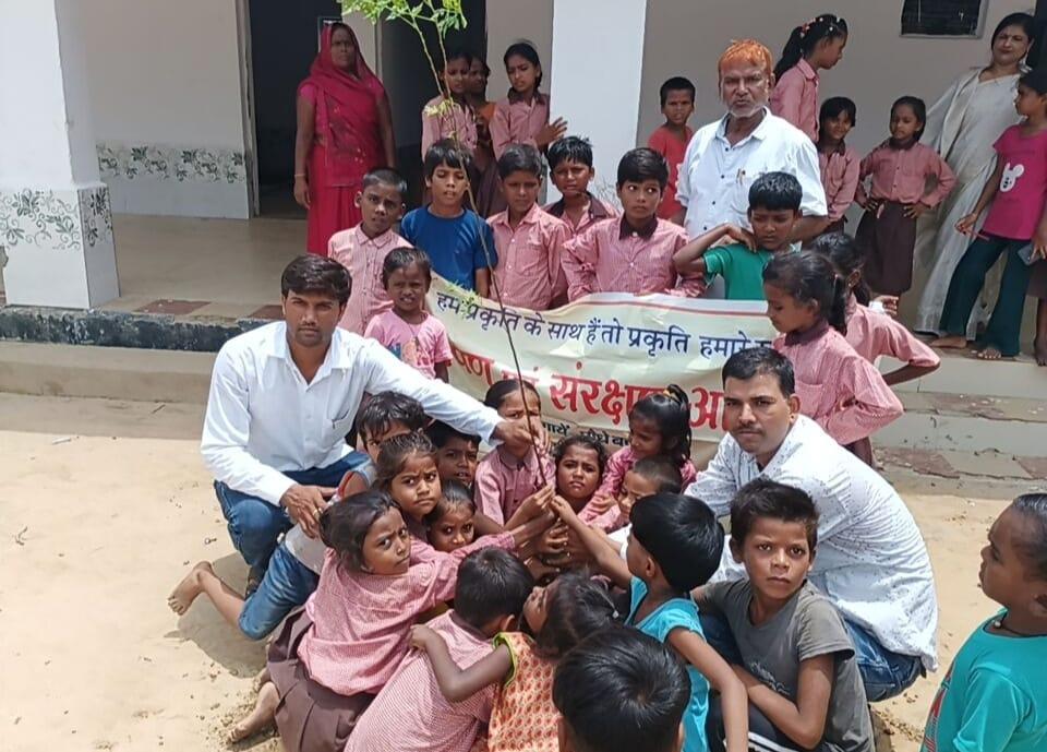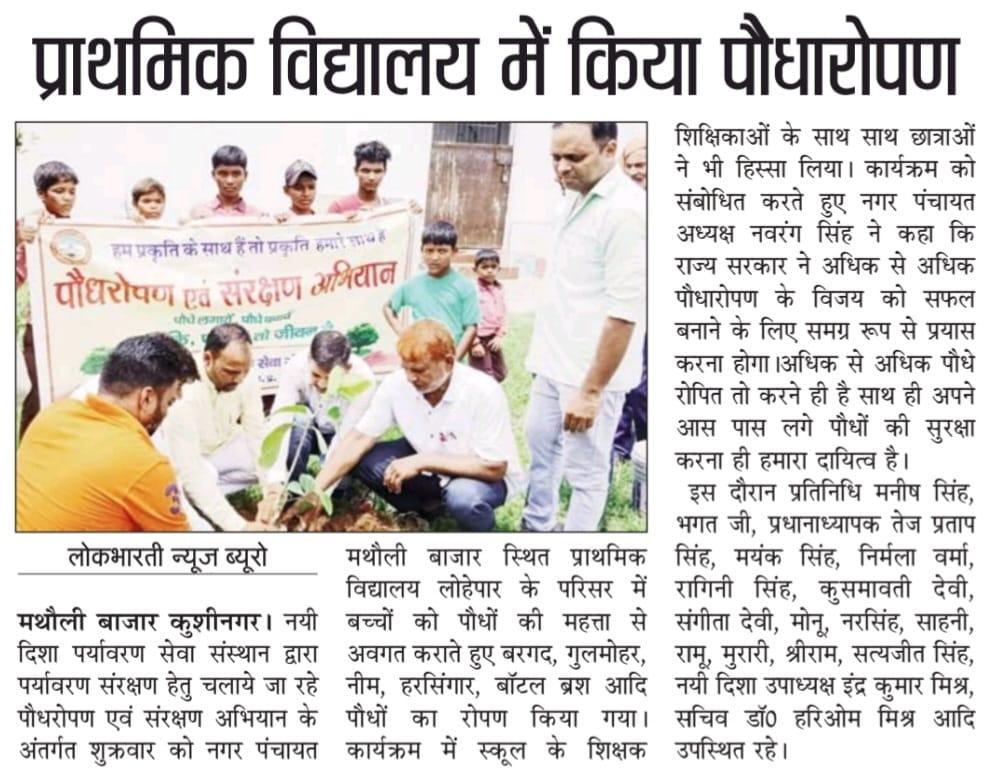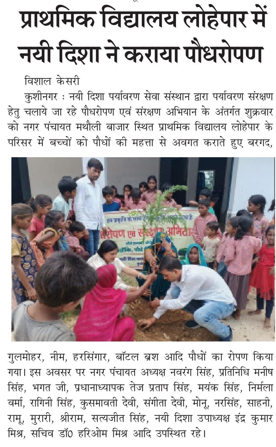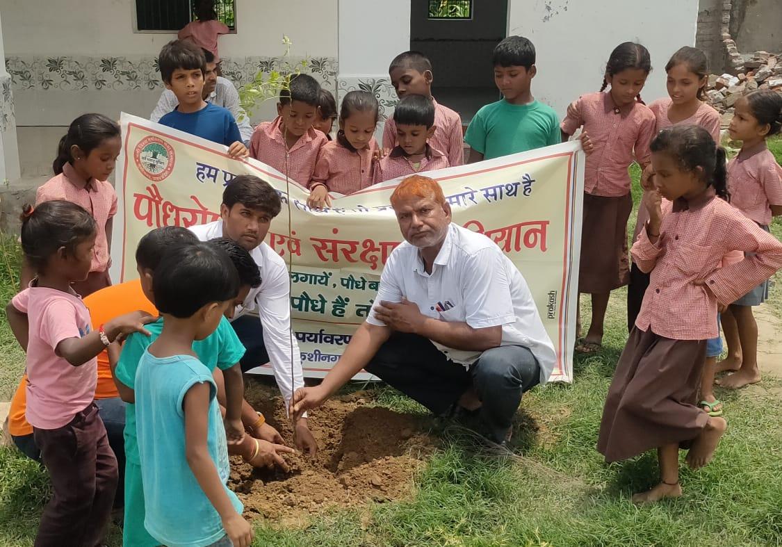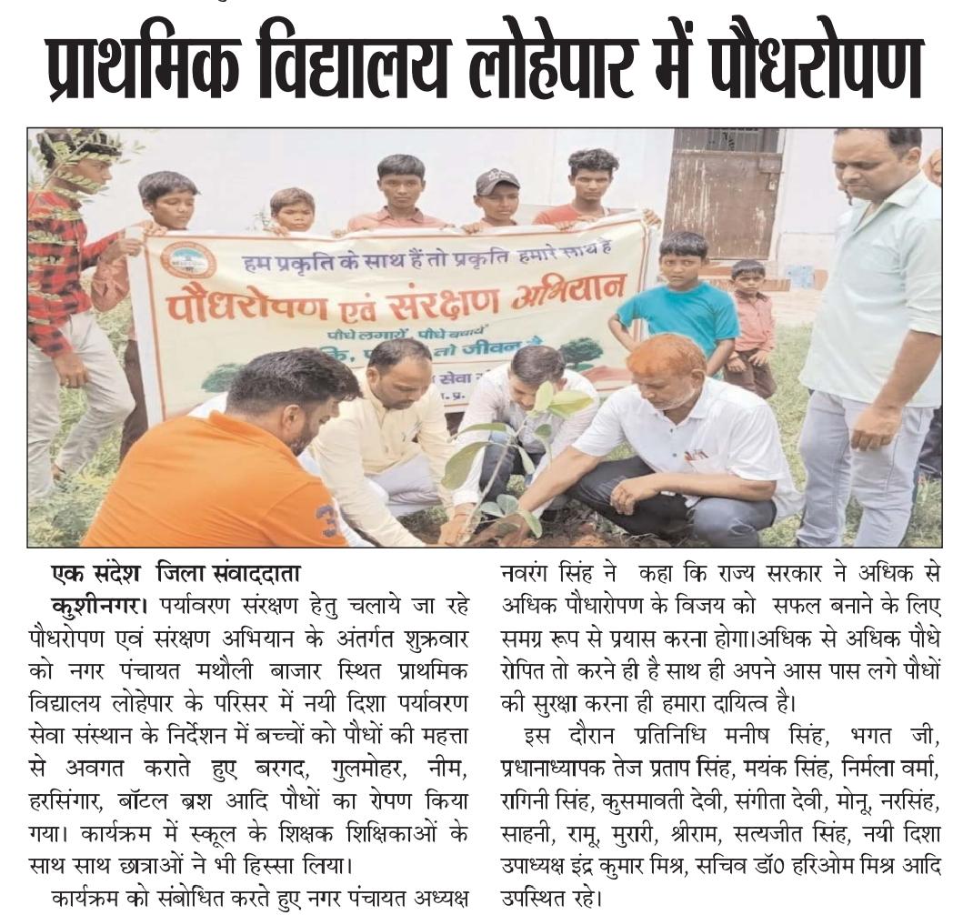 संस्थान द्वारा पर्यावरण संरक्षण हेतु चलाये जा रहे पौधरोपण एवं संरक्षण अभियान के अंतर्गत नगर पंचायत मथौली बाजार स्थित संविलियन विद्यालय लोहेपार के परिसर में बच्चों को पौधों की महत्ता से अवगत कराते हुए बरगद, गुलमोहर, नीम, हरसिंगार, बॉटल ब्रश आदि पौधों का रोपण किया गया।