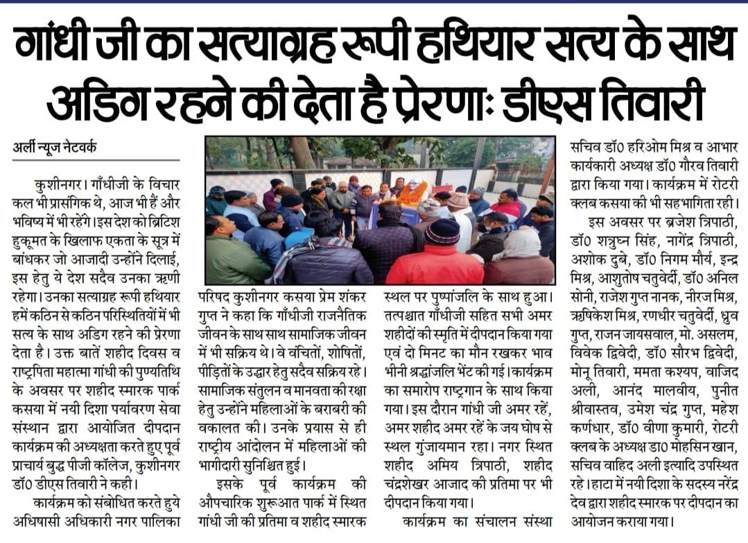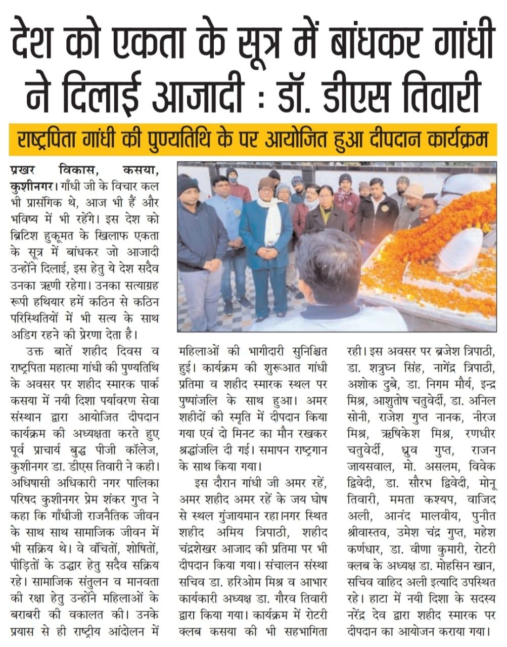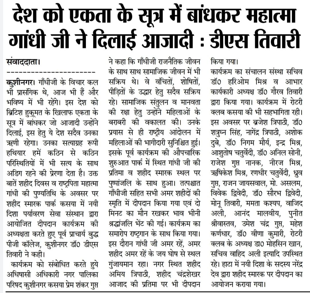 संस्थान द्वारा शहीद दिवस के अवसर पर कुशीनगर जनपद के कसया नगर स्थित राष्ट्रपिता महात्मा गांधी जी की प्रतिमा, शहीद स्मारक स्थल एवं अन्य शहीद प्रतिमाओं के समक्ष दीपदान का आयोजन कर गांधी जी सहित अमर शहीदों/ राष्ट्र सपूतों को श्रद्धांजलि भेंट किया गया।