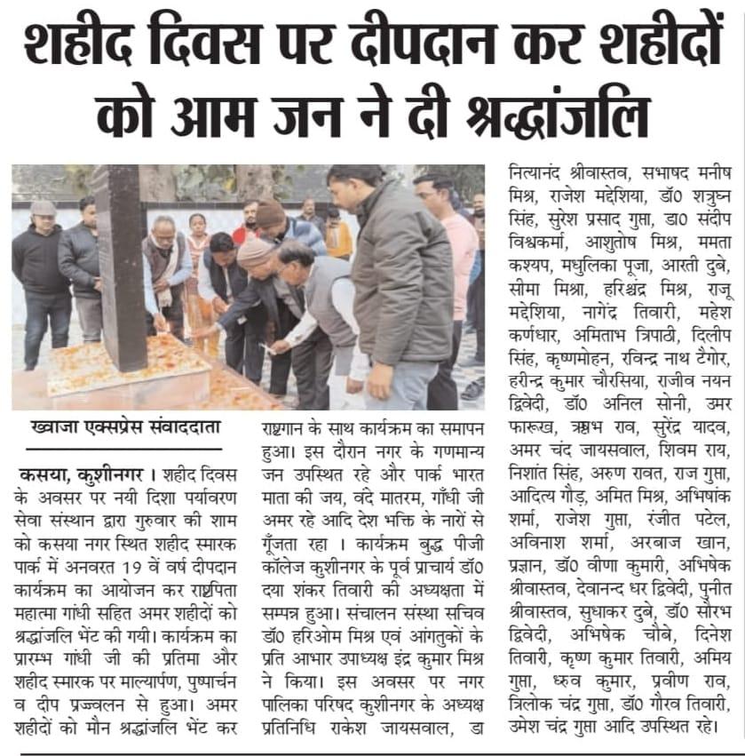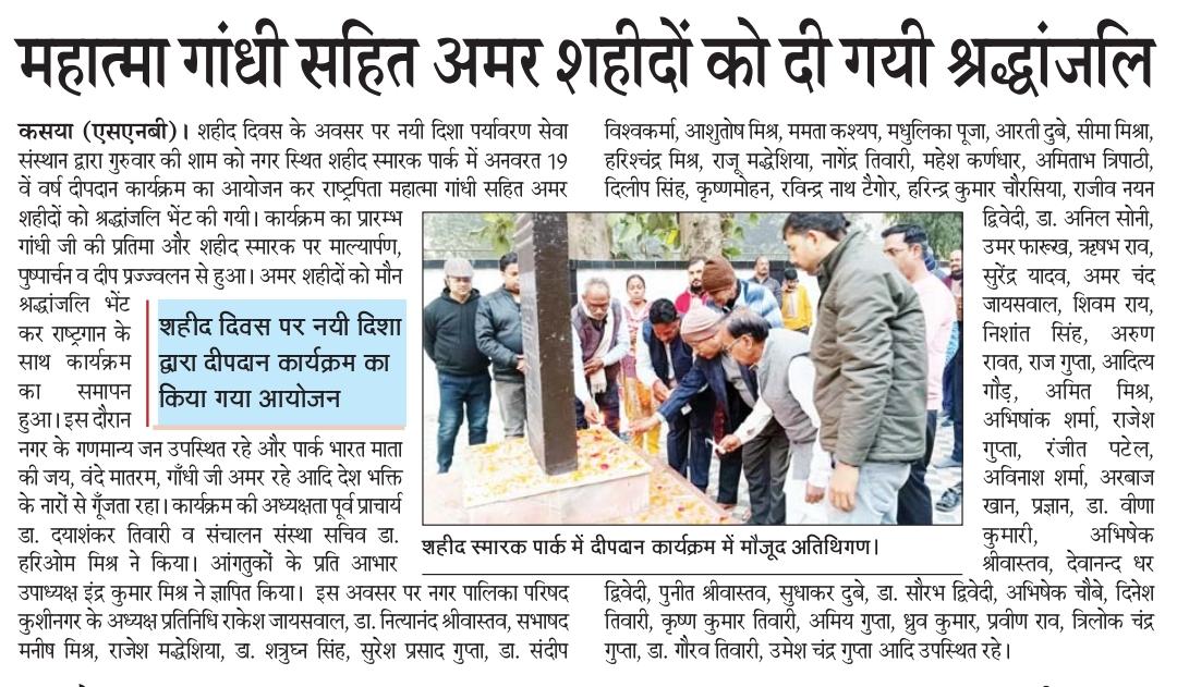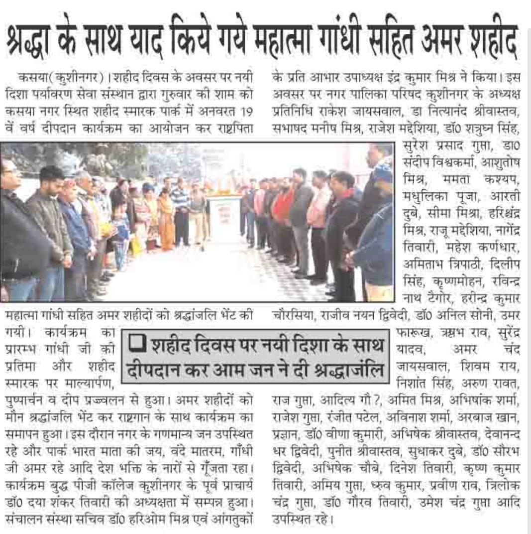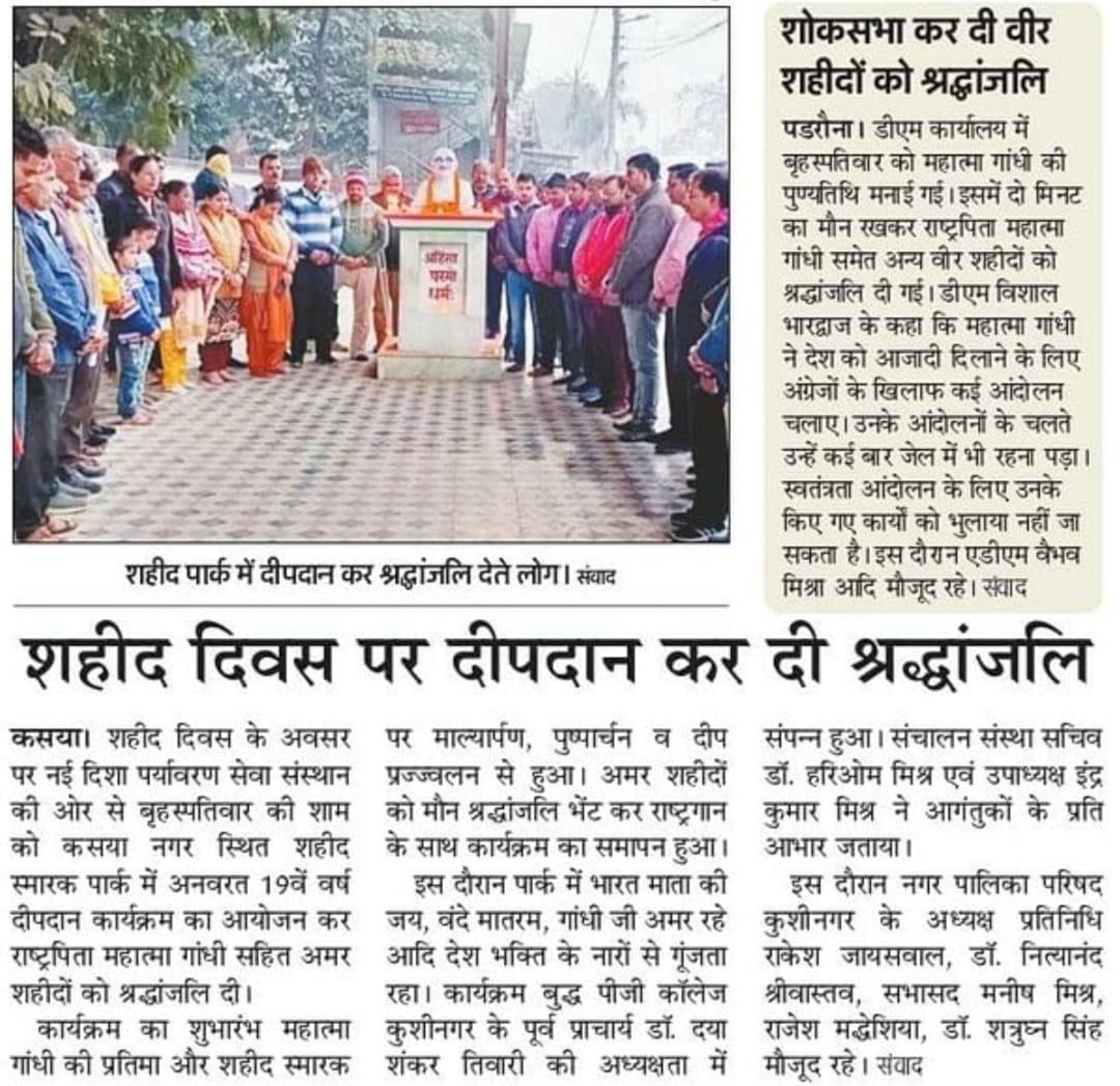 शहीद दिवस के अवसर पर संस्थान द्वारा कसया नगर स्थित शहीद स्मारक पार्क में अनवरत 19 वें वर्ष सायंकाल दीपदान कार्यक्रम का आयोजन कर राष्ट्रपिता महात्मा गांधी सहित अमर शहीदों को श्रद्धांजलि भेंट किया गया। कार्यक्रम बुद्ध पीजी कॉलेज कुशीनगर के पूर्व प्राचार्य गुरुवर डॉ0 दया शंकर तिवारी की अध्यक्षता में सम्पन्न हुआ।