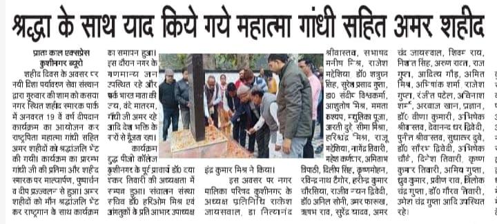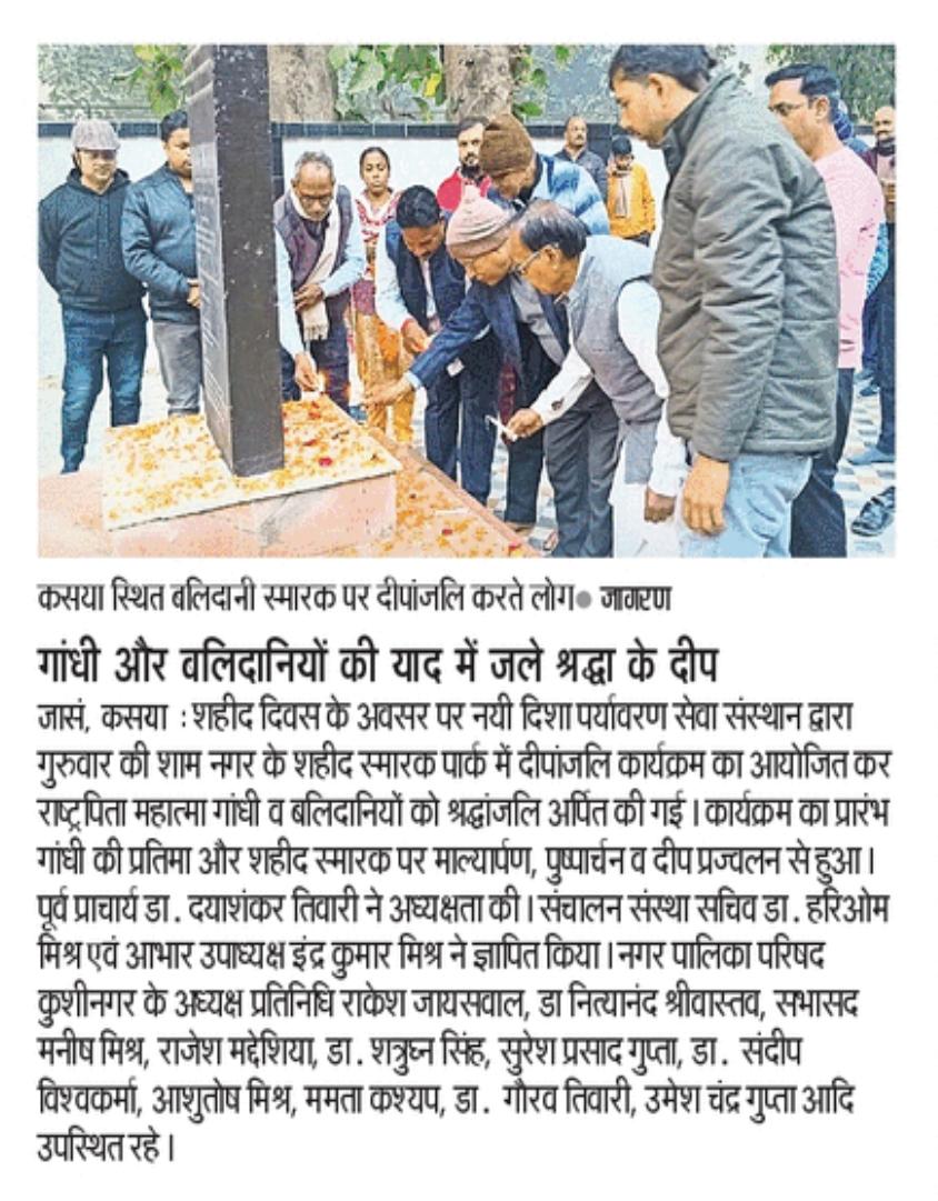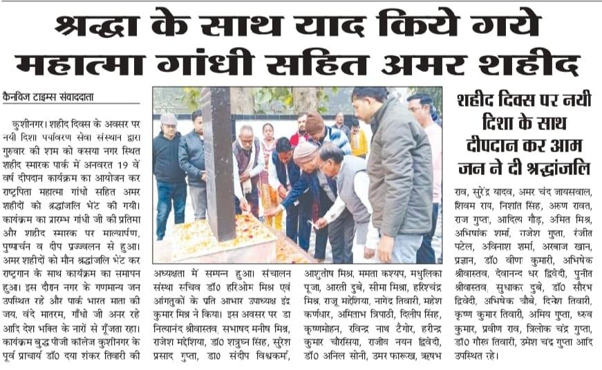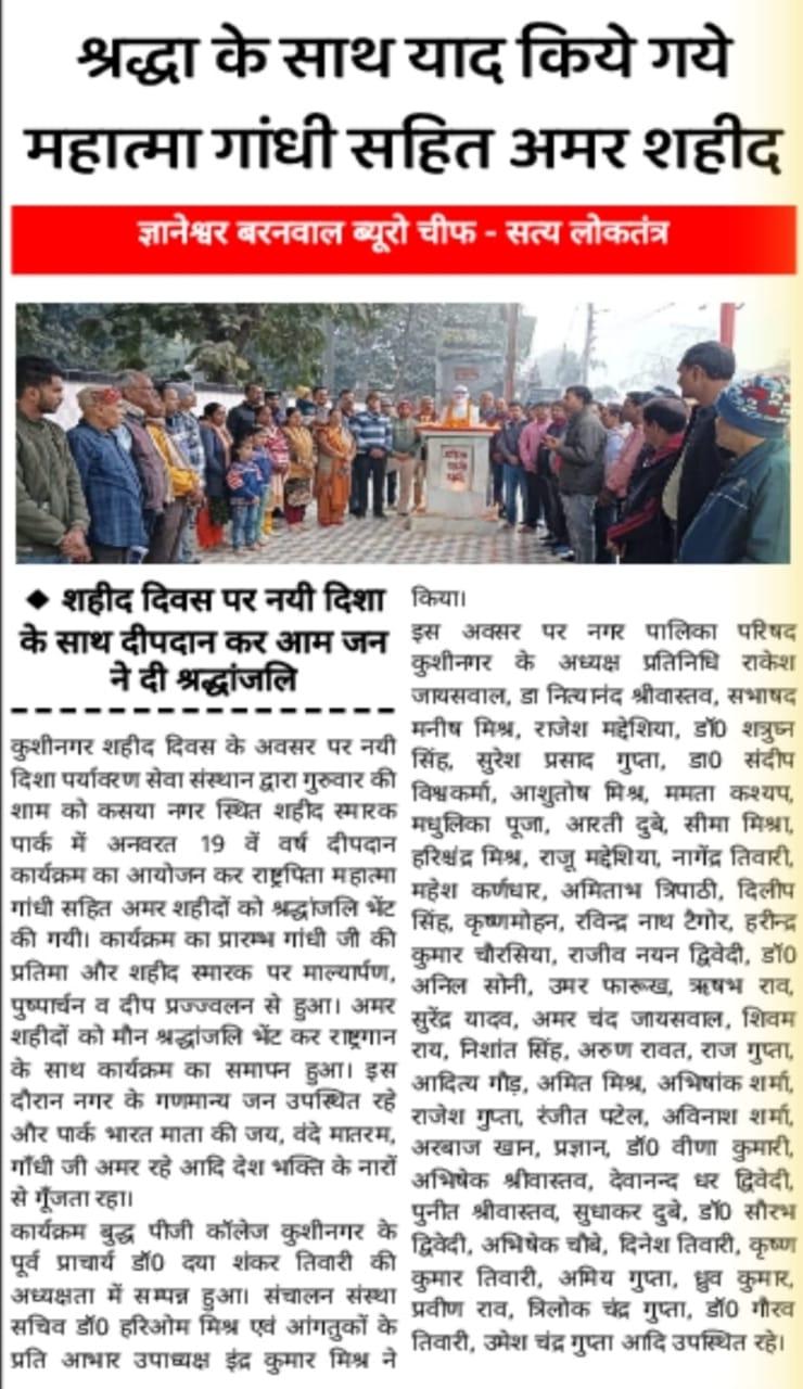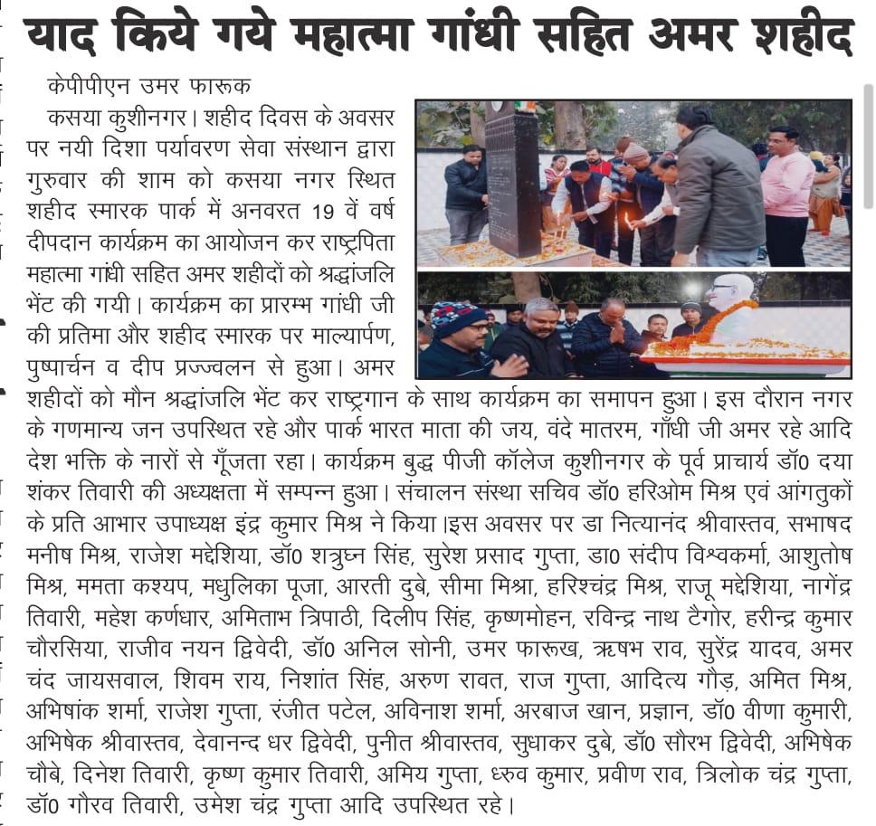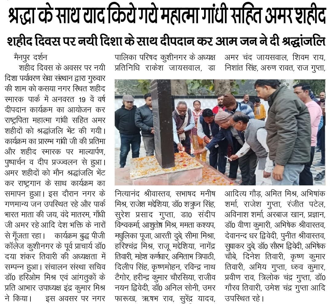 शहीद दिवस के अवसर पर संस्थान द्वारा कसया नगर स्थित शहीद स्मारक पार्क में अनवरत 19 वें वर्ष सायंकाल दीपदान कार्यक्रम का आयोजन कर राष्ट्रपिता महात्मा गांधी सहित अमर शहीदों को श्रद्धांजलि भेंट किया गया। कार्यक्रम बुद्ध पीजी कॉलेज कुशीनगर के पूर्व प्राचार्य गुरुवर डॉ0 दया शंकर तिवारी की अध्यक्षता में सम्पन्न हुआ।