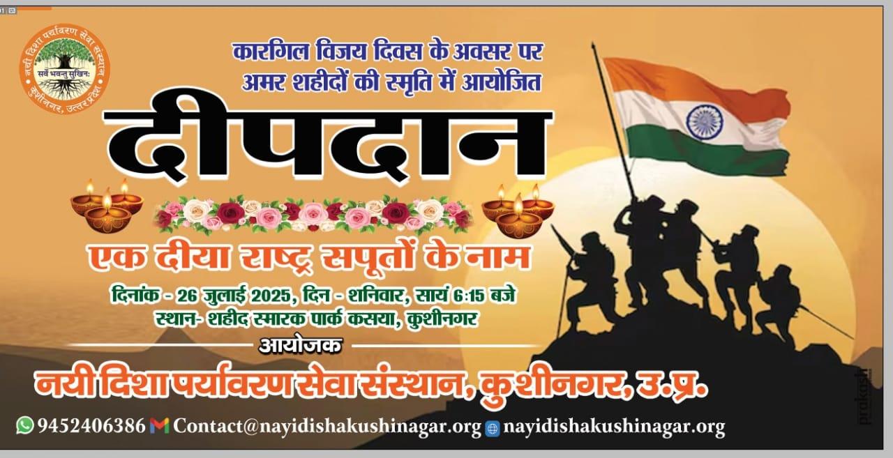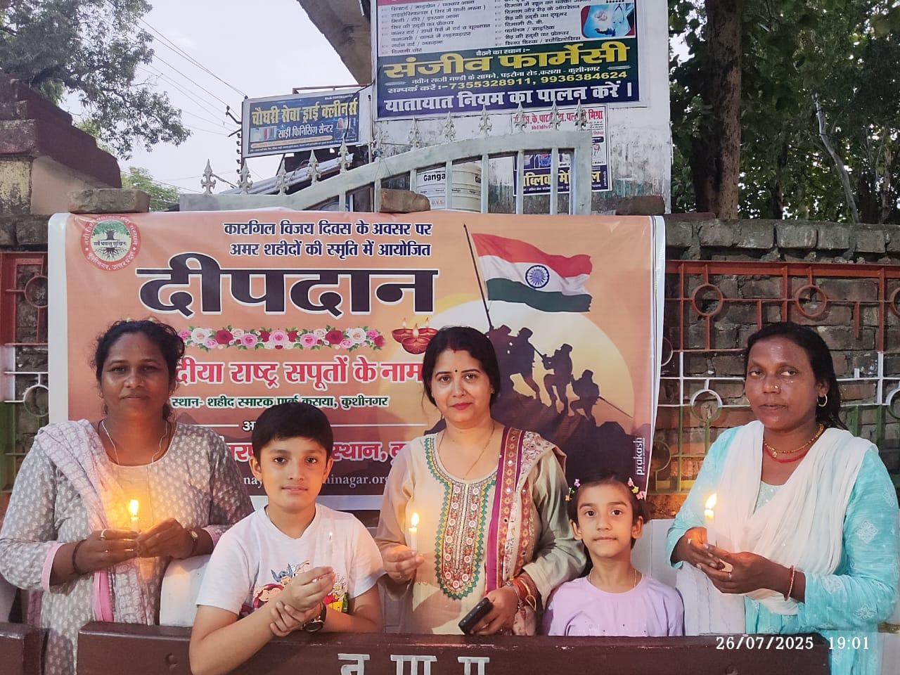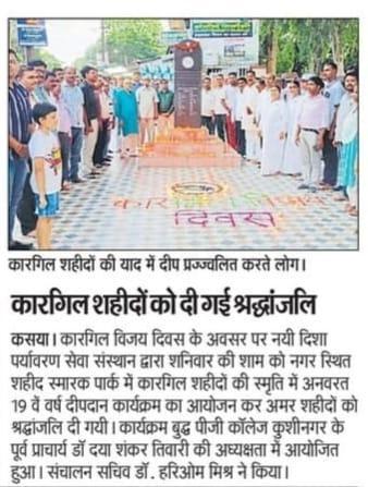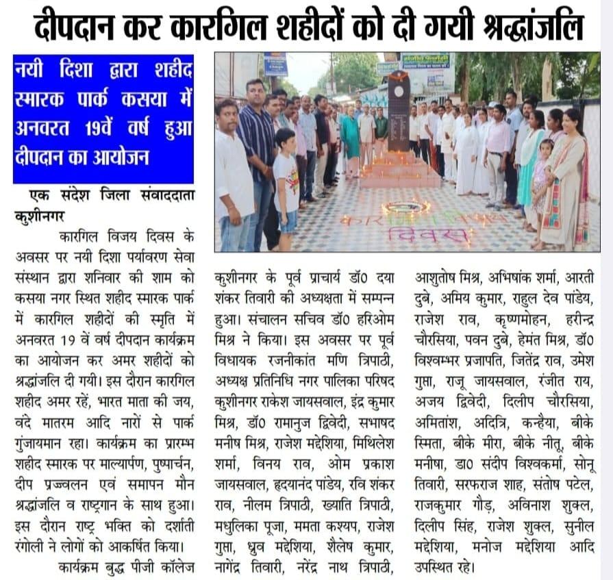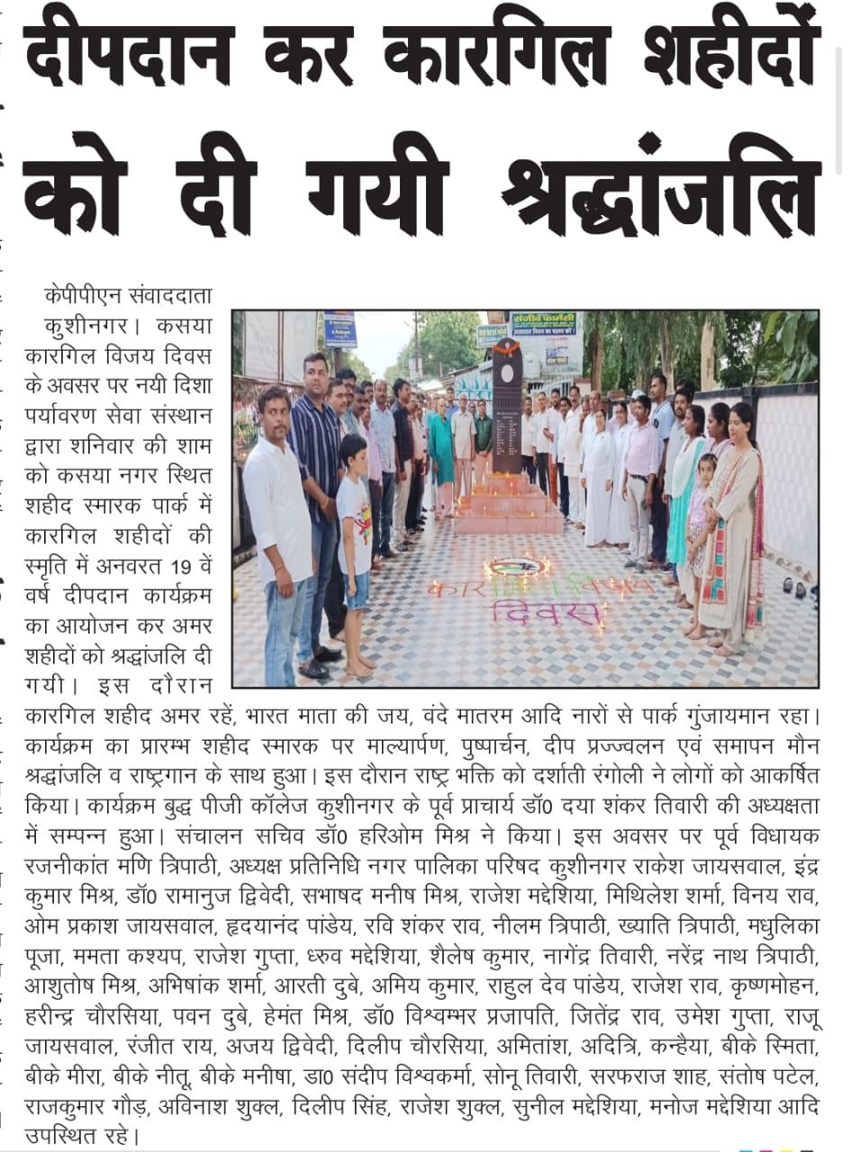 कारगिल विजय दिवस के अवसर पर संस्थान द्वारा कसया नगर स्थित शहीद स्मारक पार्क में कारगिल शहीदों की स्मृति में अनवरत 19 वें वर्ष दीपदान कार्यक्रम का आयोजन कर अमर शहीदों को श्रद्धांजलि दी गयी। इस दौरान कारगिल शहीद अमर रहें, भारत माता की जय, वंदे मातरम आदि नारों से पार्क गुंजायमान रहा। कार्यक्रम का प्रारम्भ शहीद स्मारक पर माल्यार्पण, पुष्पार्चन, दीप प्रज्ज्वलन एवं समापन मौन श्रद्धांजलि व राष्ट्रगान के साथ हुआ। कसया नगर में स्थापित शहीद अमिय त्रिपाठी जी की प्रतिमा, गांधी जी की प्रतिमा एवं चंद्रशेखर आजाद जी की प्रतिमा के समक्ष भी दीपदान हुआ।