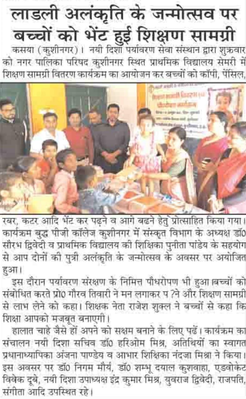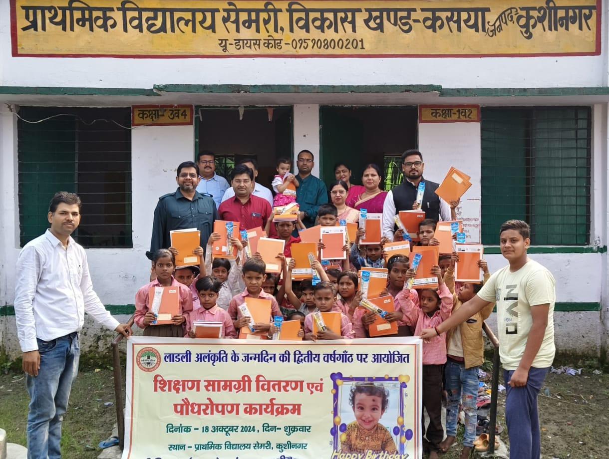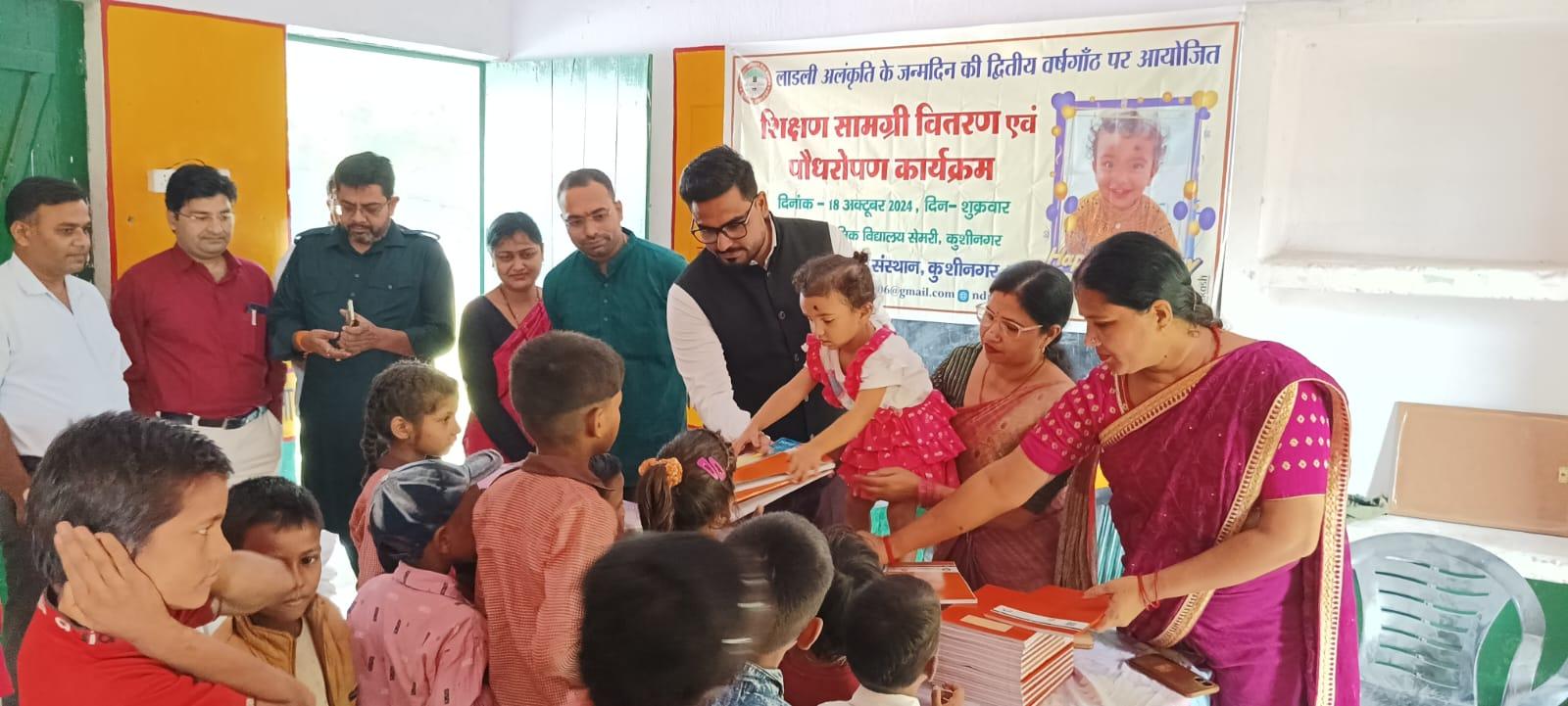 संस्थान द्वारा नगर पालिका परिषद कुशीनगर स्थित प्राथमिक विद्यालय सेमरी में बुद्ध पीजी कॉलेज कुशीनगर में संस्कृत विभाग के अध्यक्ष डॉ0 सौरभ द्विवेदी व प्राथमिक विद्यालय की शिक्षिका श्रीमती पुनीता पांडेय के सहयोग से आप दोनों की पुत्री अलंकृति के जन्मोत्सव के सुअवसर पर शिक्षण सामग्री वितरण कार्यक्रम का आयोजन कर बच्चों को कॉपी, पेंसिल, रबर, कटर आदि भेंट कर पढ़ने व आगे बढ़ने हेतु प्रोत्साहित किया गया। इस दौरान पर्यावरण संरक्षण के निमित्त पौधरोपण भी हुआ और बिटिया ने बच्चों के साथ केक भी काटा।