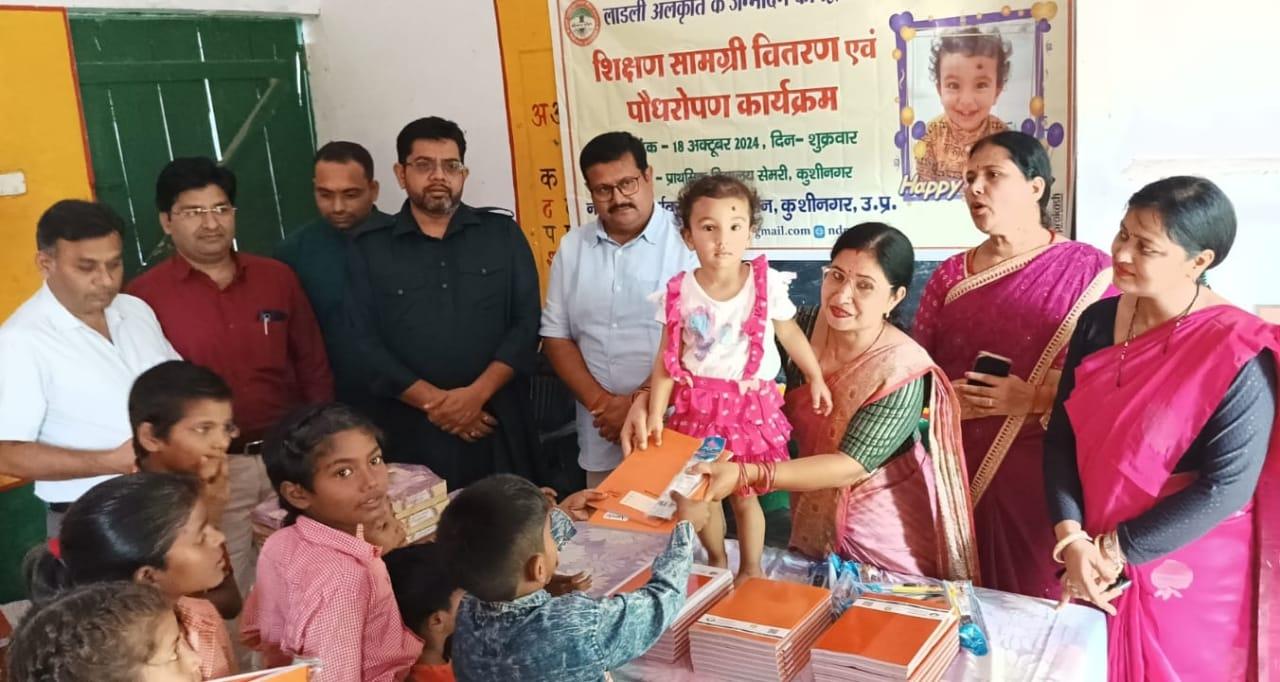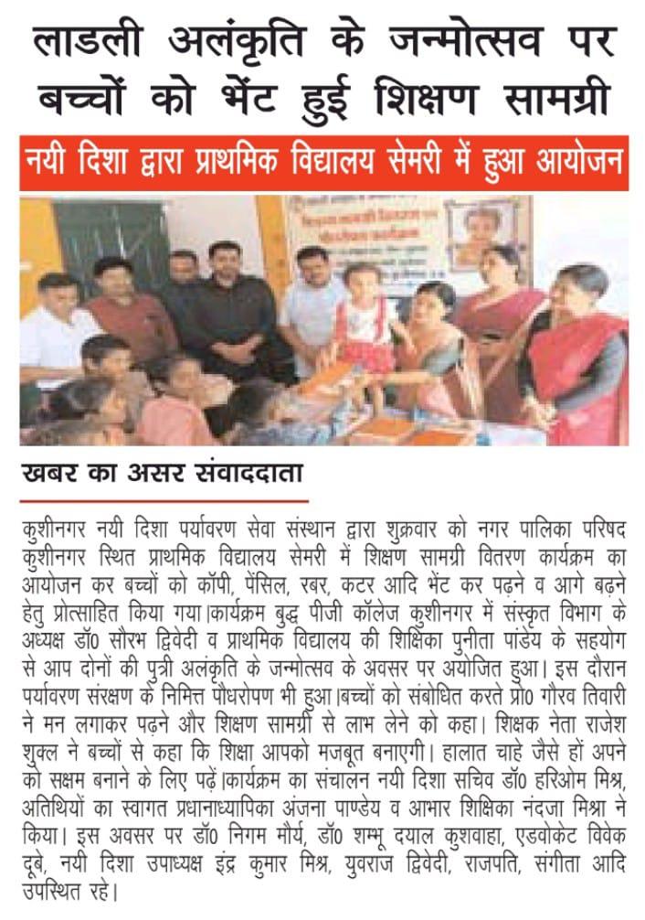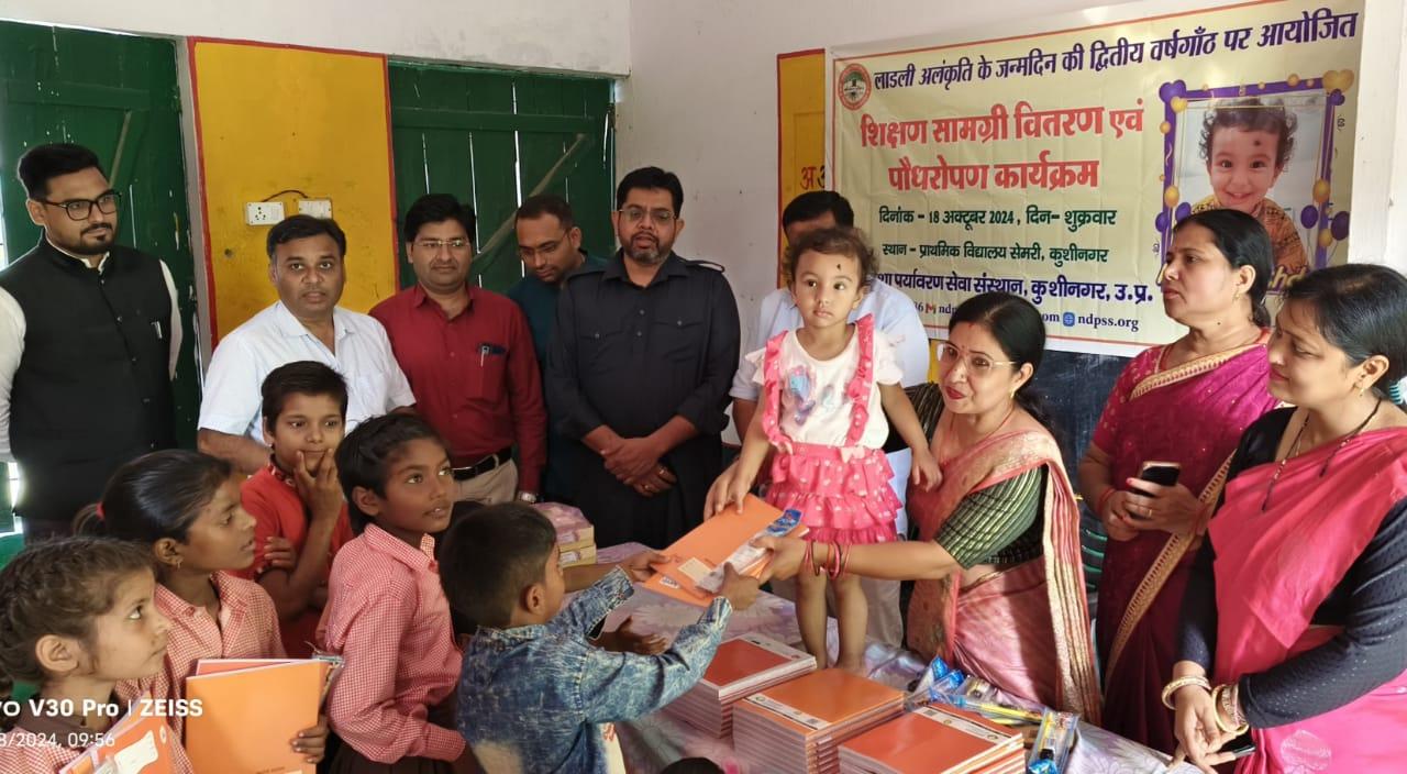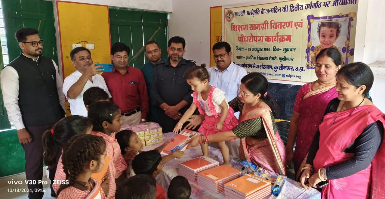 संस्थान द्वारा नगर पालिका परिषद कुशीनगर स्थित प्राथमिक विद्यालय सेमरी में बुद्ध पीजी कॉलेज कुशीनगर में संस्कृत विभाग के अध्यक्ष डॉ0 सौरभ द्विवेदी व प्राथमिक विद्यालय की शिक्षिका श्रीमती पुनीता पांडेय के सहयोग से आप दोनों की पुत्री अलंकृति के जन्मोत्सव के सुअवसर पर शिक्षण सामग्री वितरण कार्यक्रम का आयोजन कर बच्चों को कॉपी, पेंसिल, रबर, कटर आदि भेंट कर पढ़ने व आगे बढ़ने हेतु प्रोत्साहित किया गया। इस दौरान पर्यावरण संरक्षण के निमित्त पौधरोपण भी हुआ और बिटिया ने बच्चों के साथ केक भी काटा।