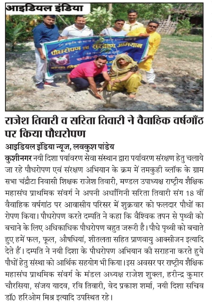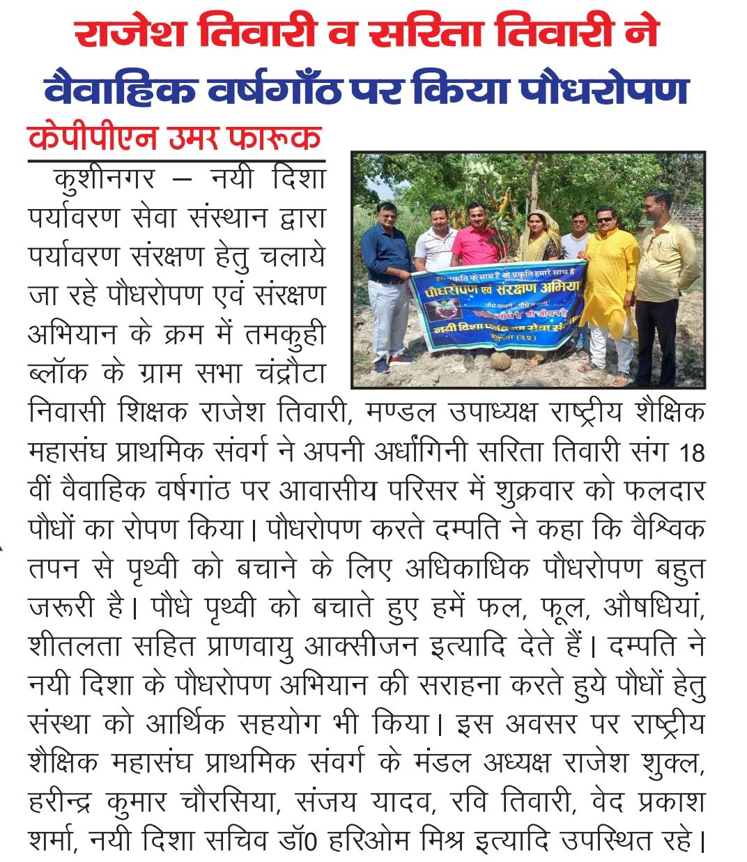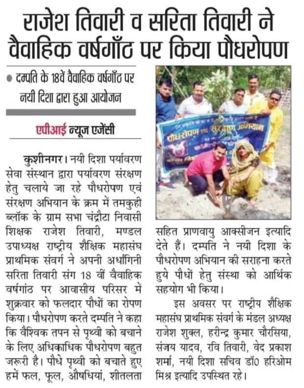 संस्थान द्वारा पर्यावरण संरक्षण हेतु चलाये जा रहे पौधरोपण अभियान के क्रम में तमकुही ब्लॉक के ग्राम सभा चंद्रौटा निवासी शिक्षक श्री राजेश तिवारी जी, मण्डल उपाध्यक्ष राष्ट्रीय शैक्षिक महासंघ प्राथमिक संवर्ग ने अपनी अर्धांगिनी श्रीमती सरिता तिवारी जी संग 18वीं वैवाहिक वर्षगांठ के सुअवसर पर आवासीय परिसर में फलदार पौधों का रोपण करते हुये पौधों हेतु 1100₹ का प्यार भेंट किया।