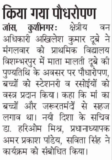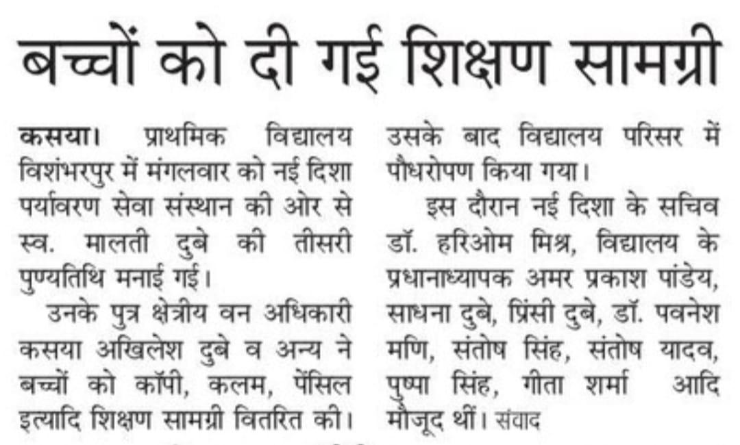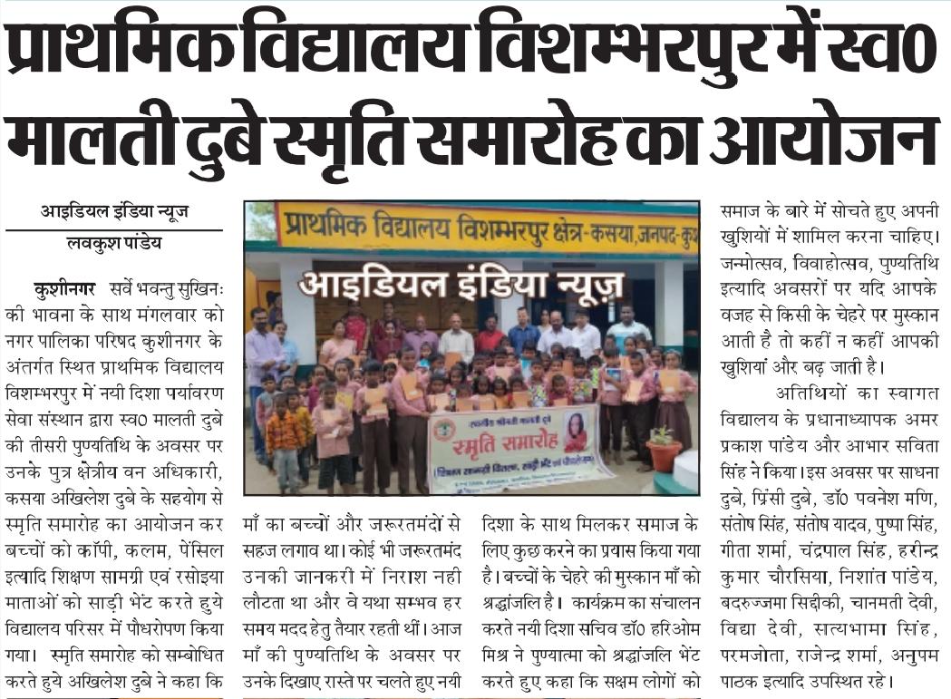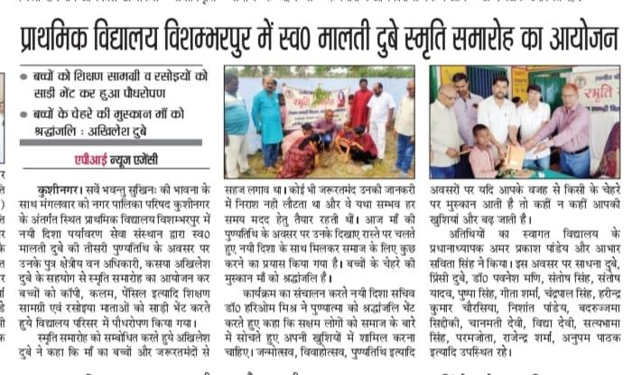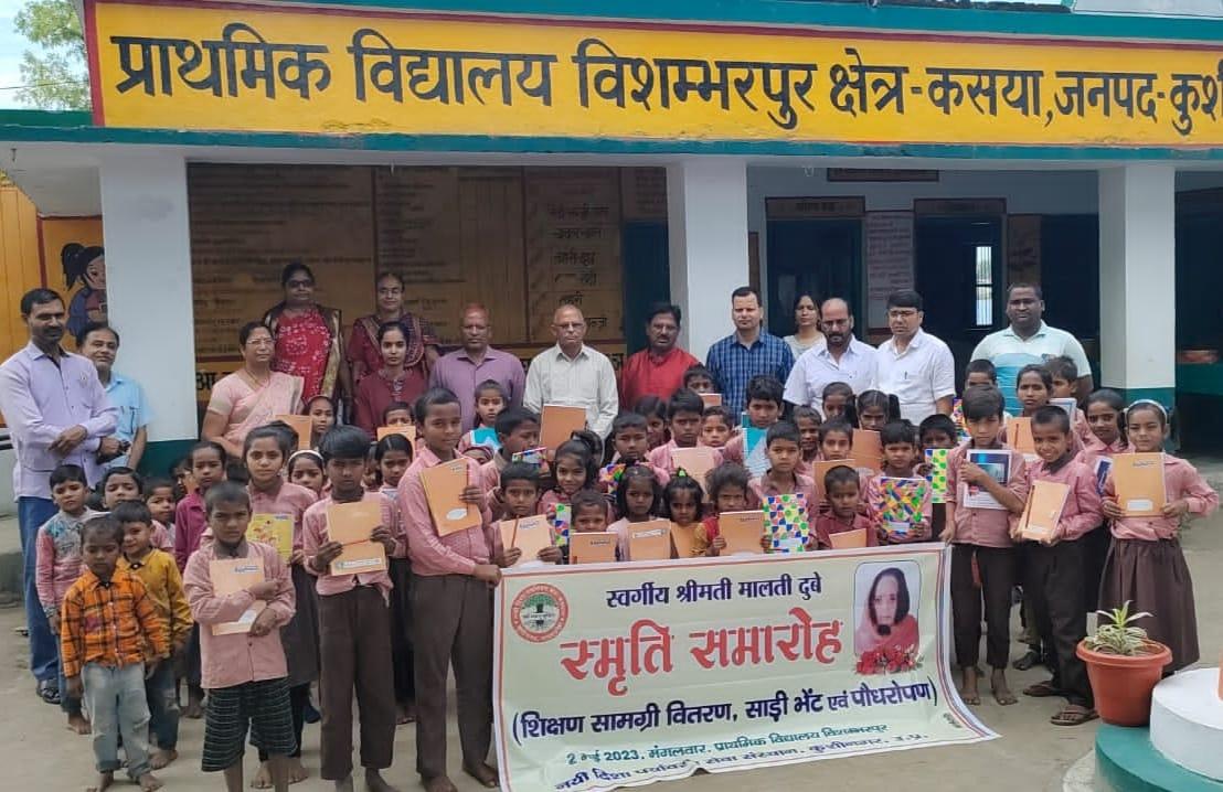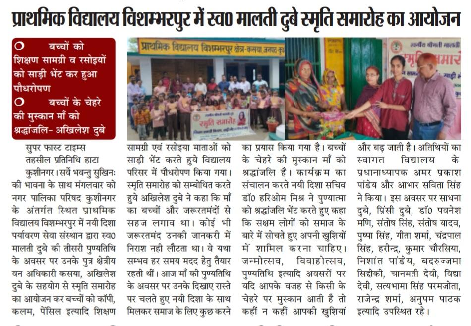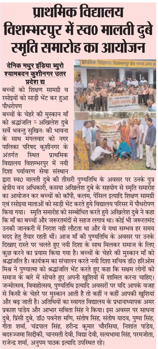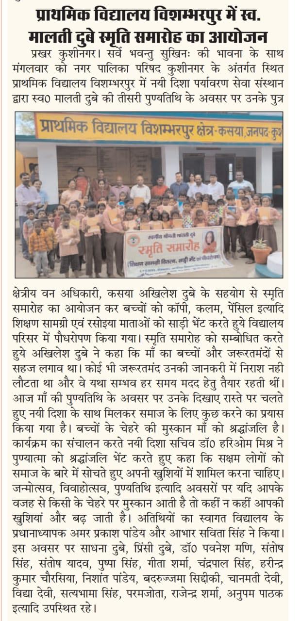 सर्वे भवन्तु सुखिनः की भावना के साथ नगर पालिका परिषद कुशीनगर के अंतर्गत स्थित प्राथमिक विद्यालय विशम्भरपुर में नयी दिशा पर्यावरण सेवा संस्थान द्वारा स्व0 श्रीमती मालती दुबे की तीसरी पुण्यतिथि के अवसर पर उनके पुत्र क्षेत्रीय वन अधिकारी, कसया श्री अखिलेश दुबे के सहयोग से स्मृति समारोह का आयोजन कर बच्चों को कॉपी, कलम, पेंसिल इत्यादि शिक्षण सामग्री एवं रसोइया माताओं को साड़ी भेंट करते हुये विद्यालय परिसर में पौधरोपण किया गया।