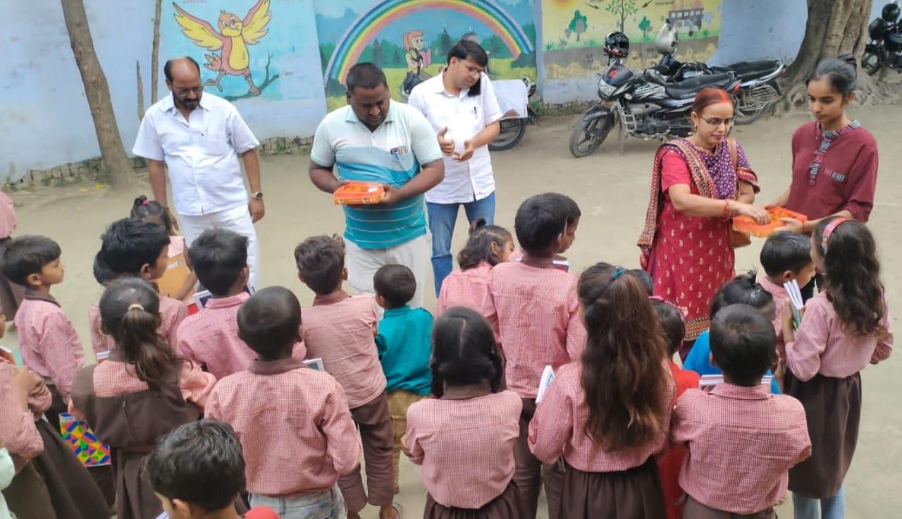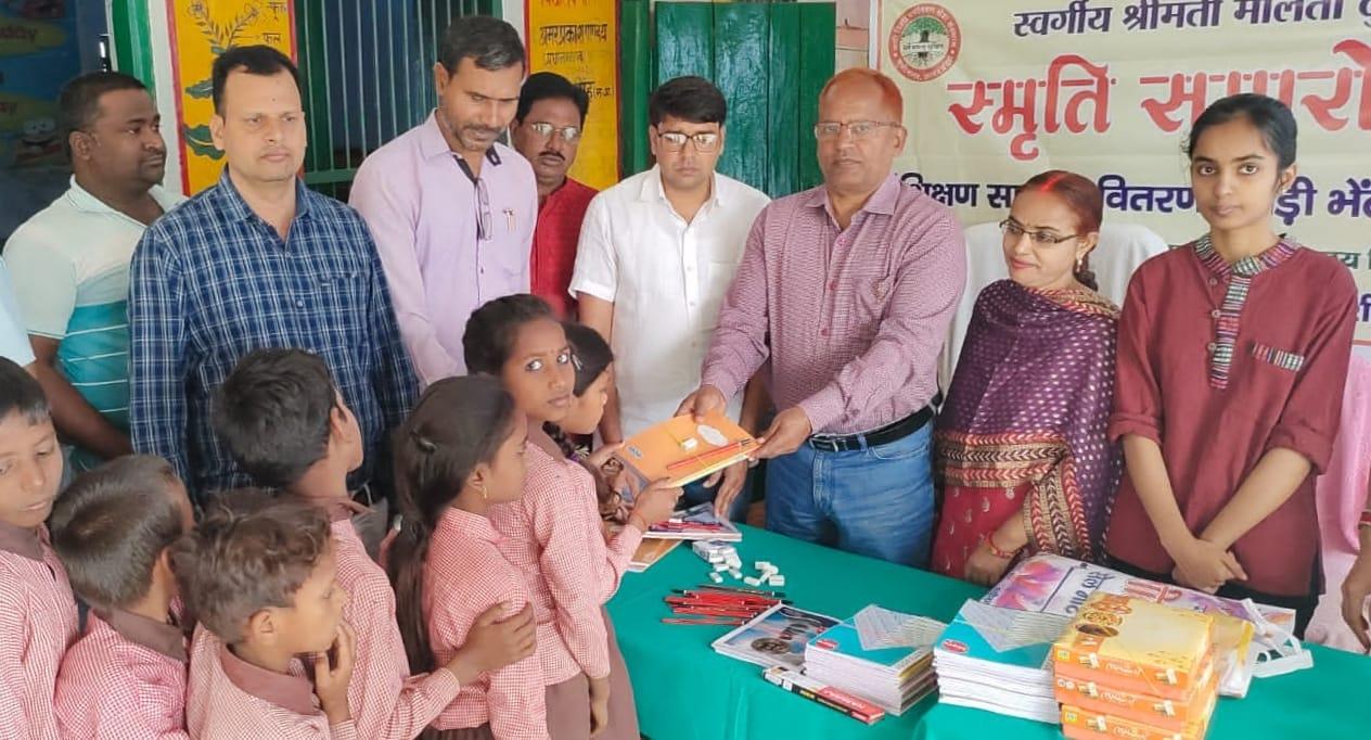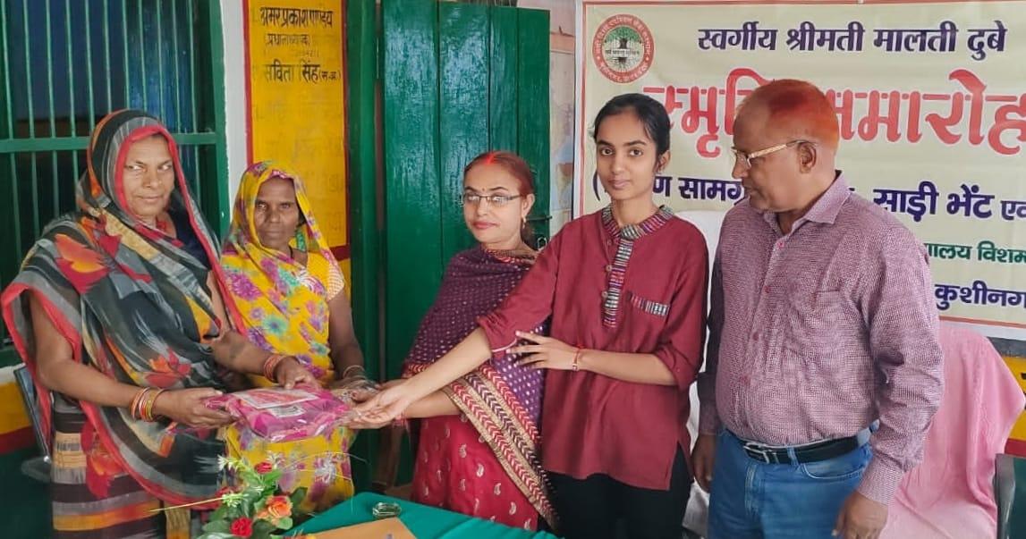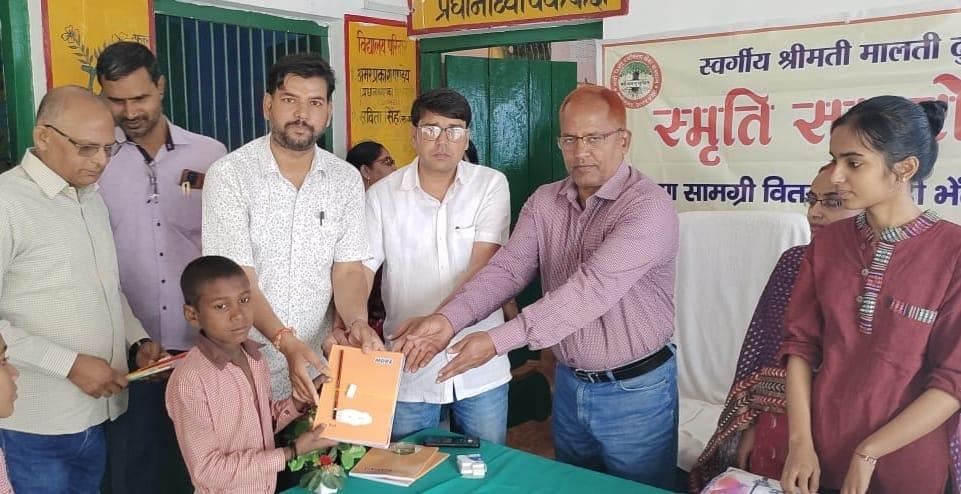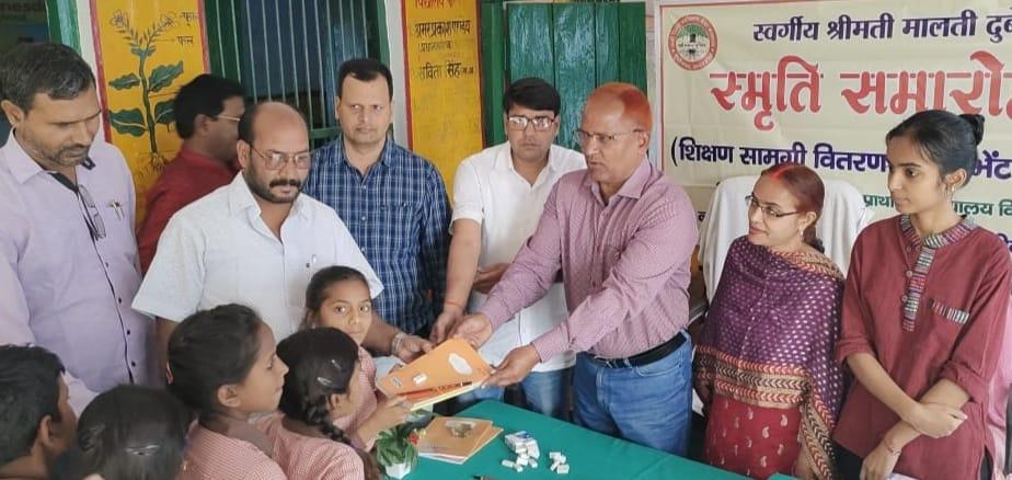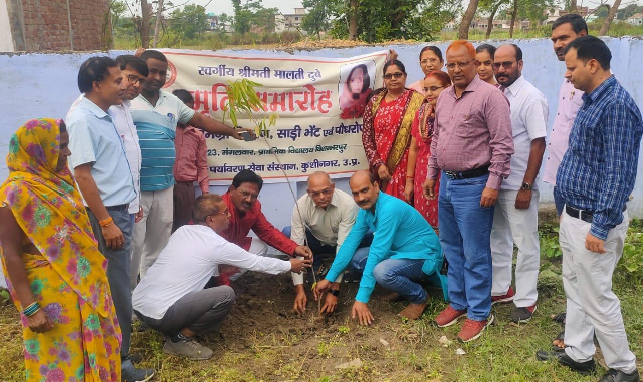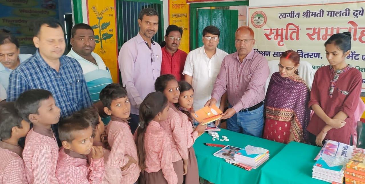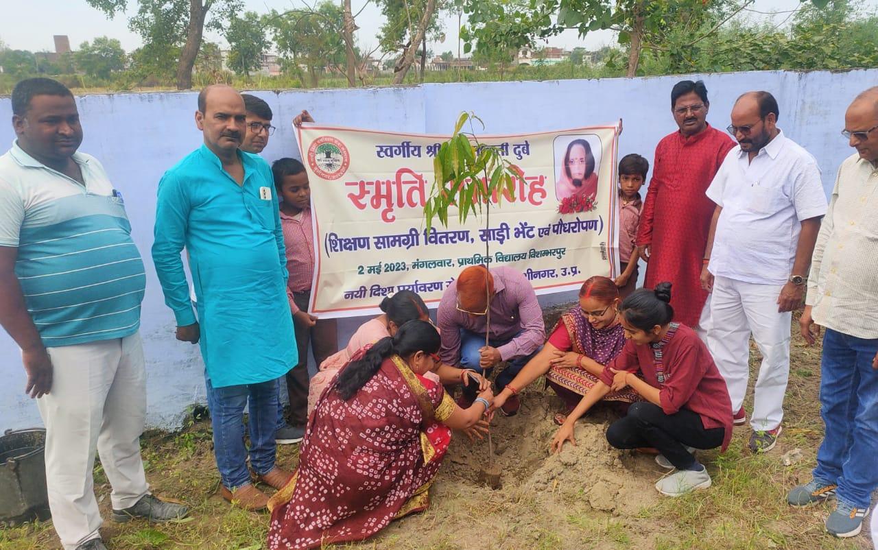 स्व0 श्रीमती मालती दुबे की पुण्यतिथि पर बच्चों को शिक्षण सामग्री व रसोइया माताओं को साड़ी भेंट कर पौधरोपण किया गया।