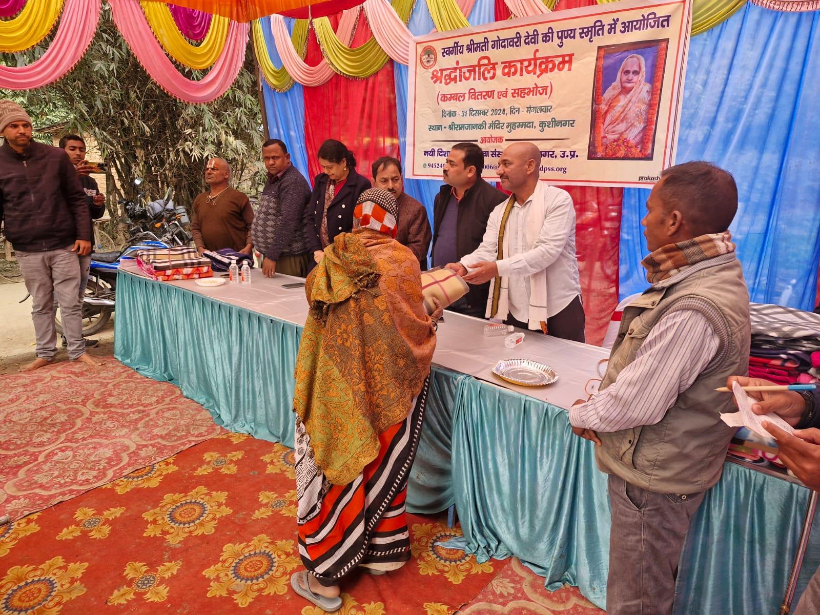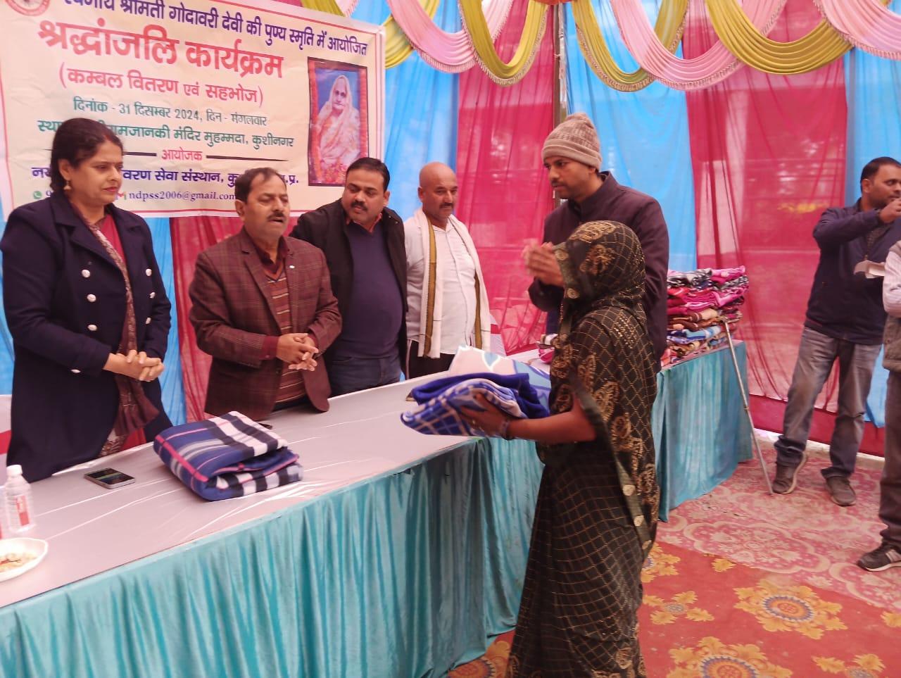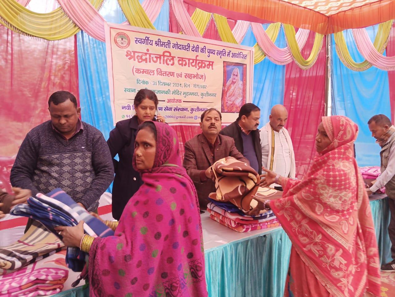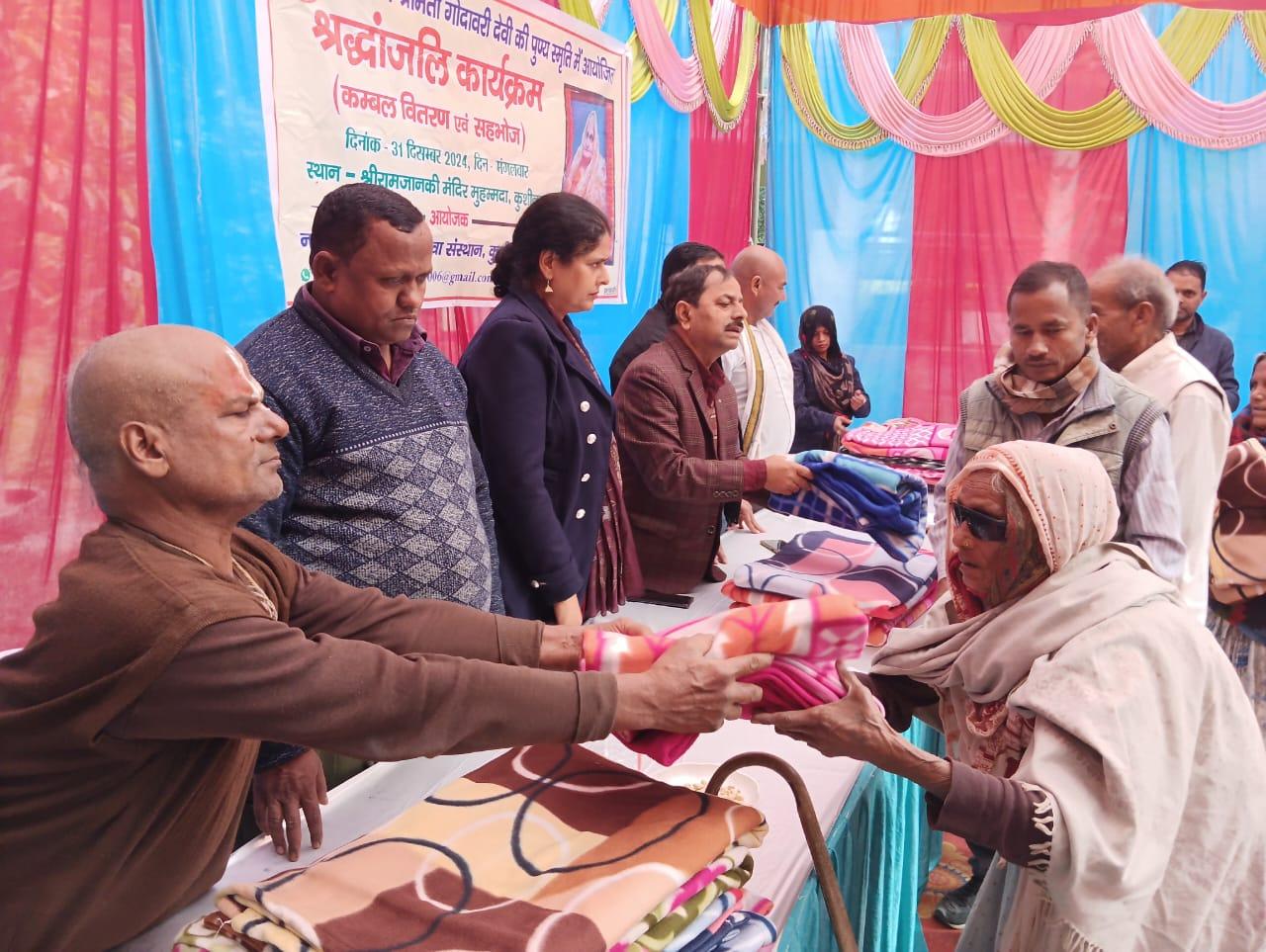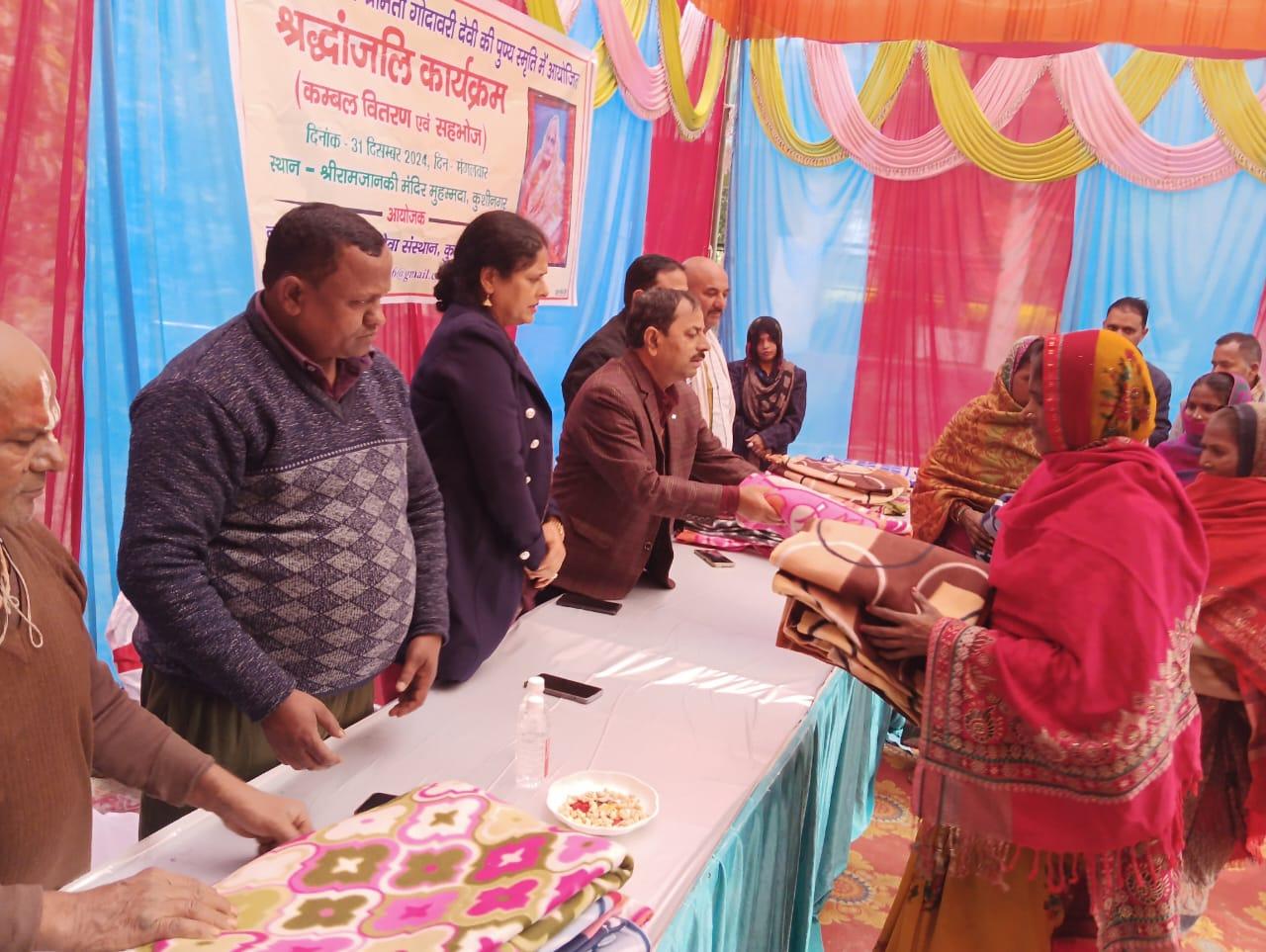 स्वर्गीय श्रीमती गोदावरी देवी की पुण्यस्मृति में श्रद्धांजलि कार्यक्रम का आयोजन कर कम्बल वितरण व सहभोज किया गया।