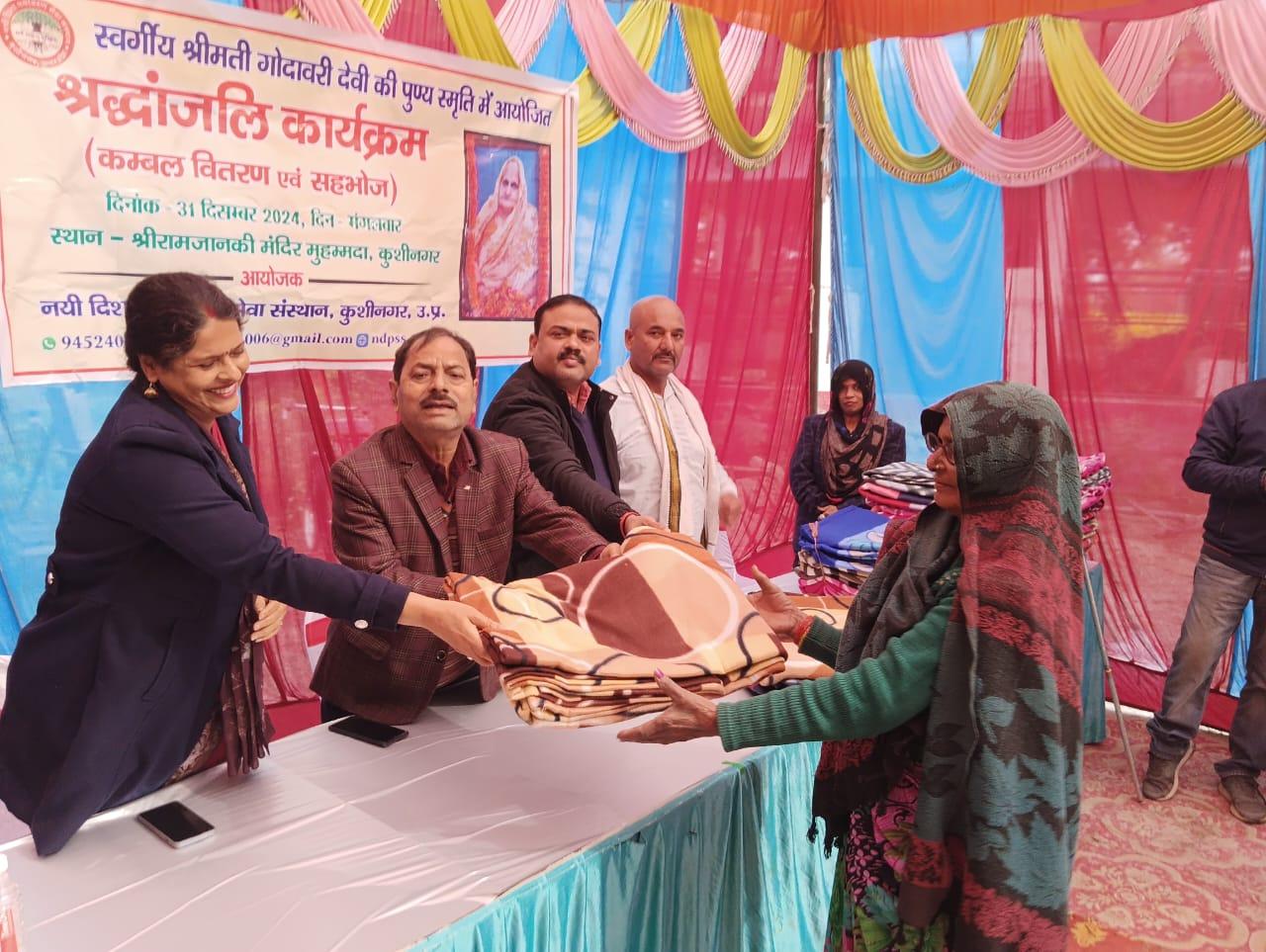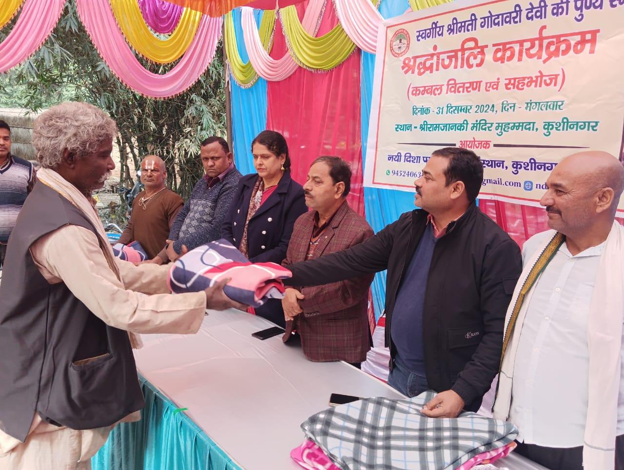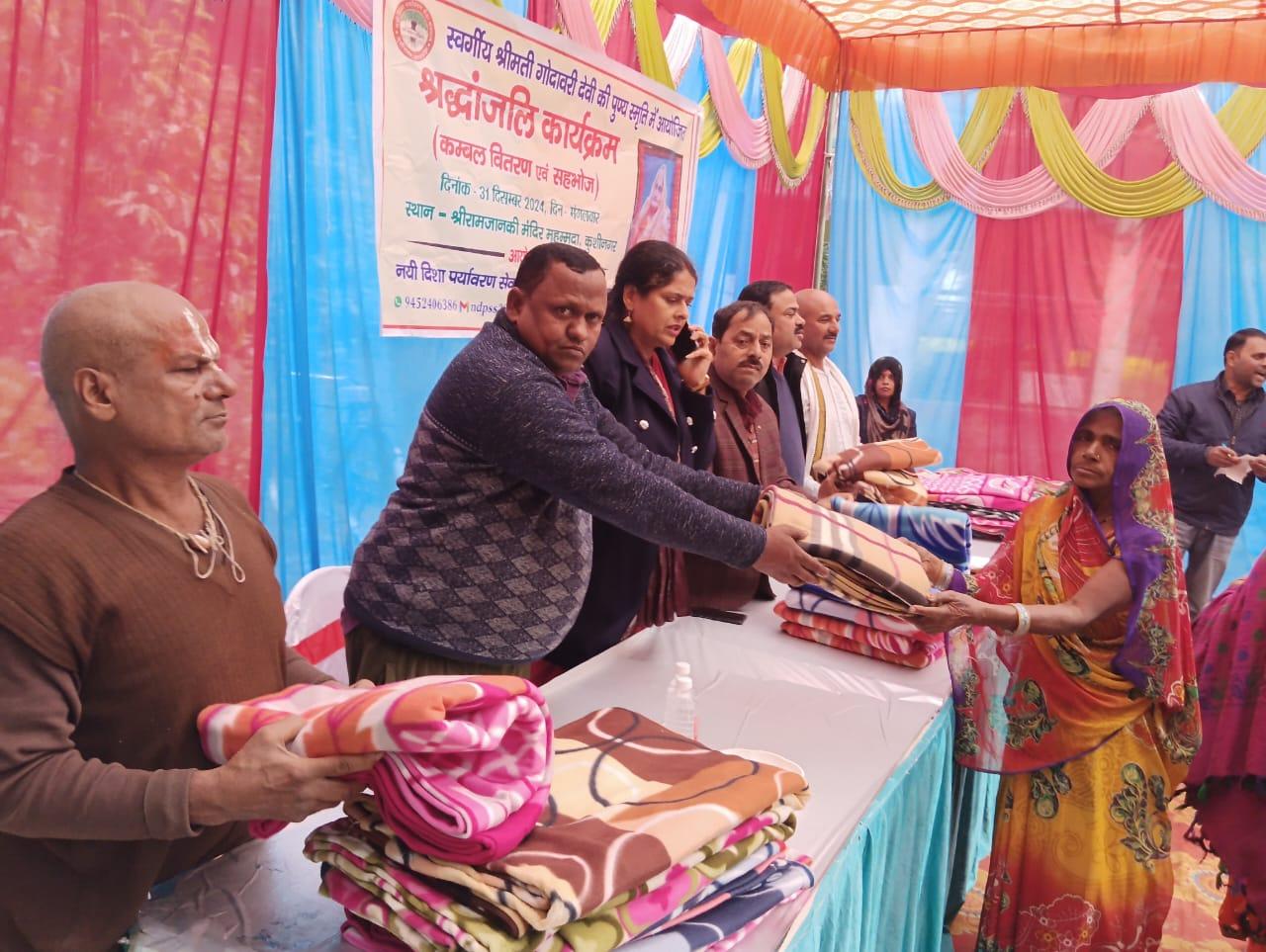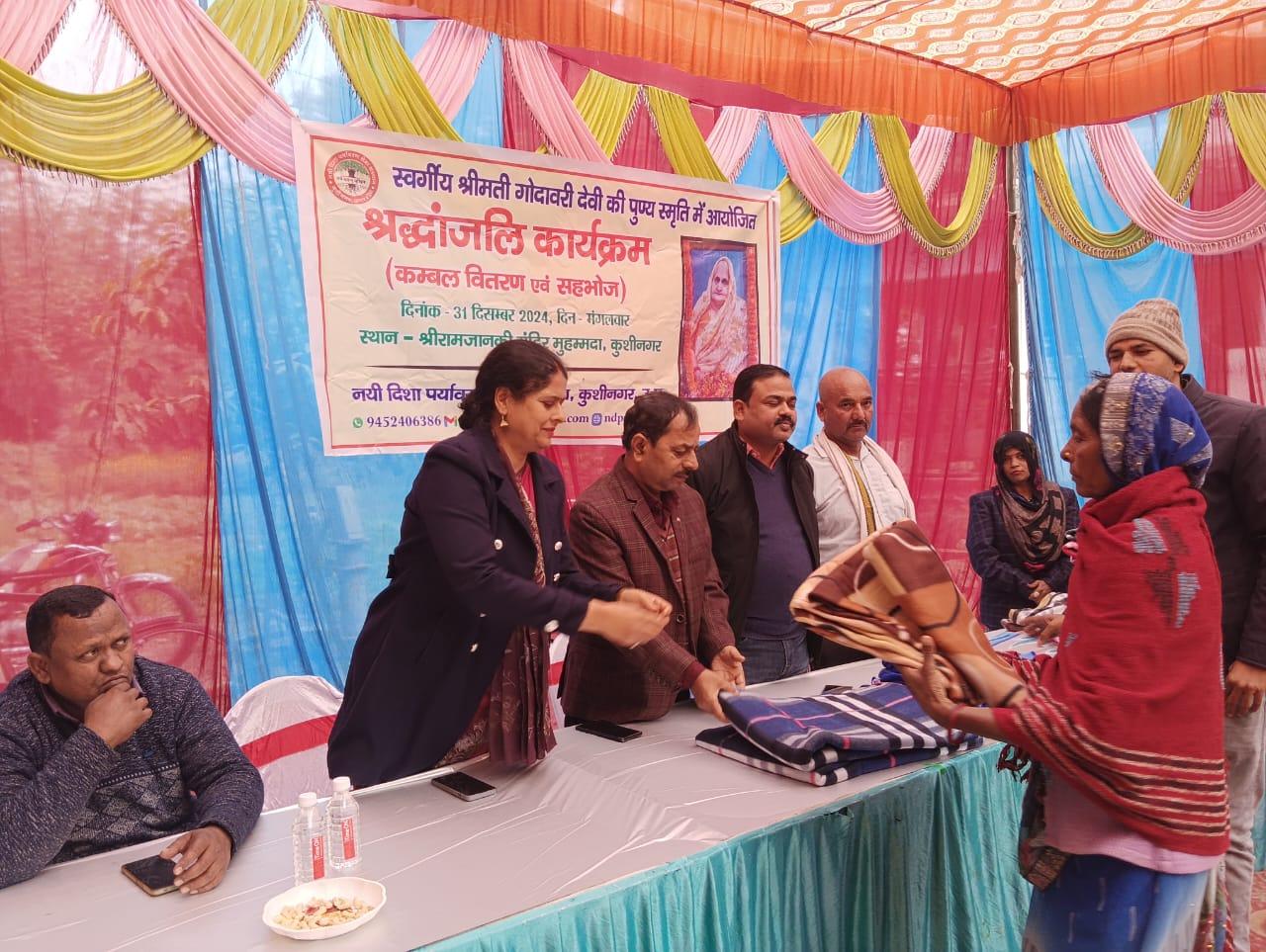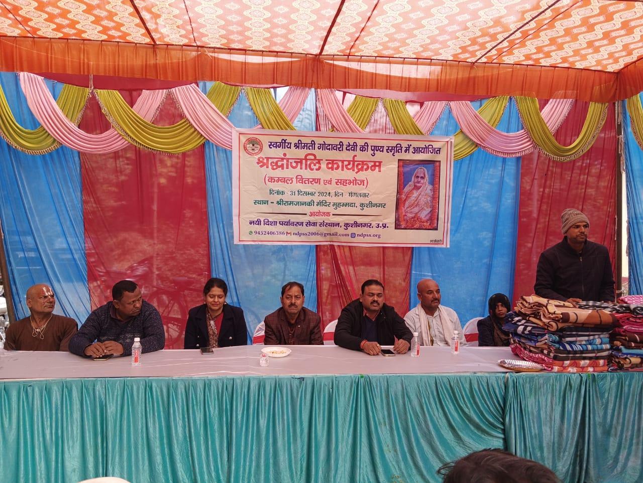 स्वर्गीय श्रीमती गोदावरी देवी की पुण्यस्मृति में श्रद्धांजलि कार्यक्रम का आयोजन कर कम्बल वितरण व सहभोज किया गया।