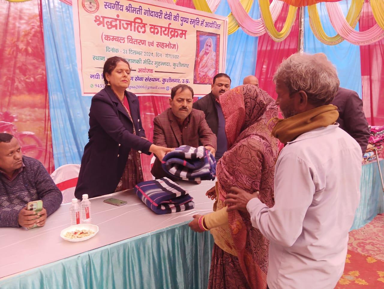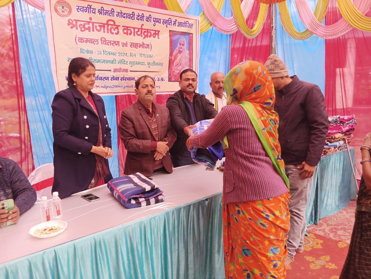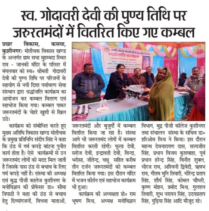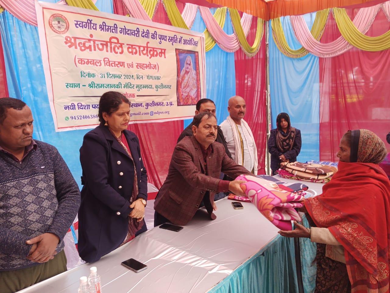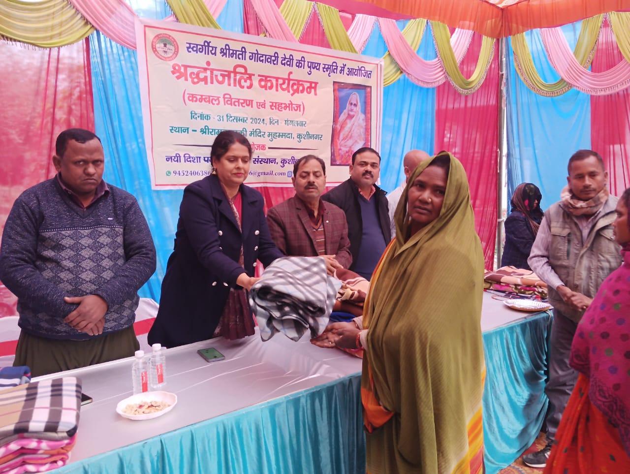 स्वर्गीय श्रीमती गोदावरी देवी की पुण्यस्मृति में श्रद्धांजलि कार्यक्रम का आयोजन कर कम्बल वितरण व सहभोज किया गया।