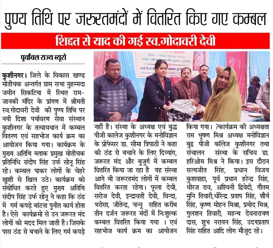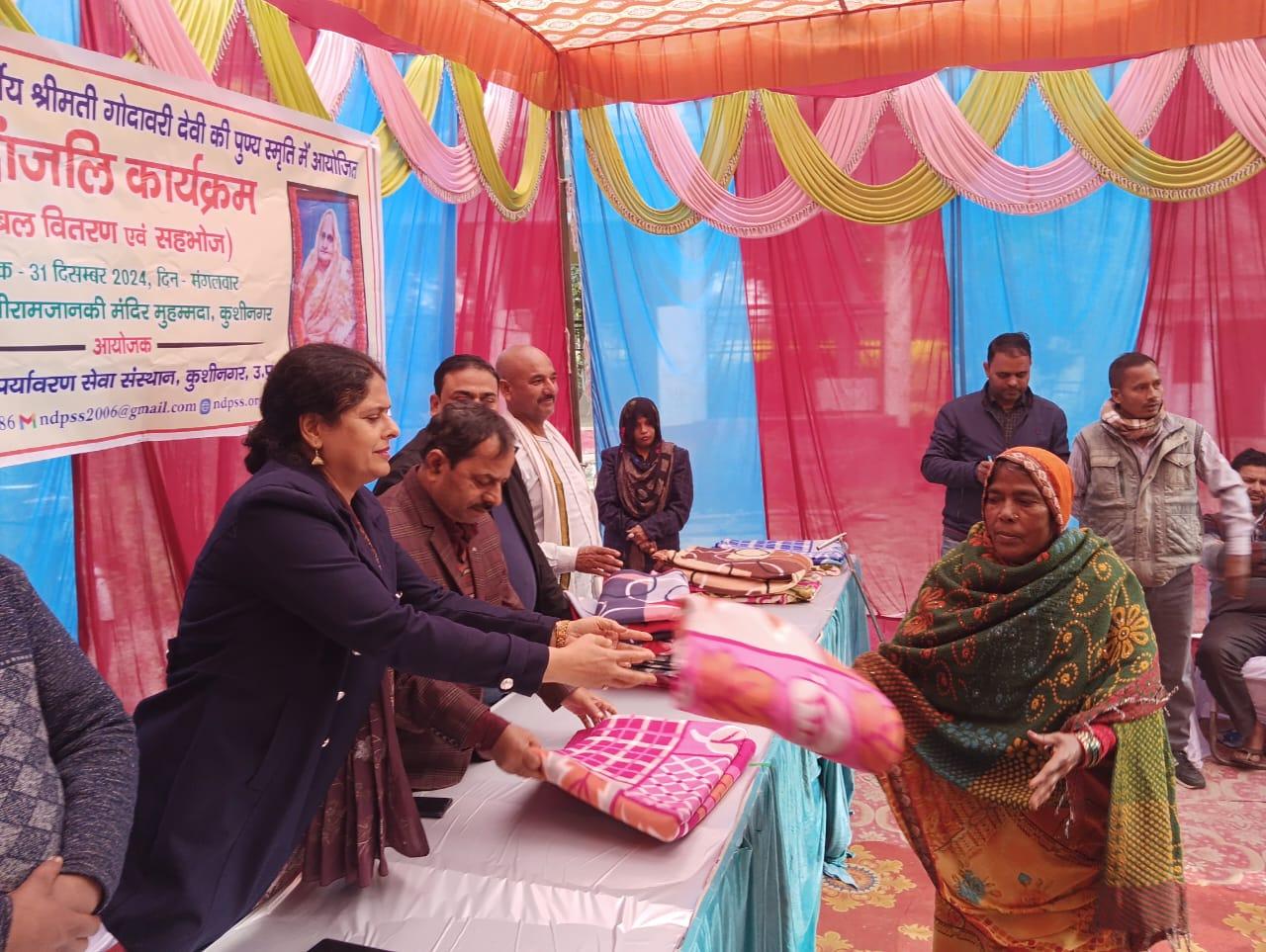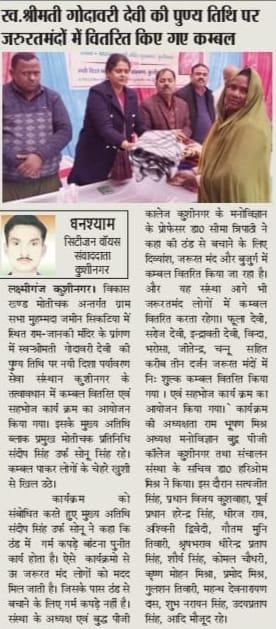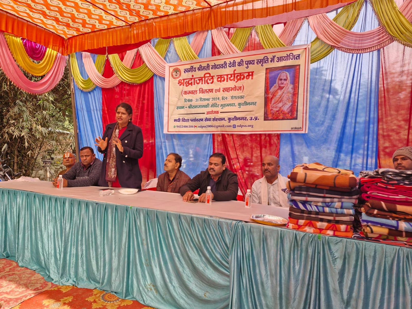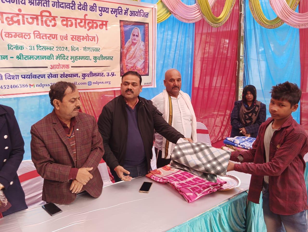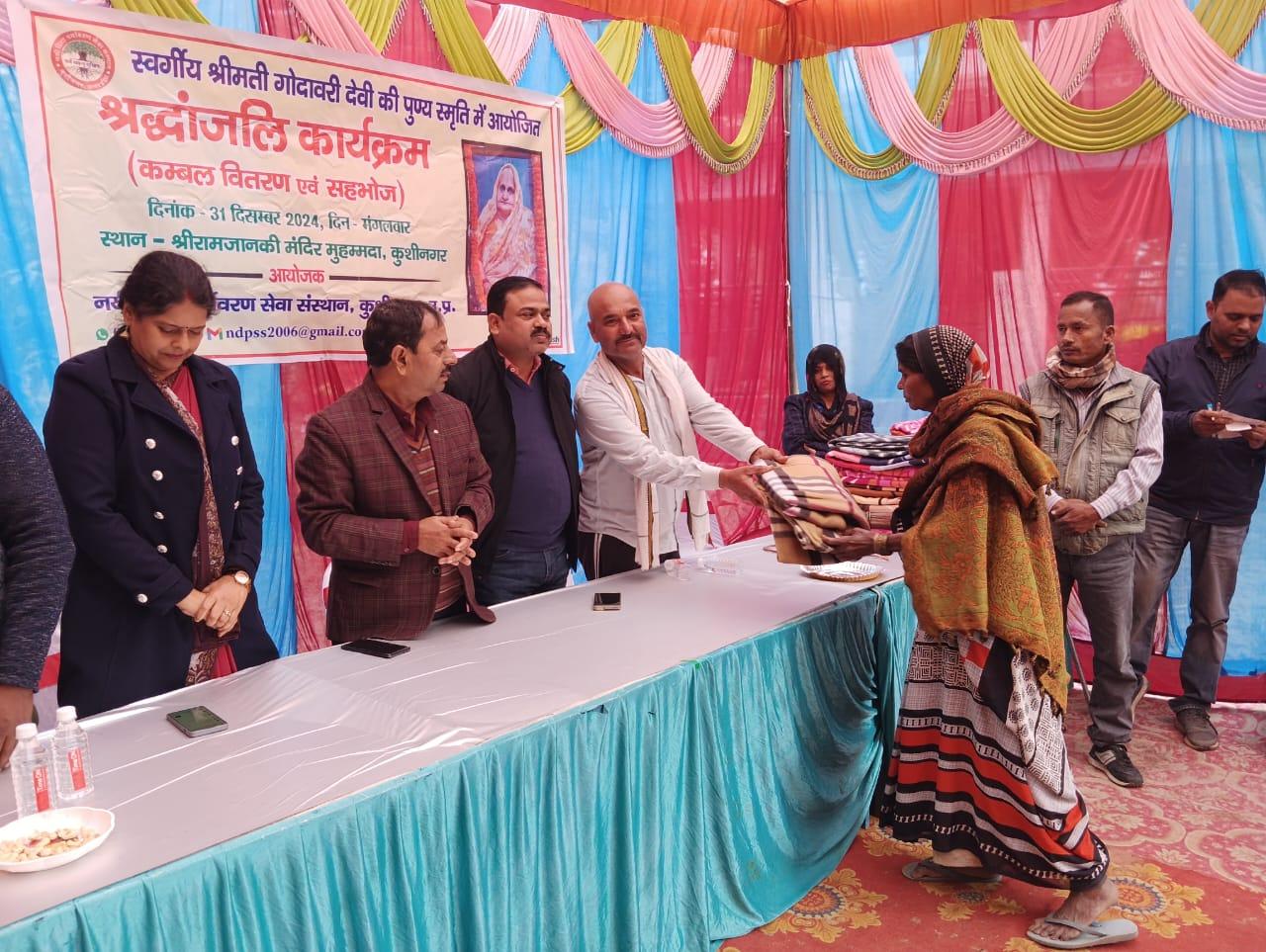 स्वर्गीय श्रीमती गोदावरी देवी की पुण्यस्मृति में श्रद्धांजलि कार्यक्रम का आयोजन कर कम्बल वितरण व सहभोज किया गया।