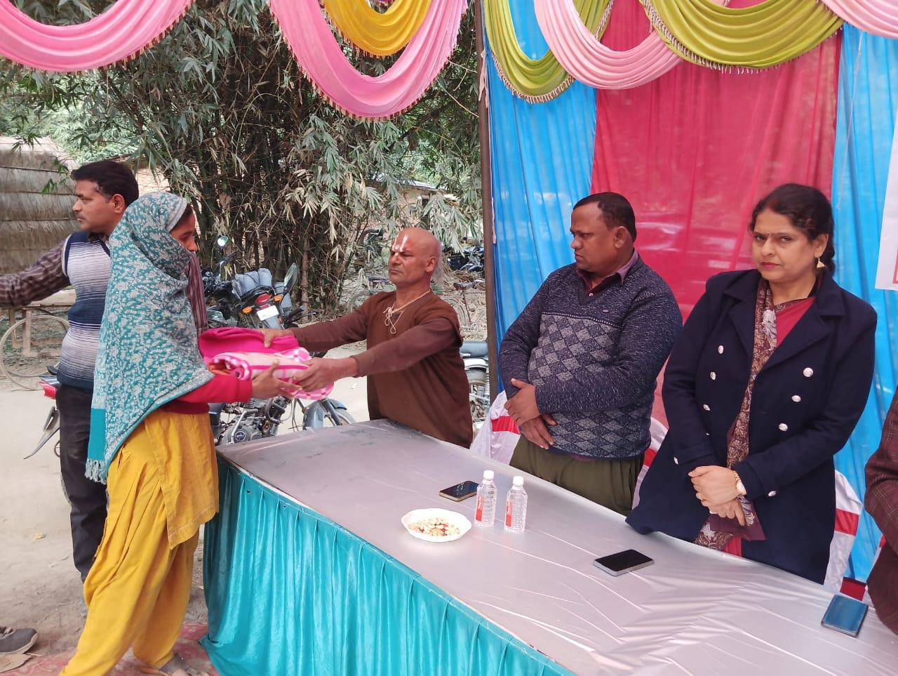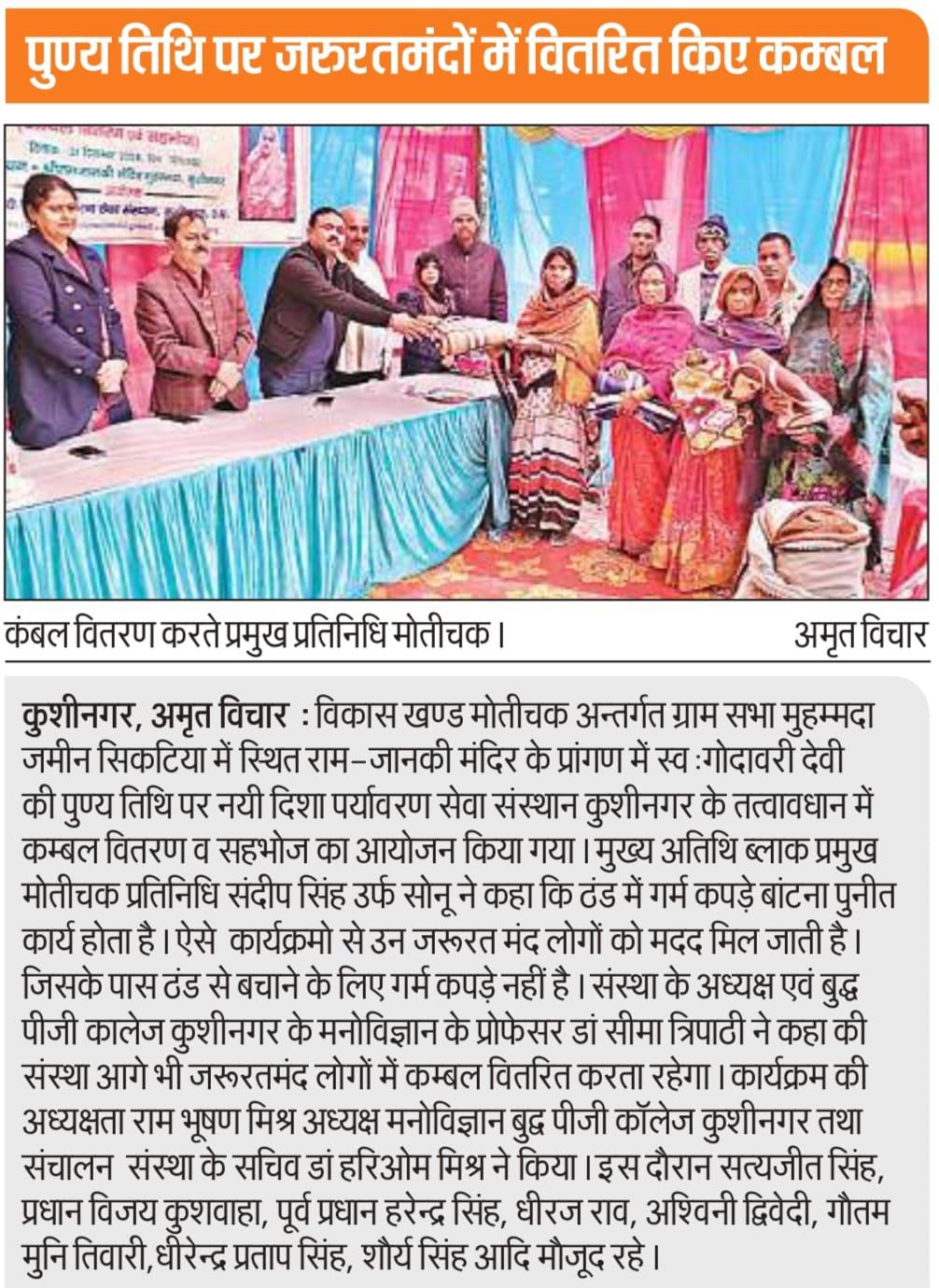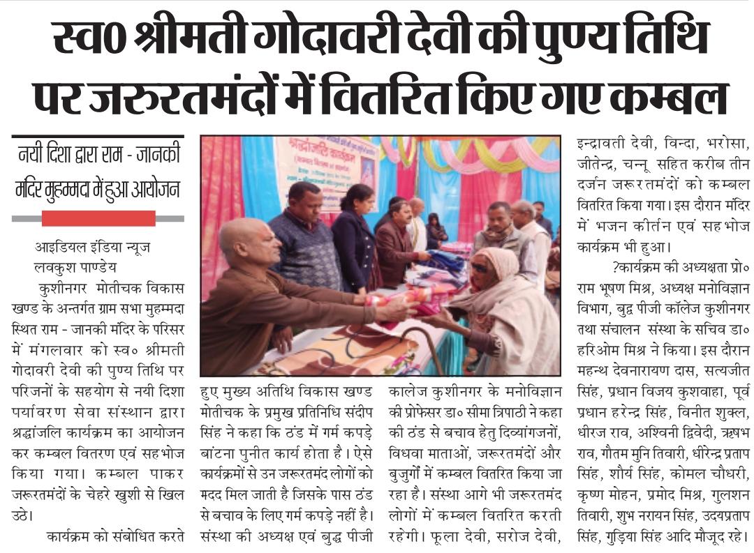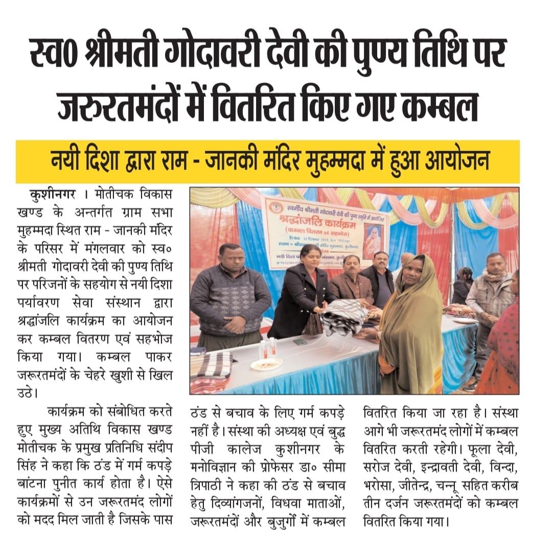 मोतीचक विकास खण्ड के अन्तर्गत ग्राम सभा मुहम्मदा स्थित श्रीराम - जानकी मंदिर के परिसर में संस्था अध्यक्ष प्रो० सीमा त्रिपाठी की सासु माँ स्व० श्रीमती गोदावरी देवी की पुण्य स्मृति में श्रद्धांजलि कार्यक्रम का आयोजन कर जरूरतमंद विधवा माताओं व दिव्यांग बंधुओं को कम्बल वितरण कर सहभोज किया गया। इस दौरान मंदिर परिसर में भजन कीर्तन भी हुआ।