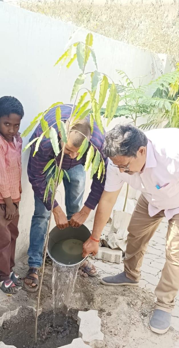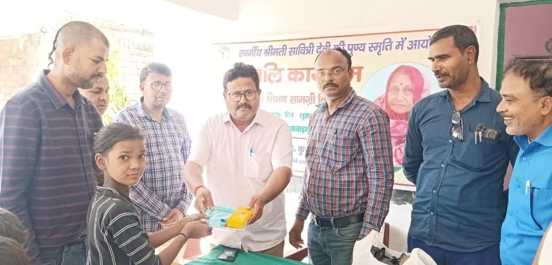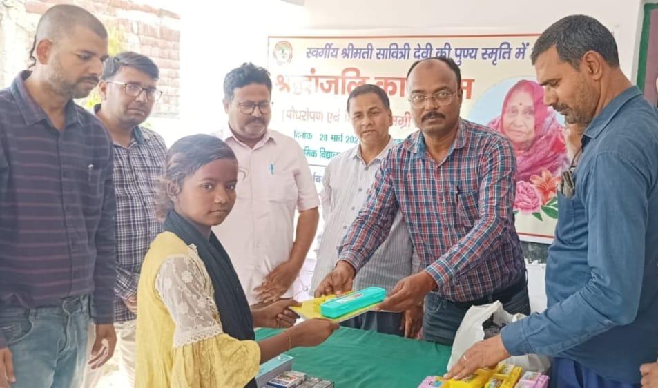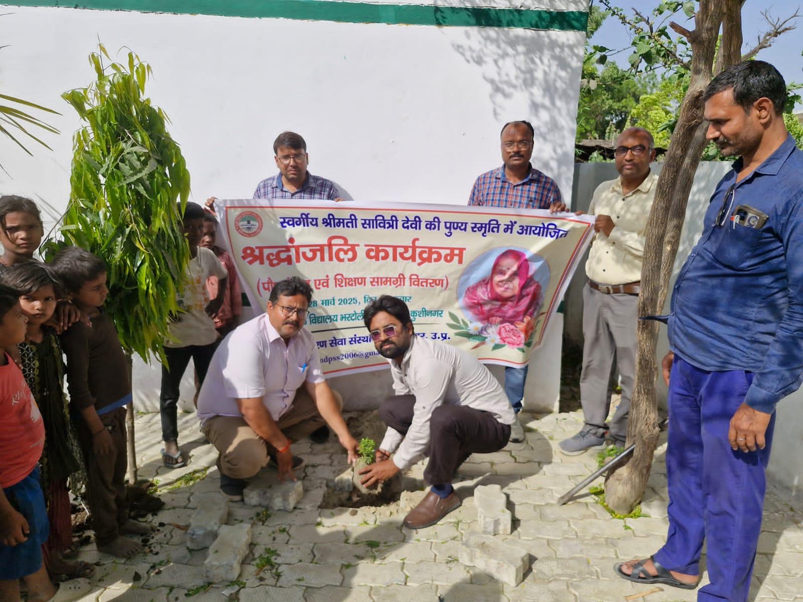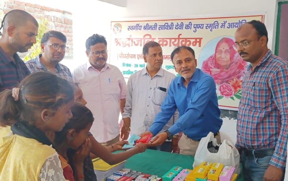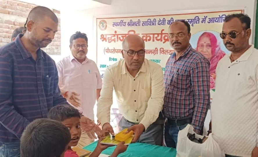 स्वर्गीय श्रीमती सावित्री देवी जी की पुण्यतिथि पर पौधरोपण एवं शिक्षण सामग्री वितरण का आयोजन।