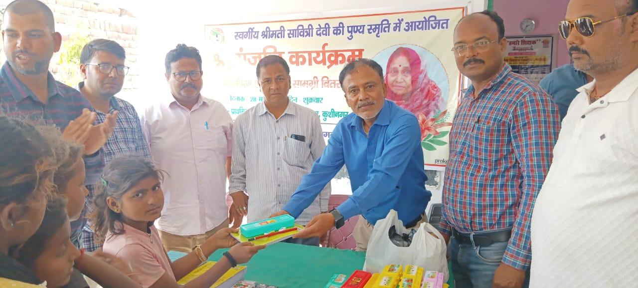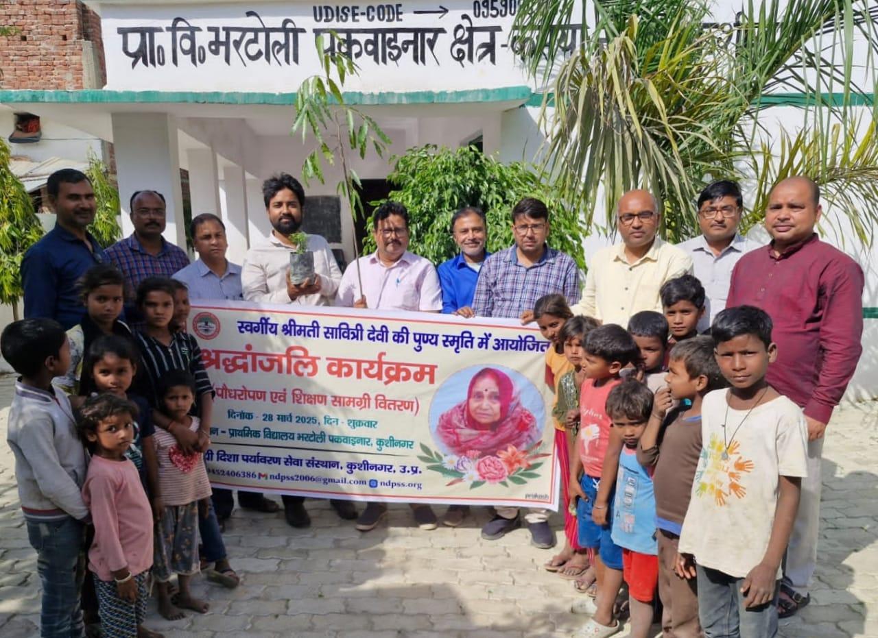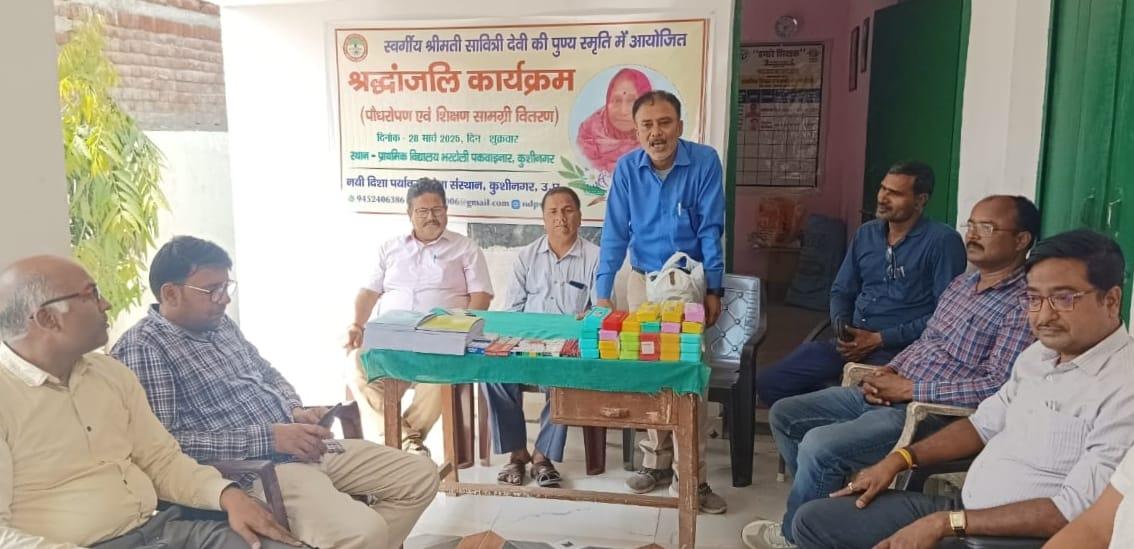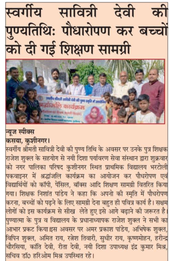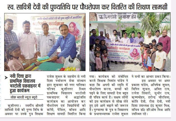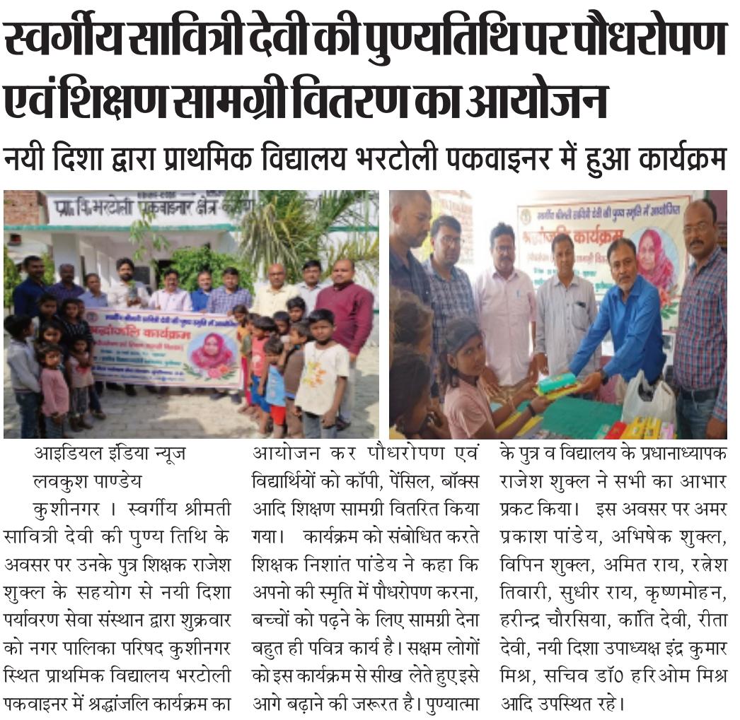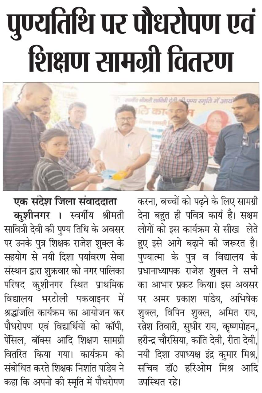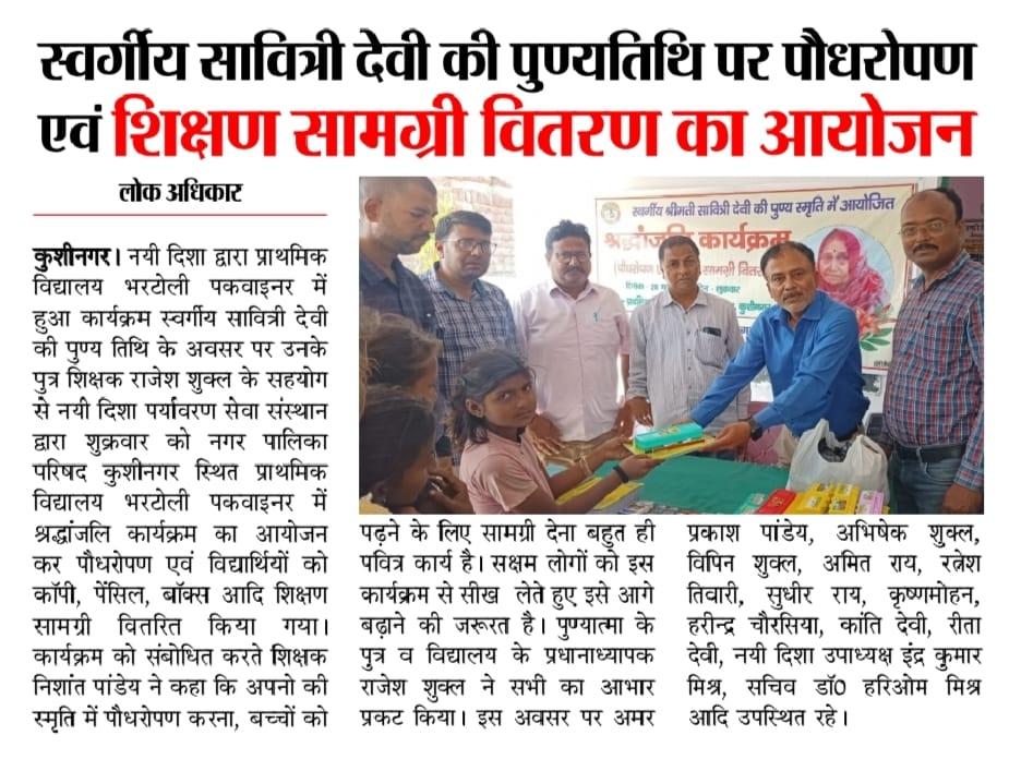 नयी दिशा परिवार के अंग शिक्षक श्री राजेश शुक्ल जी के सहयोग से आपकी स्वर्गवासी माता श्रीमती सावित्री देवी जी की पुण्य तिथि के अवसर पर संस्थान द्वारा नगर पालिका परिषद कुशीनगर स्थित प्राथमिक विद्यालय भरटोली पकवाइनर में श्रद्धांजलि कार्यक्रम का आयोजन कर पौधरोपण एवं विद्यार्थियों को कॉपी, पेंसिल, बॉक्स आदि शिक्षण सामग्री वितरित किया गया।