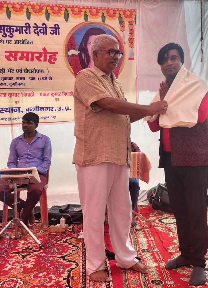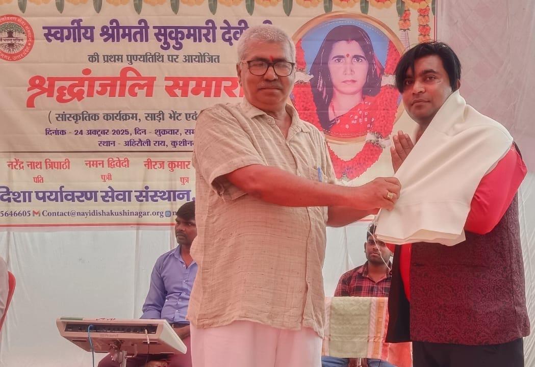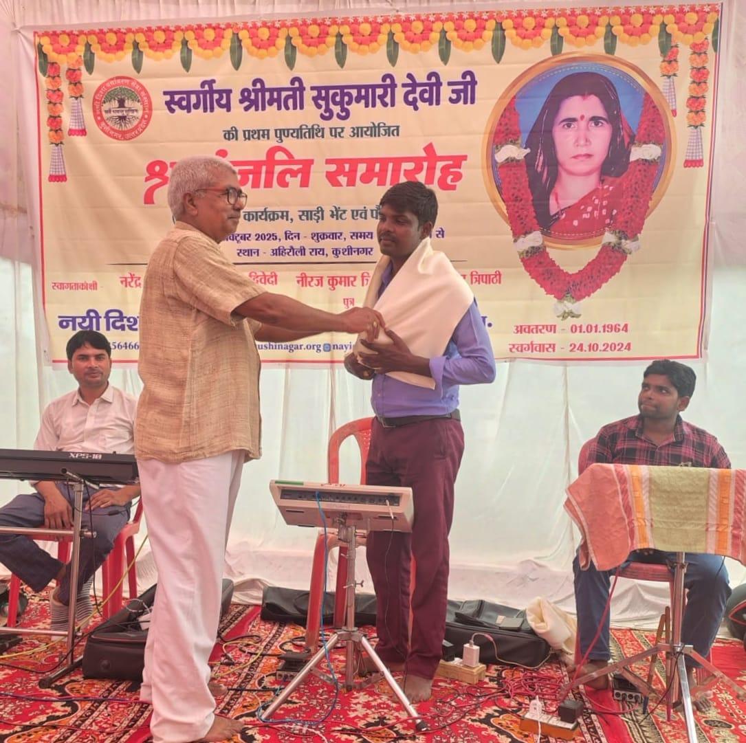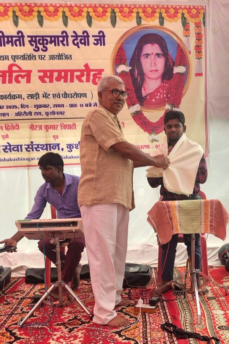 संस्थान के तत्वावधान में हाटा विकास खण्ड स्थित ग्राम अहिरौली राय में स्वर्गीय श्रीमती सुकुमारी देवी जी की प्रथम पुण्यतिथि पर परिजनों के सहयोग से श्रद्धांजलि समारोह का आयोजन किया गया। समारोह में सांस्कृतिक कार्यक्रमों के साथ जरूरतमंद विधवा माताओं को साड़ी भेंट की गई और पर्यावरण संरक्षण के निमित्त पुण्यात्मा की स्मृति में आम के पौधों का रोपण हुआ। कार्यक्रम बुद्ध पीजी कॉलेज कुशीनगर के पूर्व प्राचार्य गुरुवर डॉ0 दयाशंकर तिवारी की अध्यक्षता में सम्पन्न हुआ। पुण्यात्मा के पति पूर्व शाखा प्रबंधक श्री नरेंद्र नाथ त्रिपाठी ने समारोह में सहभागी सभी का स्वागत व आभार प्रकट किया।