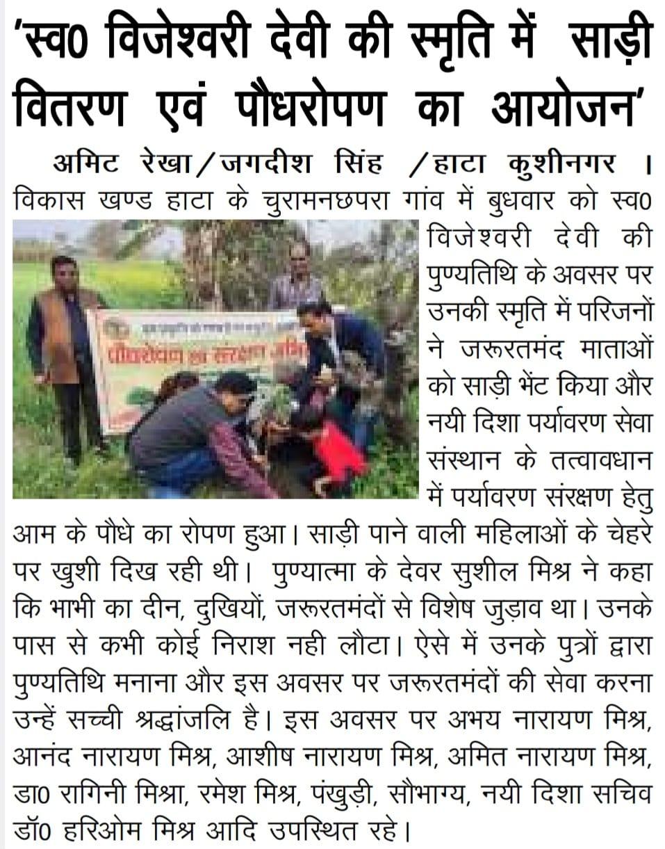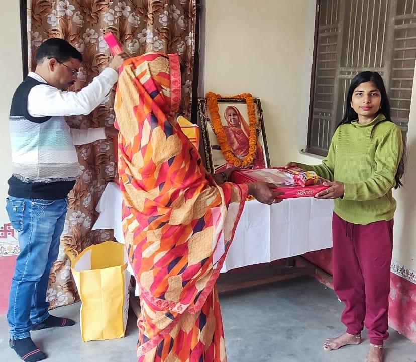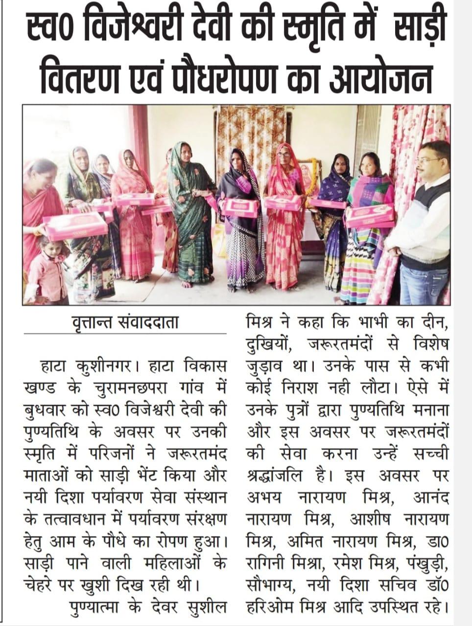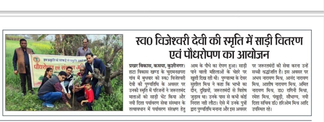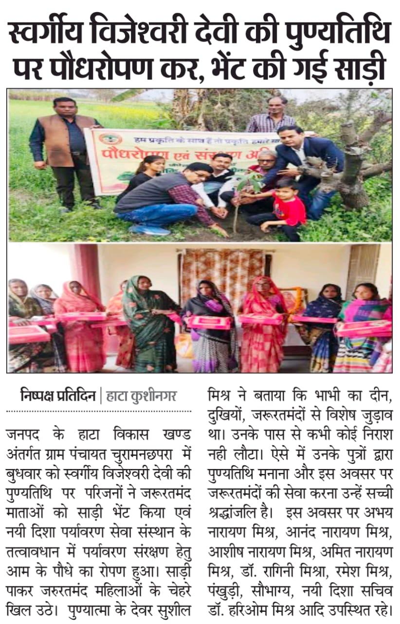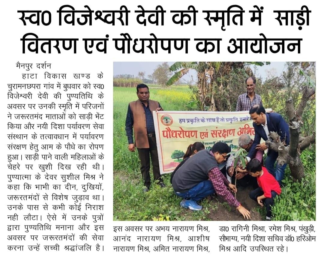 स्वर्गीय श्रीमती विजेश्वरी देवी जी की स्मृति में साड़ी वितरण एवं पौधरोपण का आयोजन।