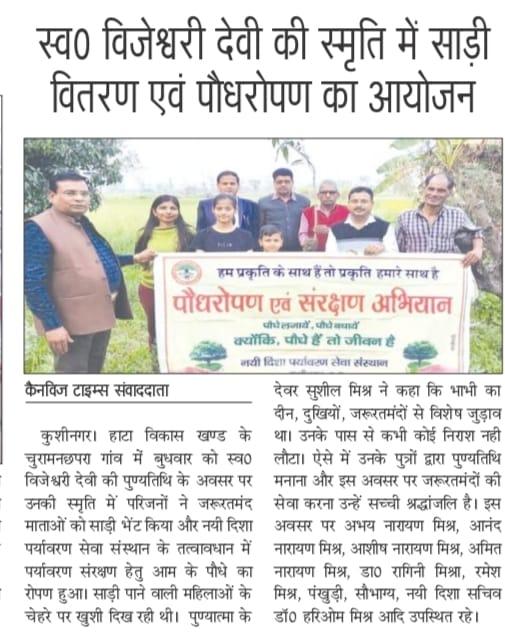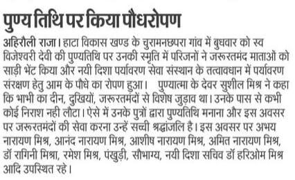 हाटा विकास खण्ड के चुरामनछपरा गांव में स्वर्गीय श्रीमती विजेश्वरी देवी जी की पुण्यतिथि के अवसर पर परिजनों द्वारा जरूरतमंद माताओं को साड़ी भेंट कर आम के पौधे का रोपण किया गया।