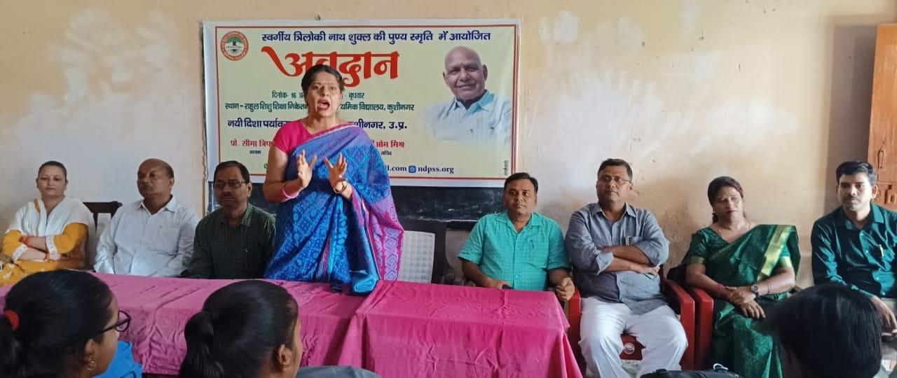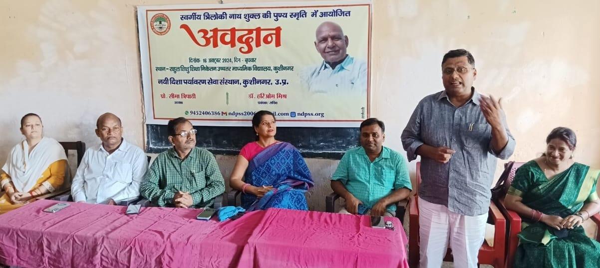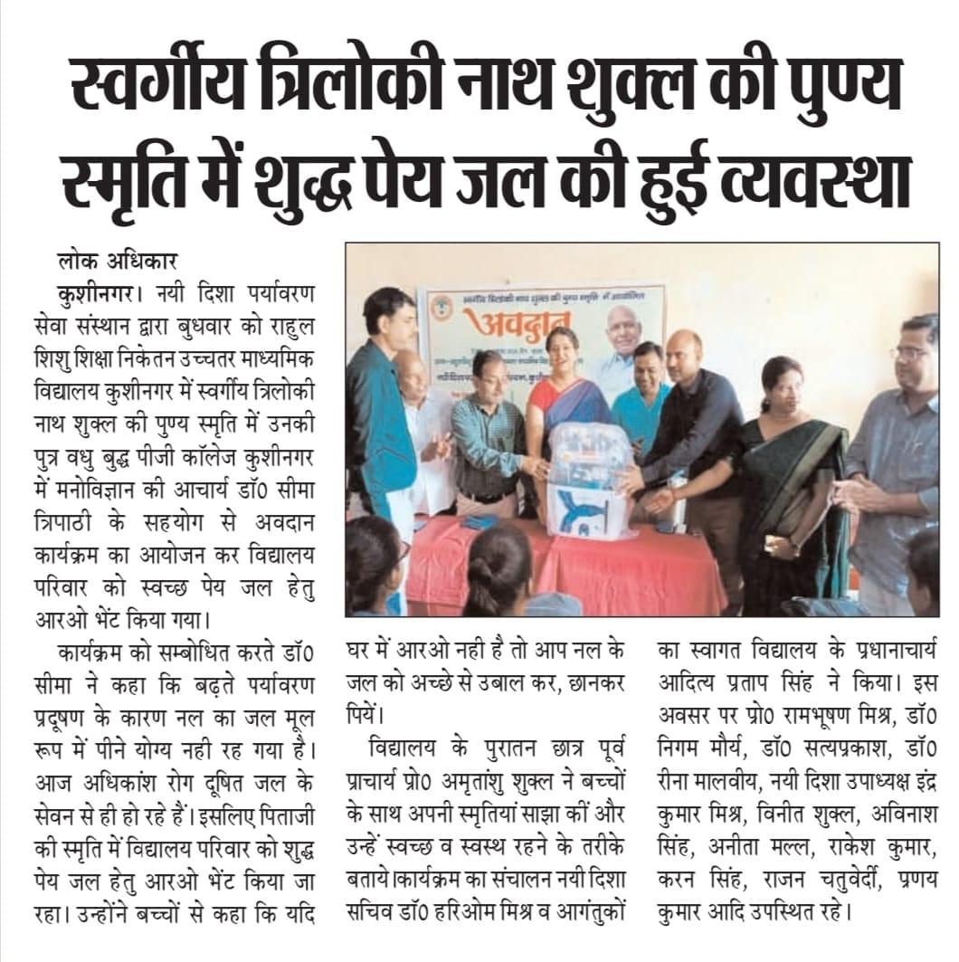 संस्थान द्वारा राहुल शिशु शिक्षा निकेतन उच्चतर माध्यमिक विद्यालय कुशीनगर में स्वर्गीय त्रिलोकी नाथ शुक्ल जी की पुण्य स्मृति में उनकी पुत्र वधु बुद्ध पीजी कॉलेज कुशीनगर में मनोविज्ञान की आचार्य एवं संस्था अध्यक्ष डॉ0 सीमा त्रिपाठी मैंम के सहयोग से अवदान कार्यक्रम का आयोजन कर विद्यालय परिवार को स्वच्छ पेय जल हेतु आरओ भेंट किया गया।