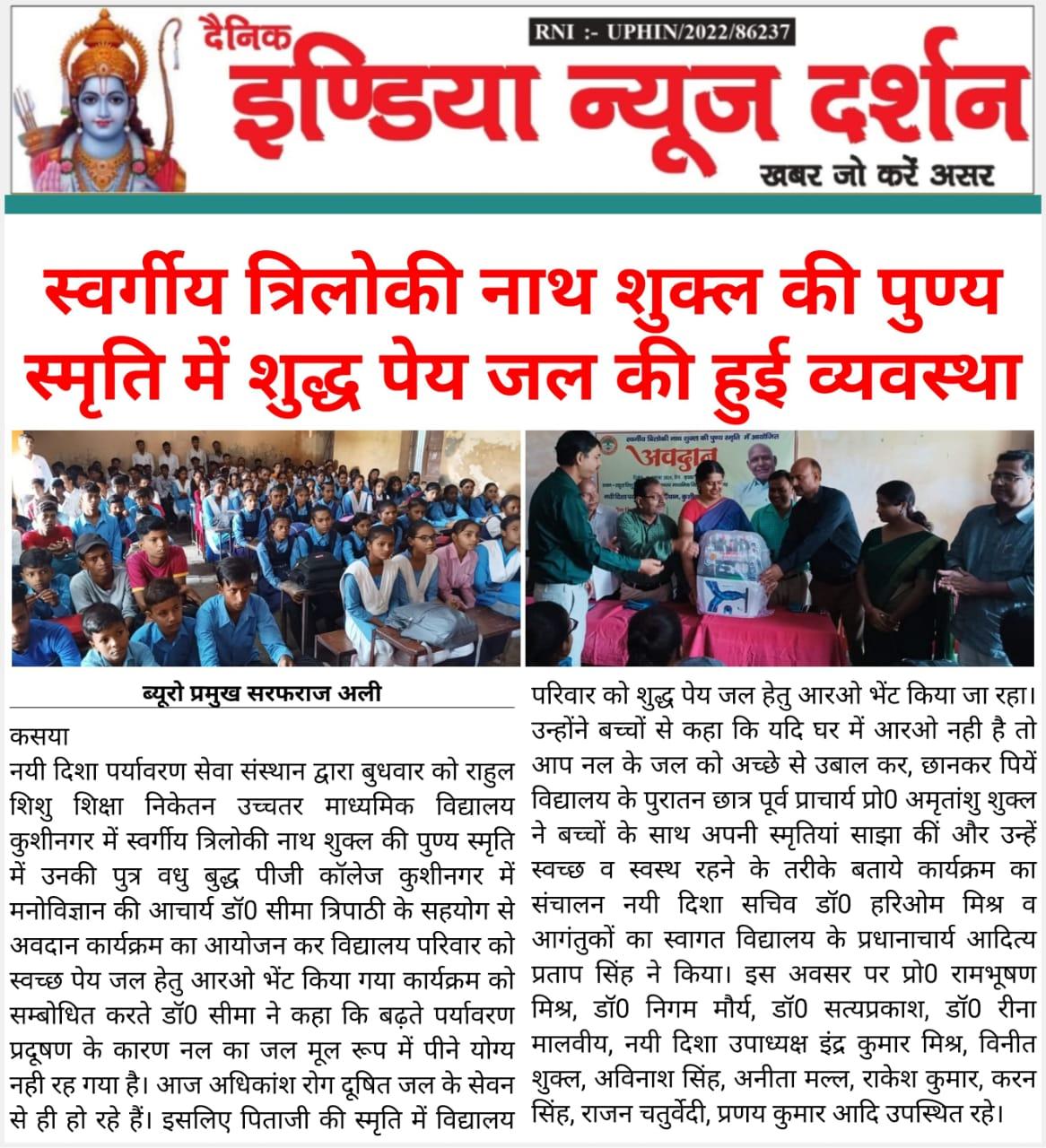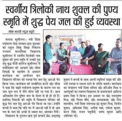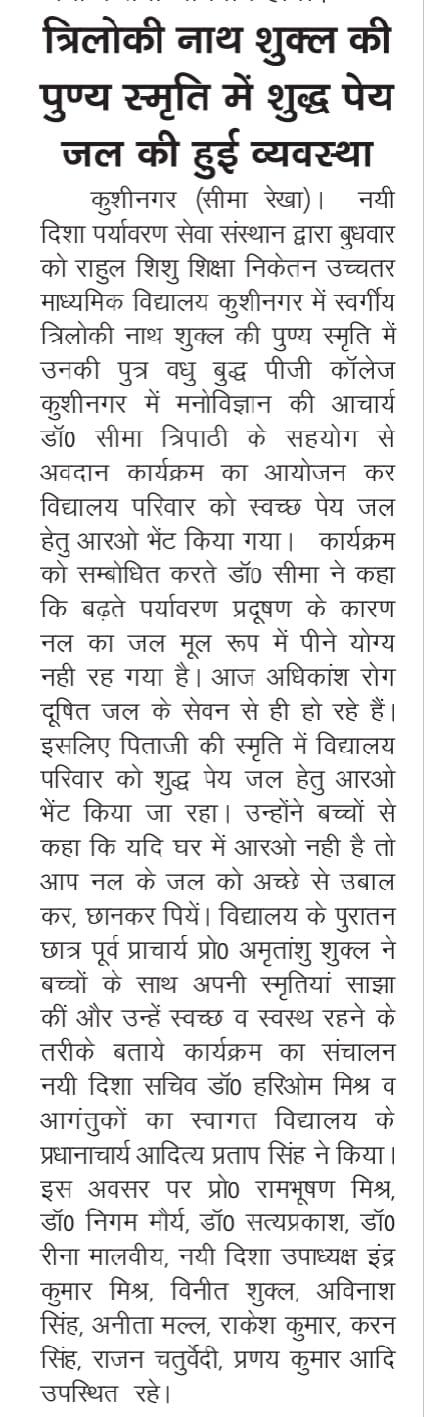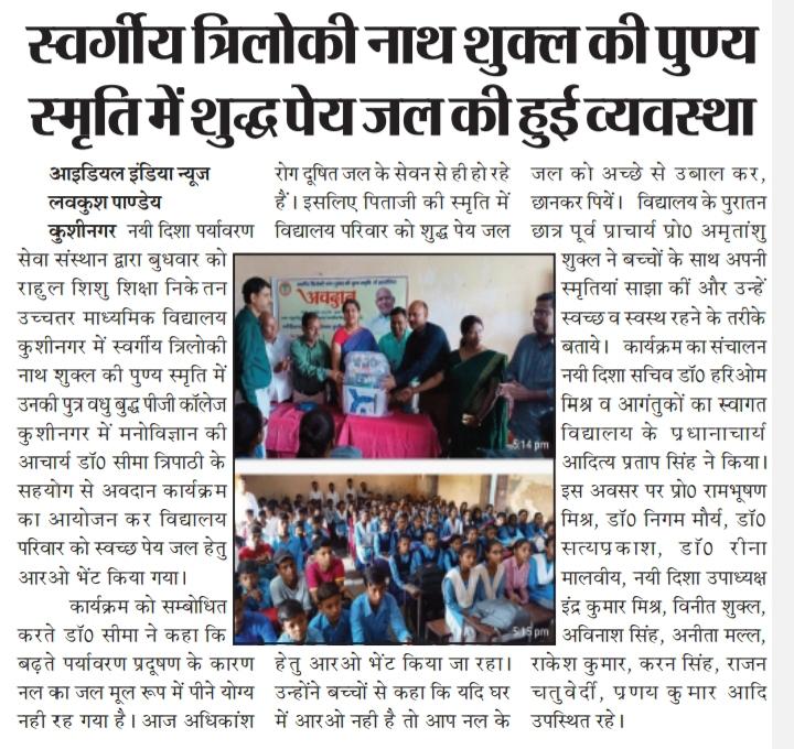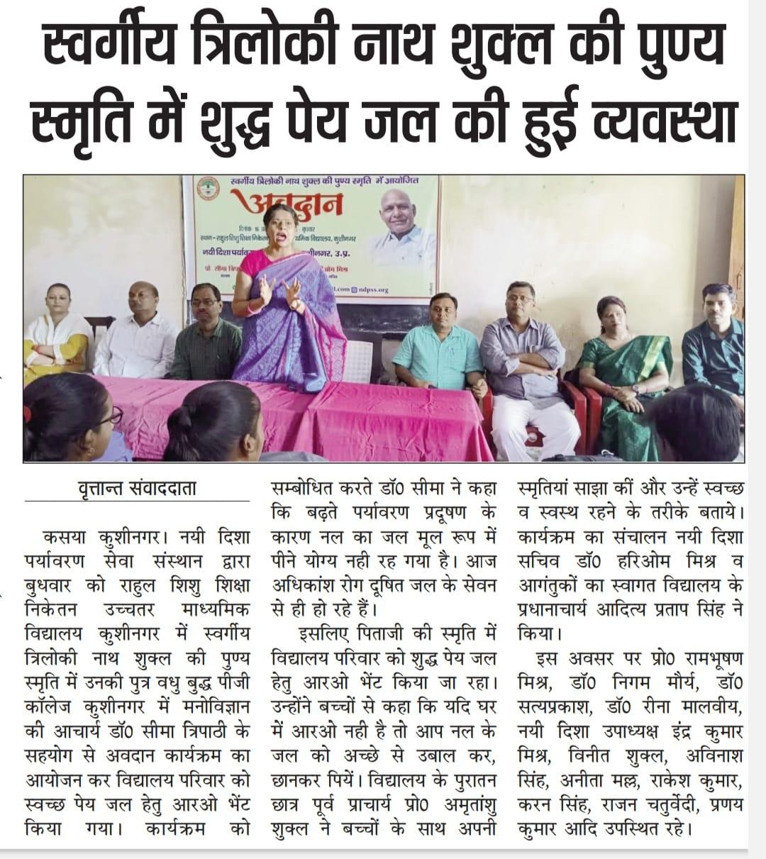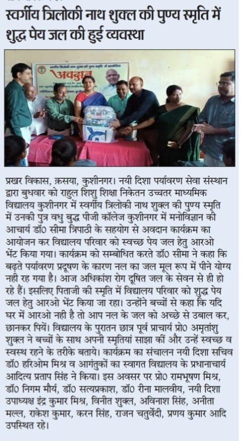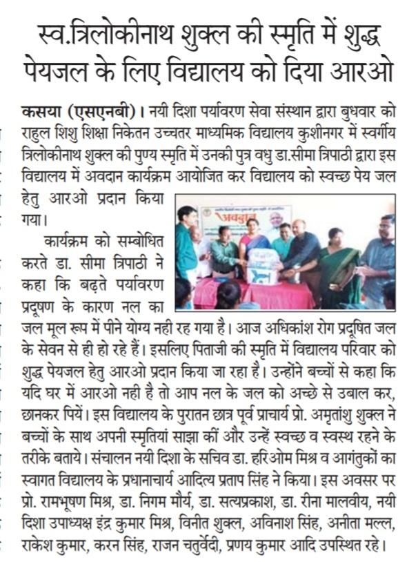 स्वर्गीय त्रिलोकी नाथ शुक्ल जी की पुण्य स्मृति में राहुल शिशु शिक्षा निकेतन उच्चतर माध्यमिक विद्यालय, कुशीनगर में स्वच्छ पेय जल हेतु आरओ भेंट किया गया।