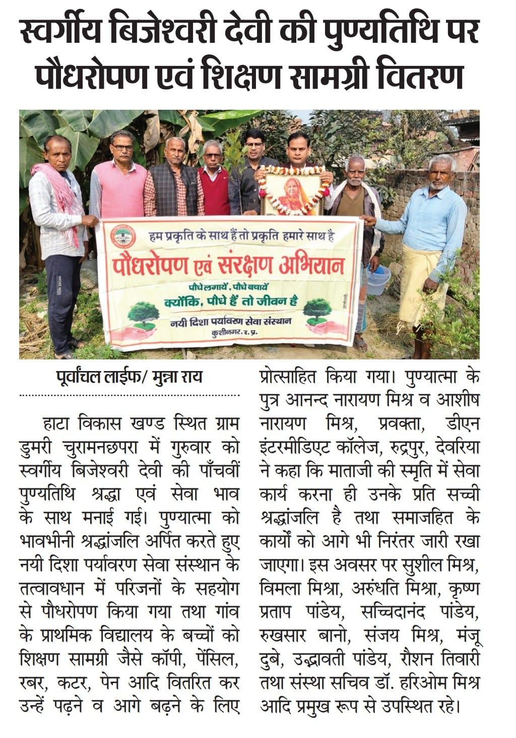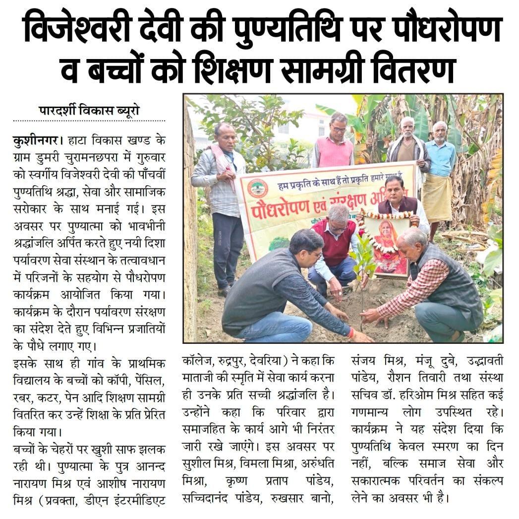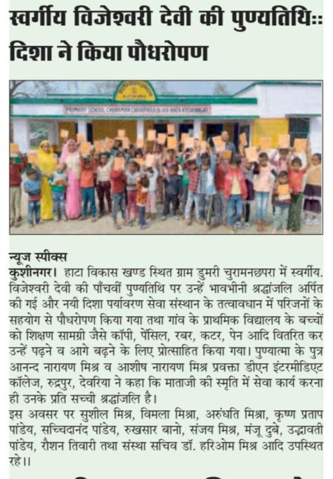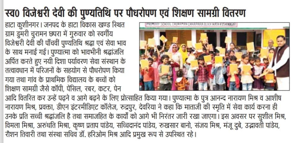 हाटा विकास खण्ड स्थित ग्राम डुमरी चुरामनछपरा में स्वर्गीय विजेश्वरी देवी जी की पाँचवीं पुण्यतिथि श्रद्धा एवं सेवा भाव के साथ मनाते हुए संस्थान के तत्वावधान में परिजनों के सहयोग से पौधरोपण किया गया तथा गांव के प्राथमिक विद्यालय के बच्चों को शिक्षण सामग्री जैसे कॉपी, पेंसिल, रबर, कटर, पेन आदि वितरित कर उन्हें पढ़ने व आगे बढ़ने के लिए प्रोत्साहित किया गया।