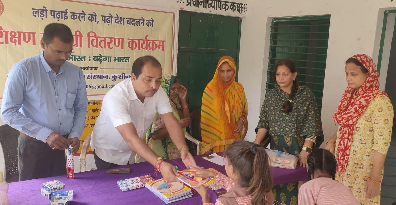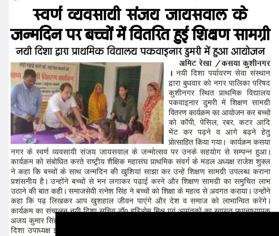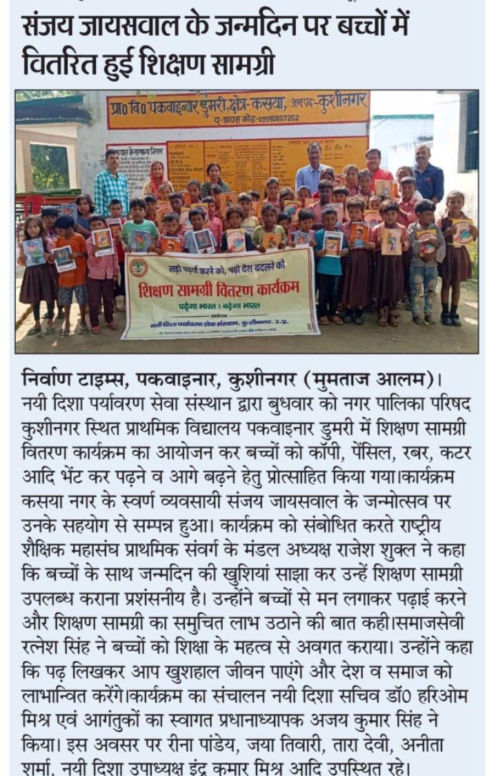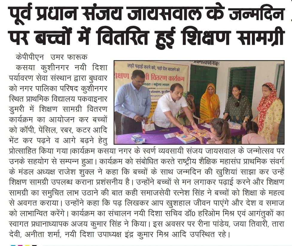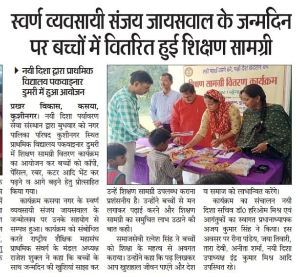 संस्थान द्वारा जरूरतमंद बच्चों की शिक्षा में सहयोगी बनने के क्रम में स्वर्ण व्यवसायी कसया श्री संजय जायसवाल जी के जन्मोत्सव पर उनके सहयोग से नगर पालिका परिषद कुशीनगर स्थित प्राथमिक विद्यालय पकवाइनार डुमरी में शिक्षण सामग्री वितरण कार्यक्रम का आयोजन कर बच्चों को कॉपी, पेंसिल, रबर, कटर आदि भेंट कर पढ़ने व आगे बढ़ने हेतु प्रोत्साहित किया गया।