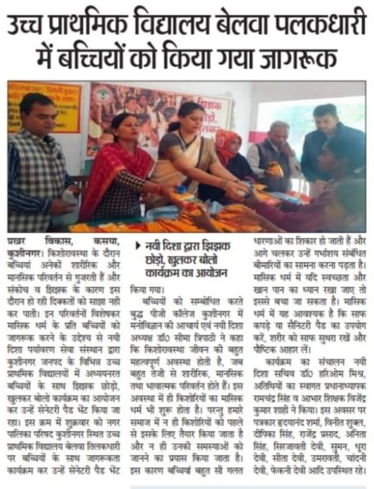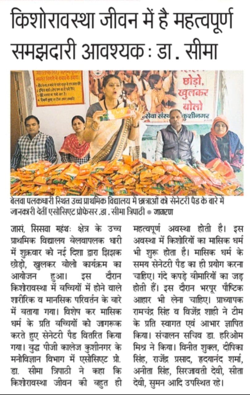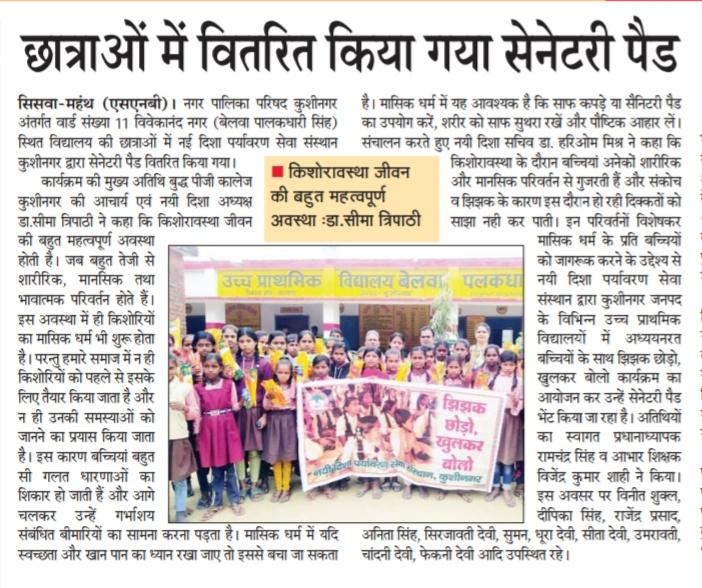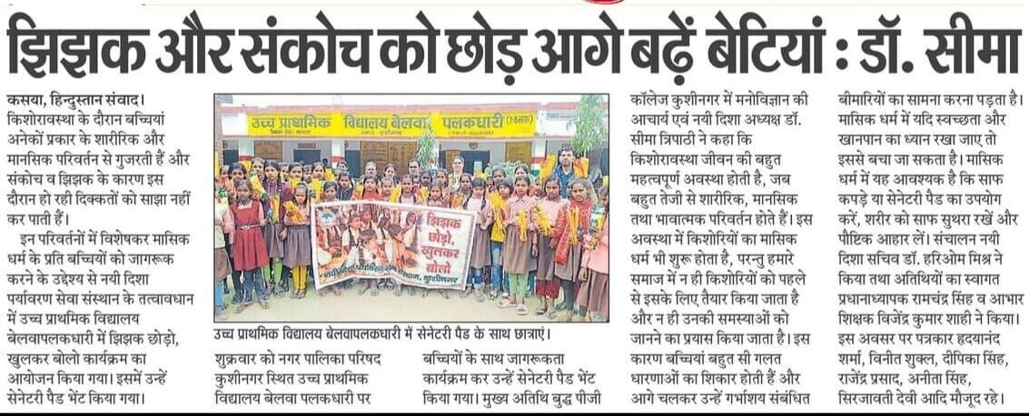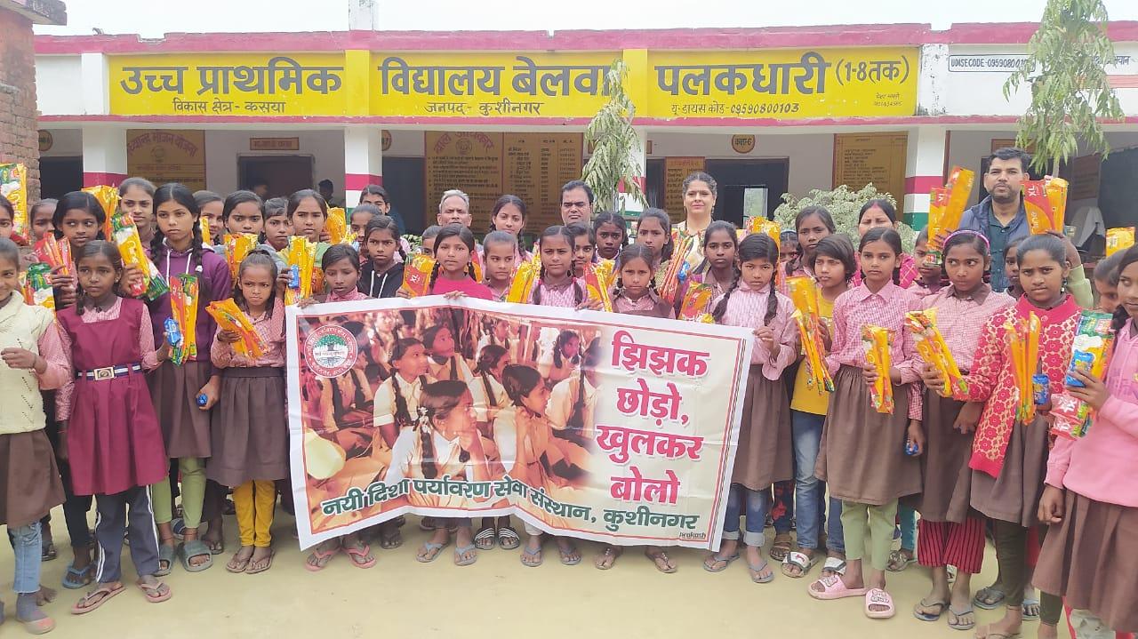 किशोरावस्था के दौरान बच्चियां अनेकों शारीरिक और मानसिक परिवर्तन से गुजरती हैं और संकोच व झिझक के कारण इस दौरान हो रही दिक्कतों को साझा नही कर पाती। इन परिवर्तनों विशेषकर मासिक धर्म के प्रति बच्चियों को जागरूक करने के उद्देश्य से संस्थान द्वारा कुशीनगर जनपद के विभिन्न उच्च प्राथमिक विद्यालयों में अध्ययनरत बच्चियों के साथ "झिझक छोड़ो, खुलकर बोलो" कार्यक्रम का आयोजन कर उन्हें सेनेटरी पैड भेंट किया जा रहा। इस क्रम में नगर पालिका परिषद कुशीनगर स्थित उच्च प्राथमिक विद्यालय बेलवा तिलकधारी पर बच्चियों के साथ जागरूकता कार्यक्रम कर उन्हें सेनेटरी पैड भेंट किया गया।