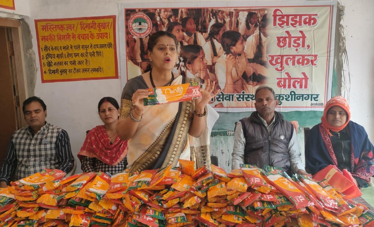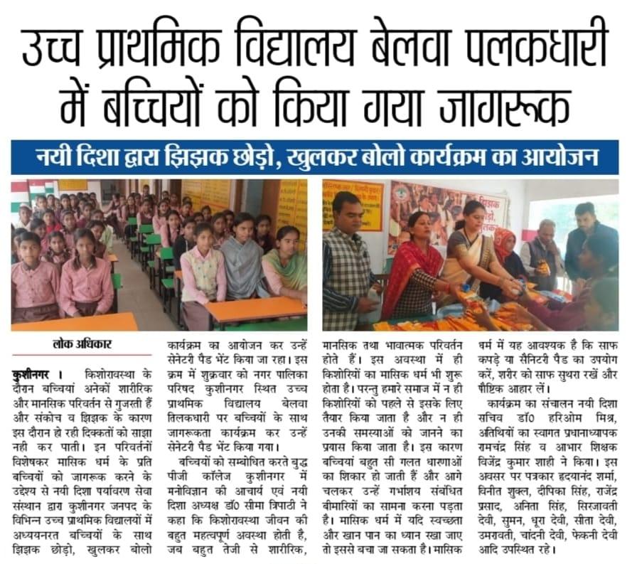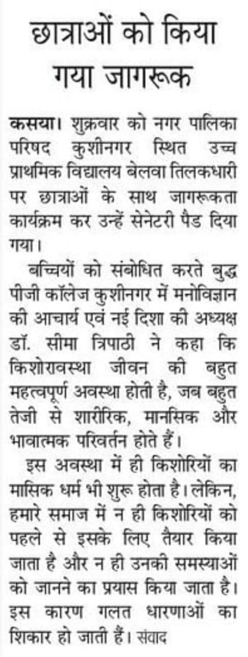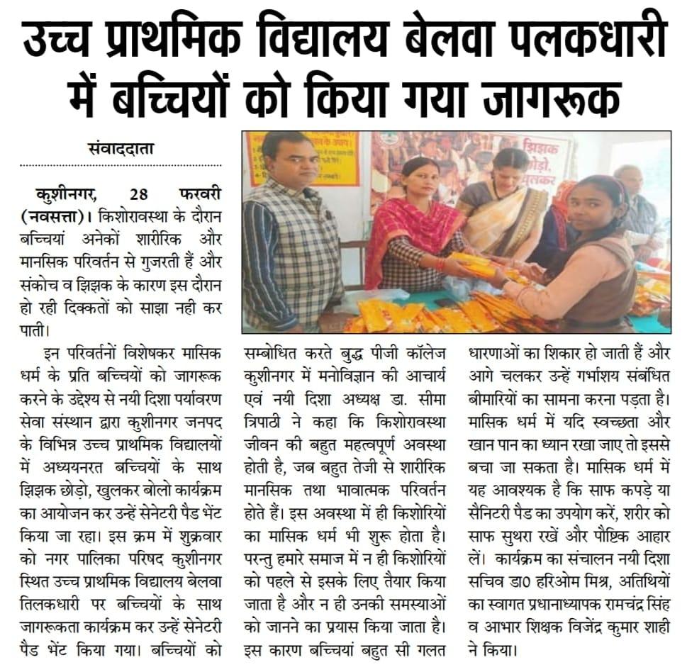 किशोरावस्था के दौरान बच्चियां अनेकों शारीरिक और मानसिक परिवर्तन से गुजरती हैं और संकोच व झिझक के कारण इस दौरान हो रही दिक्कतों को साझा नही कर पाती। इन परिवर्तनों विशेषकर मासिक धर्म के प्रति बच्चियों को जागरूक करने के उद्देश्य से संस्थान द्वारा कुशीनगर जनपद के विभिन्न उच्च प्राथमिक विद्यालयों में अध्ययनरत बच्चियों के साथ "झिझक छोड़ो, खुलकर बोलो" कार्यक्रम का आयोजन कर उन्हें सेनेटरी पैड भेंट किया जा रहा। इस क्रम में नगर पालिका परिषद कुशीनगर स्थित उच्च प्राथमिक विद्यालय बेलवा तिलकधारी पर बच्चियों के साथ जागरूकता कार्यक्रम कर उन्हें सेनेटरी पैड भेंट किया गया।