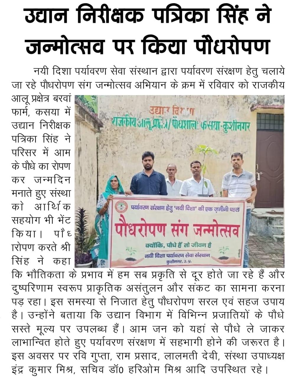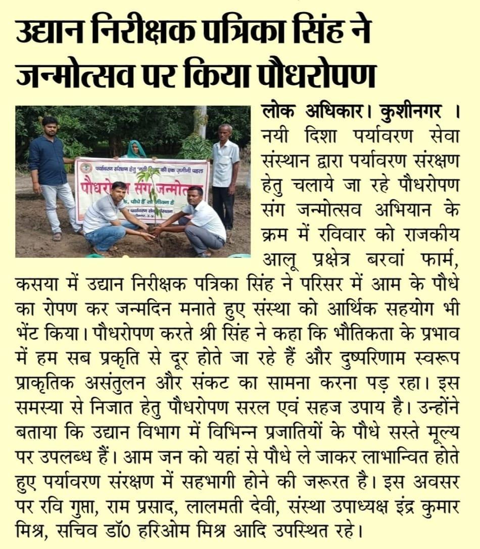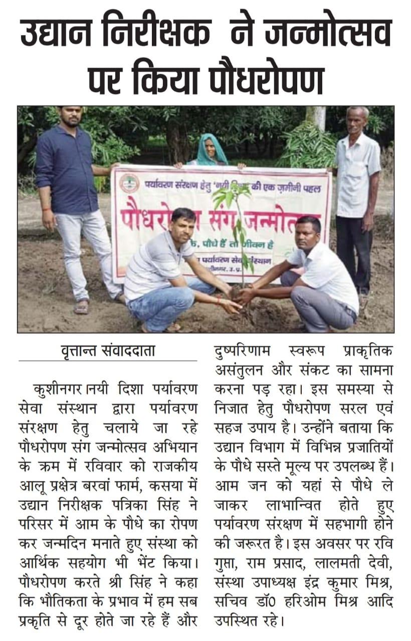 संस्थान द्वारा पर्यावरण संरक्षण हेतु चलाये जा रहे पौधरोपण संग जन्मोत्सव अभियान के क्रम में राजकीय आलू प्रक्षेत्र/ पौधशाला, बरवां फार्म, कसया में उद्यान निरीक्षक श्री पत्रिका सिंह ने परिसर में आम के पौधे का रोपण कर जन्मदिन मनाते हुए संस्था को आर्थिक सहयोग भी भेंट किया।