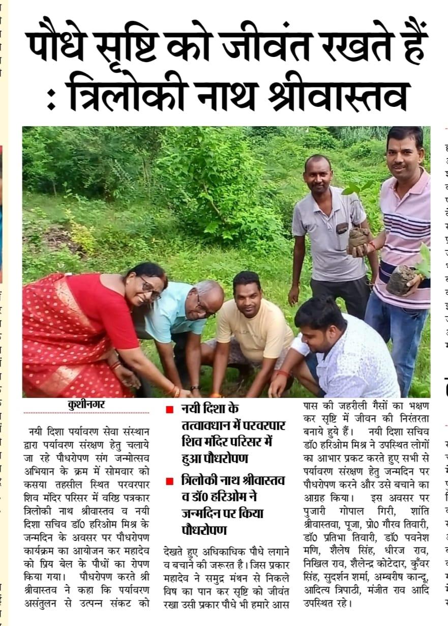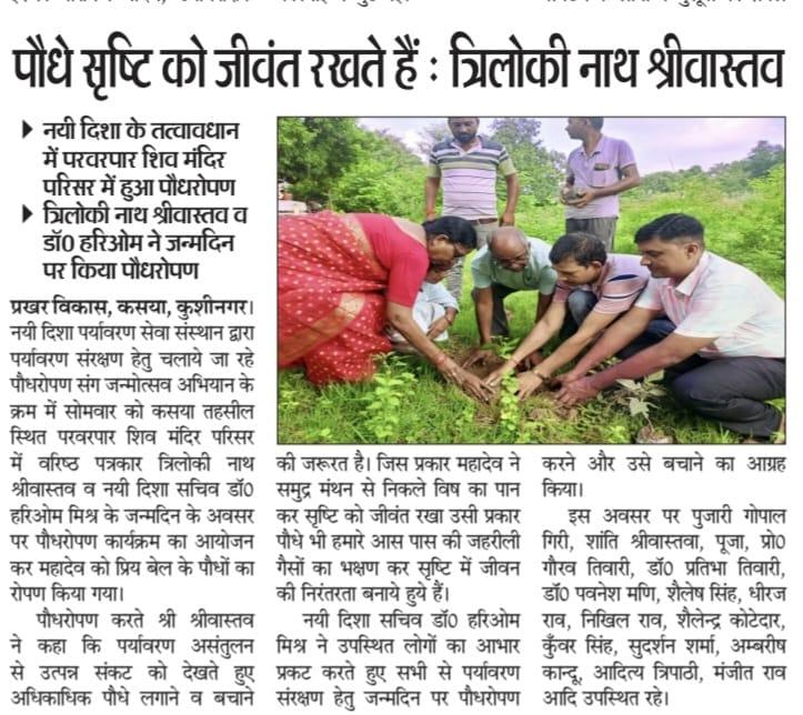 संस्थान द्वारा पर्यावरण संरक्षण हेतु चलाये जा रहे पौधरोपण संग जन्मोत्सव अभियान के क्रम में कसया तहसील स्थित परवरपार शिव मंदिर परिसर में वरिष्ठ पत्रकार व अधिवक्ता श्री त्रिलोकी नाथ श्रीवास्तव व नयी दिशा सचिव डॉ0 हरिओम मिश्र के जन्मदिन के अवसर पर पौधरोपण कार्यक्रम का आयोजन कर महादेव को प्रिय बेल के पौधों का रोपण किया गया।