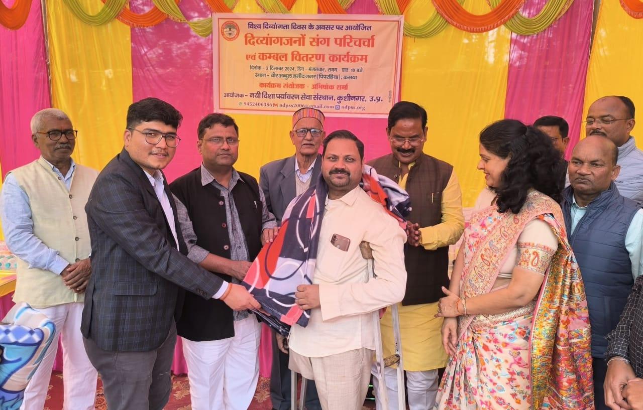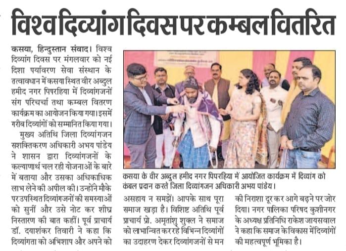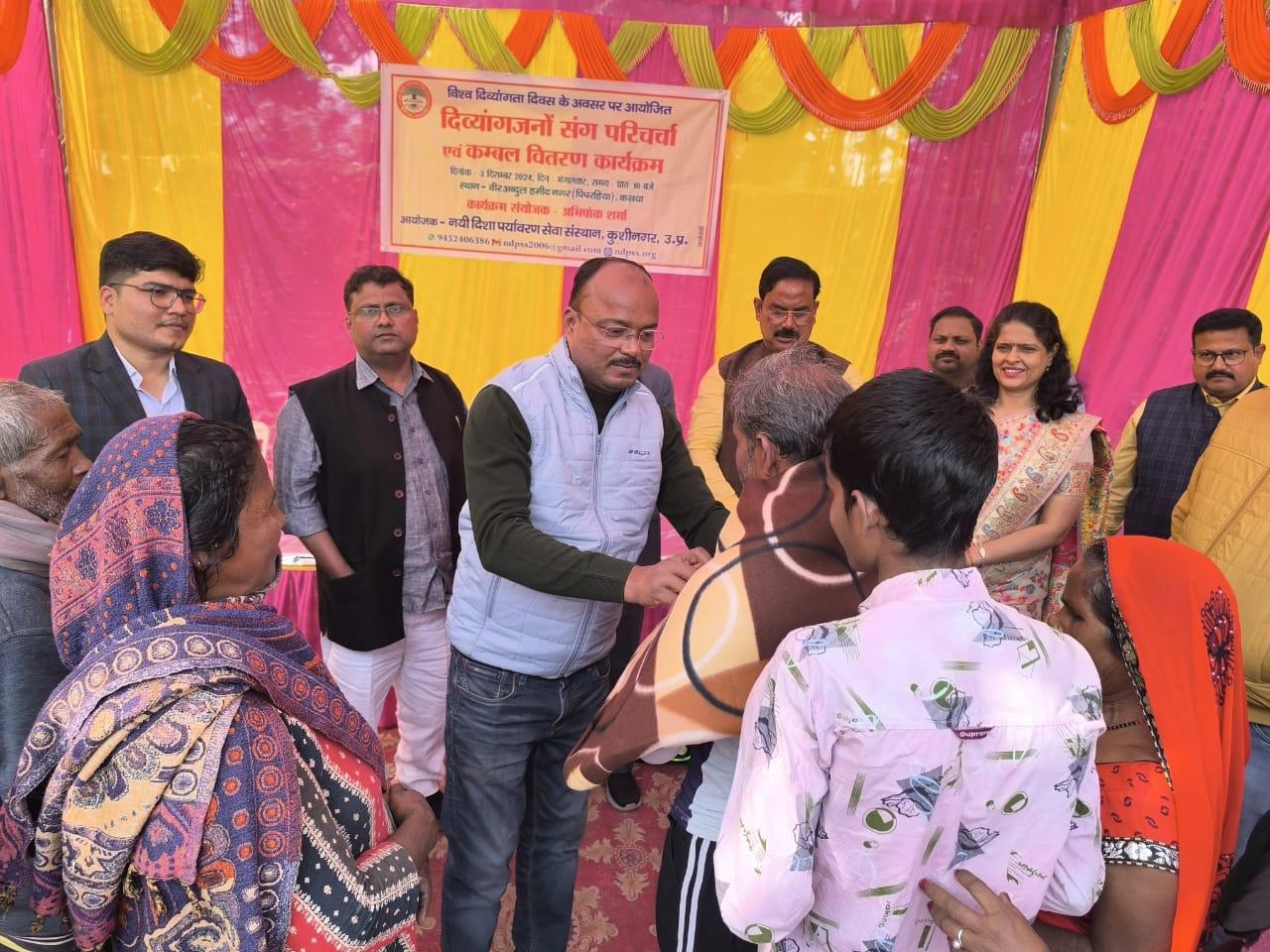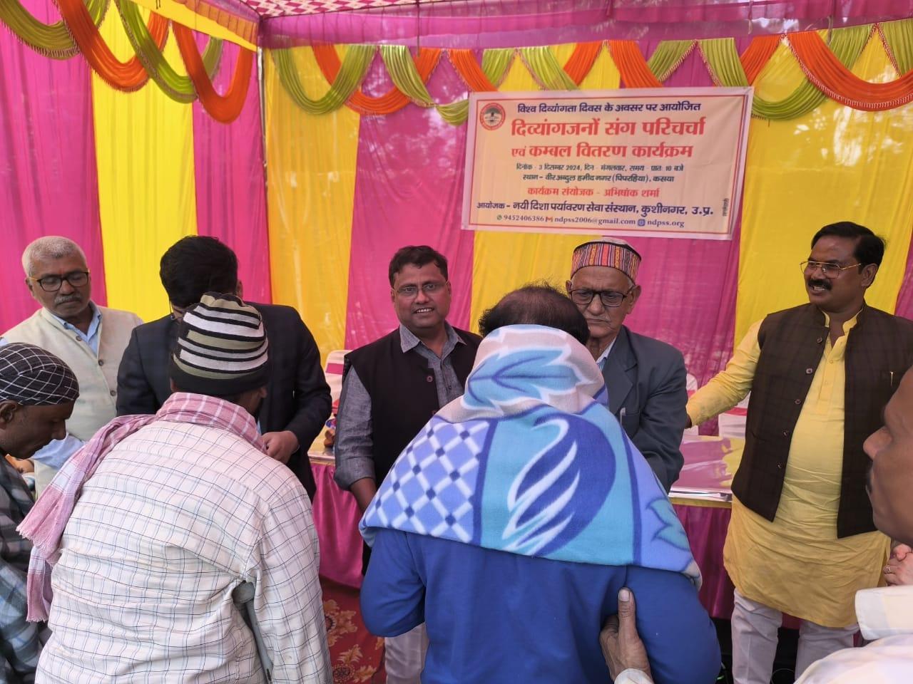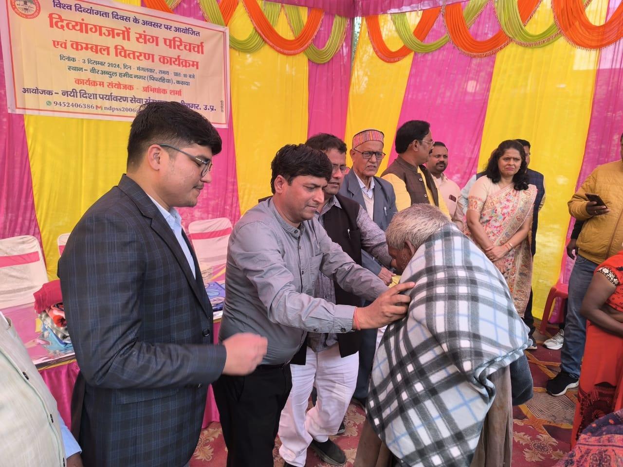 विश्व दिव्यांग दिवस के अवसर पर संस्थान द्वारा कसया नगर स्थित वीर अब्दुल हमीद नगर पिपरहिया में दिव्यांगजनों संग परिचर्चा एवं कम्बल वितरण कार्यक्रम का आयोजन किया गया। कार्यक्रम में अतिथि के रूप में उपस्थित जिला दिव्यांगजन सशक्तिकरण अधिकारी श्री अभय पांडेय ने शासन द्वारा दिव्यांगजनों के कल्याणार्थ चल रही योजनाओं को बताया और उसका अधिकाधिक लाभ लेने की अपील की। उन्होंने मौके पर उपस्थित दिव्यांगजनों की समस्याओं को सुना और उसे नोट कराकर शीघ्र निस्तारण की बात कही।